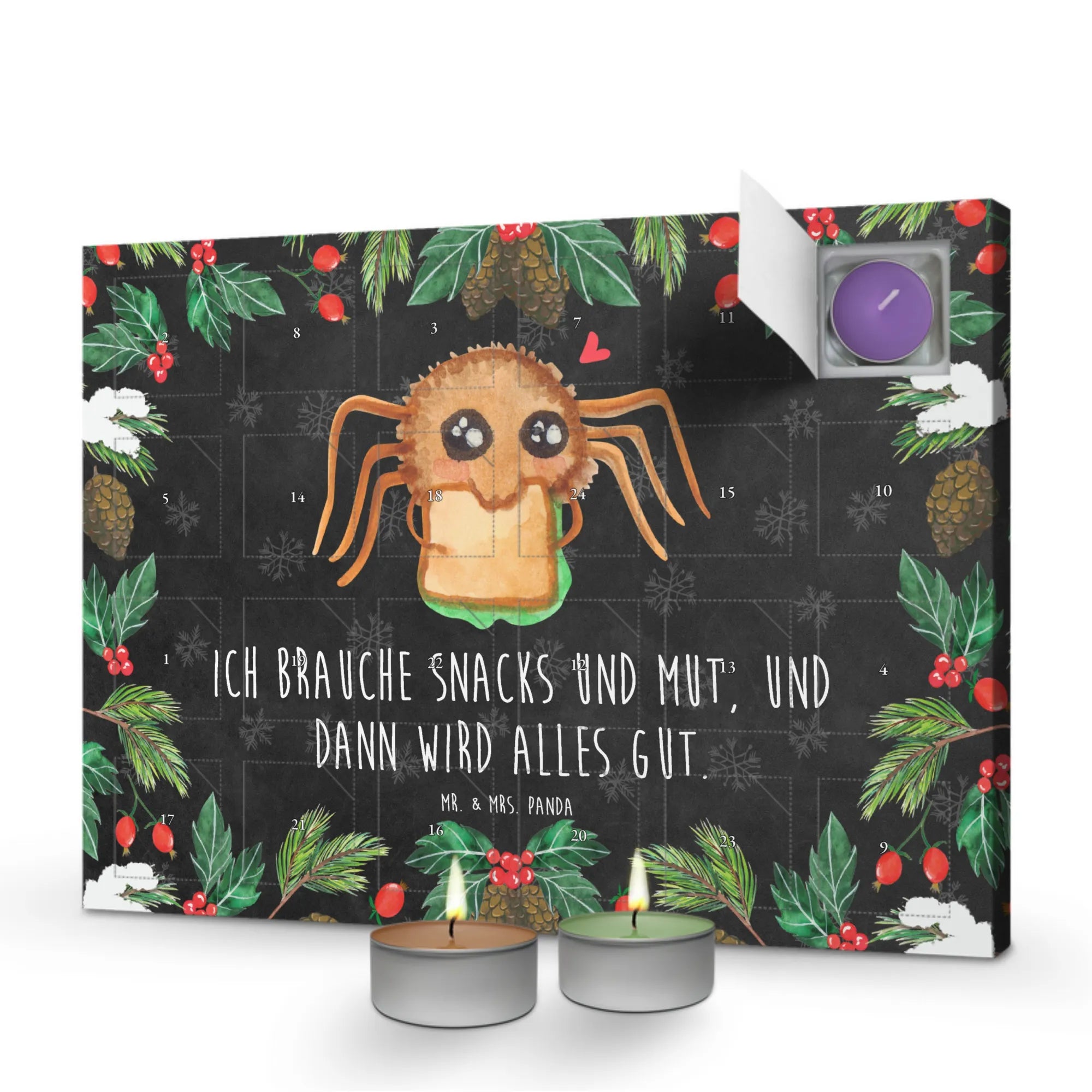 Der Duftkerzen Adventskalender mit dem bezaubernden Motiv 'Spinne Agathe Sandwich' aus der Kollektion von Mr. & Mrs. Panda ist das perfekte Geschenk für alle, die den Advent voller Freude und mit einem Hauch von Humor erleben möchten.