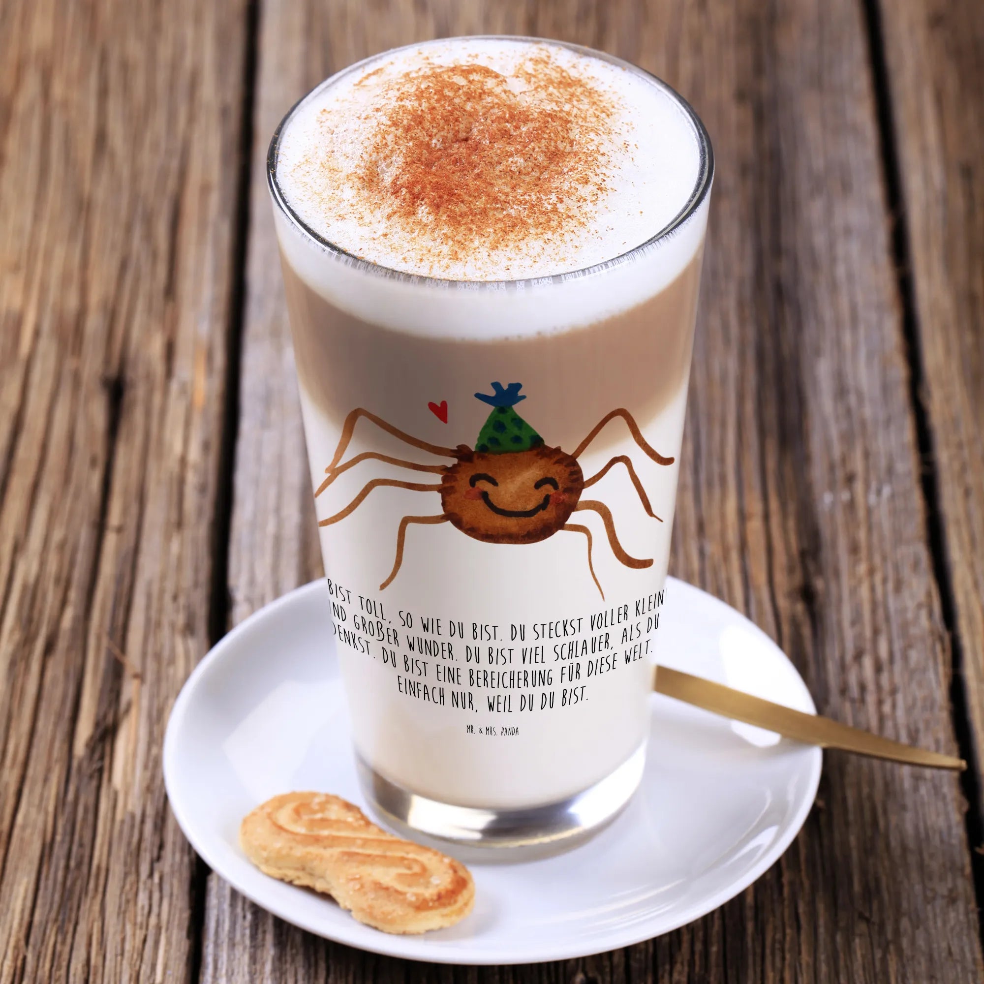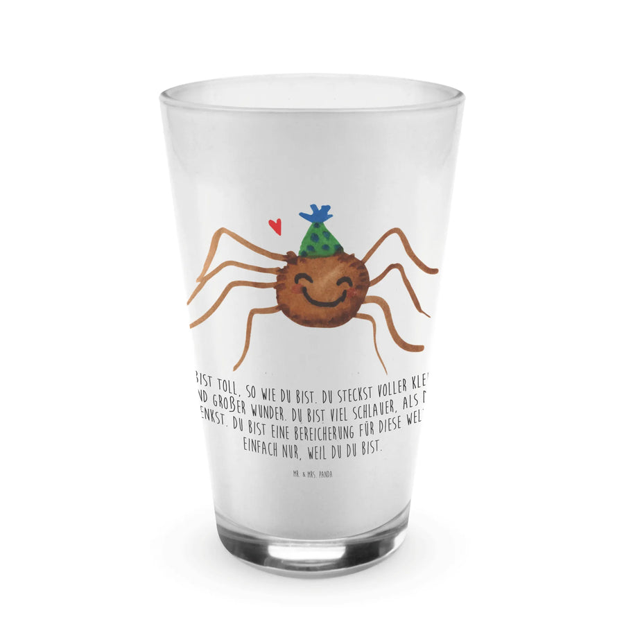 Das edle Cappuccino Glas "Spinne Agathe Party" von Mr. & Mrs. Panda ist die perfekte Geschenkidee für all jene, die Lebensfreude und Selbstliebe zelebrieren möchten.