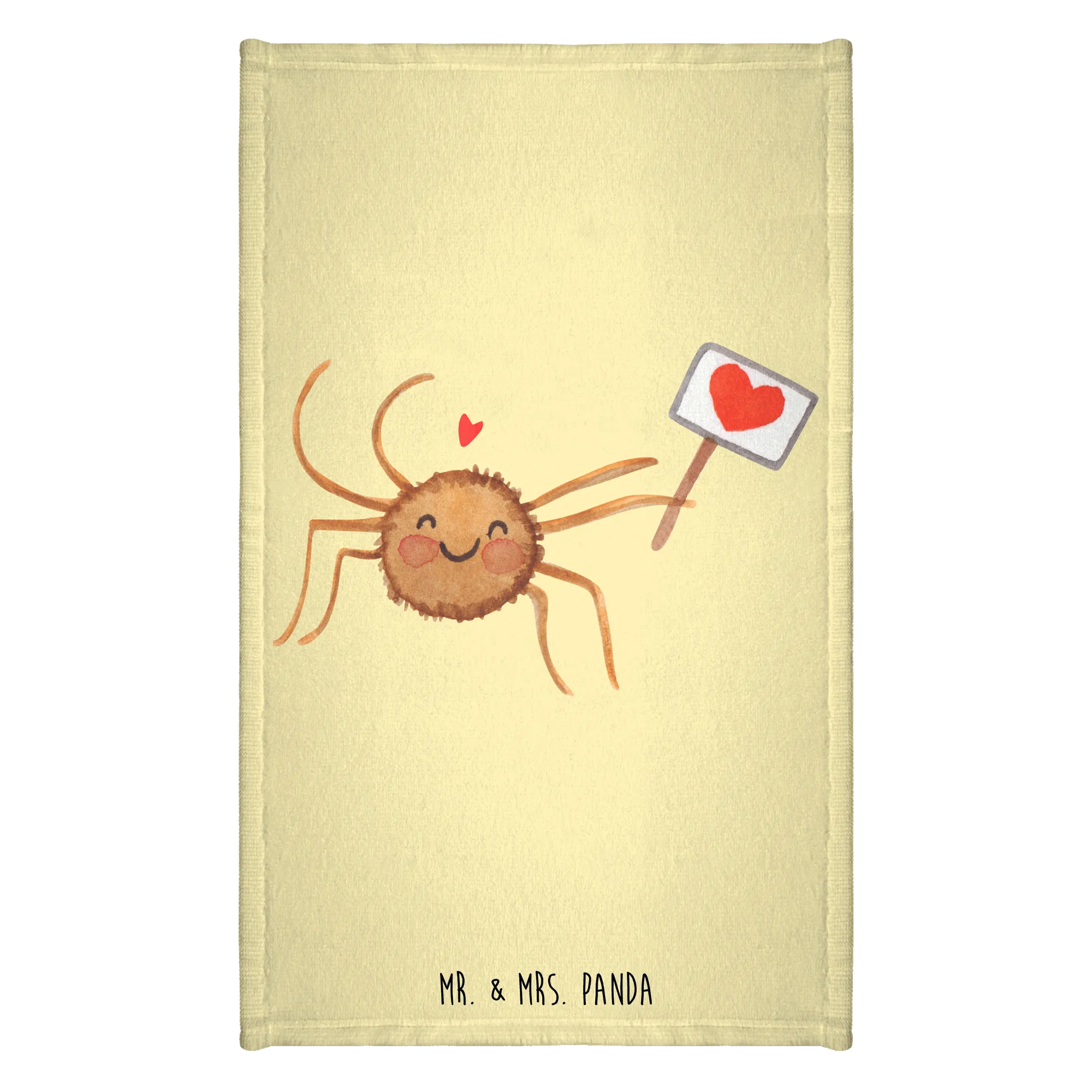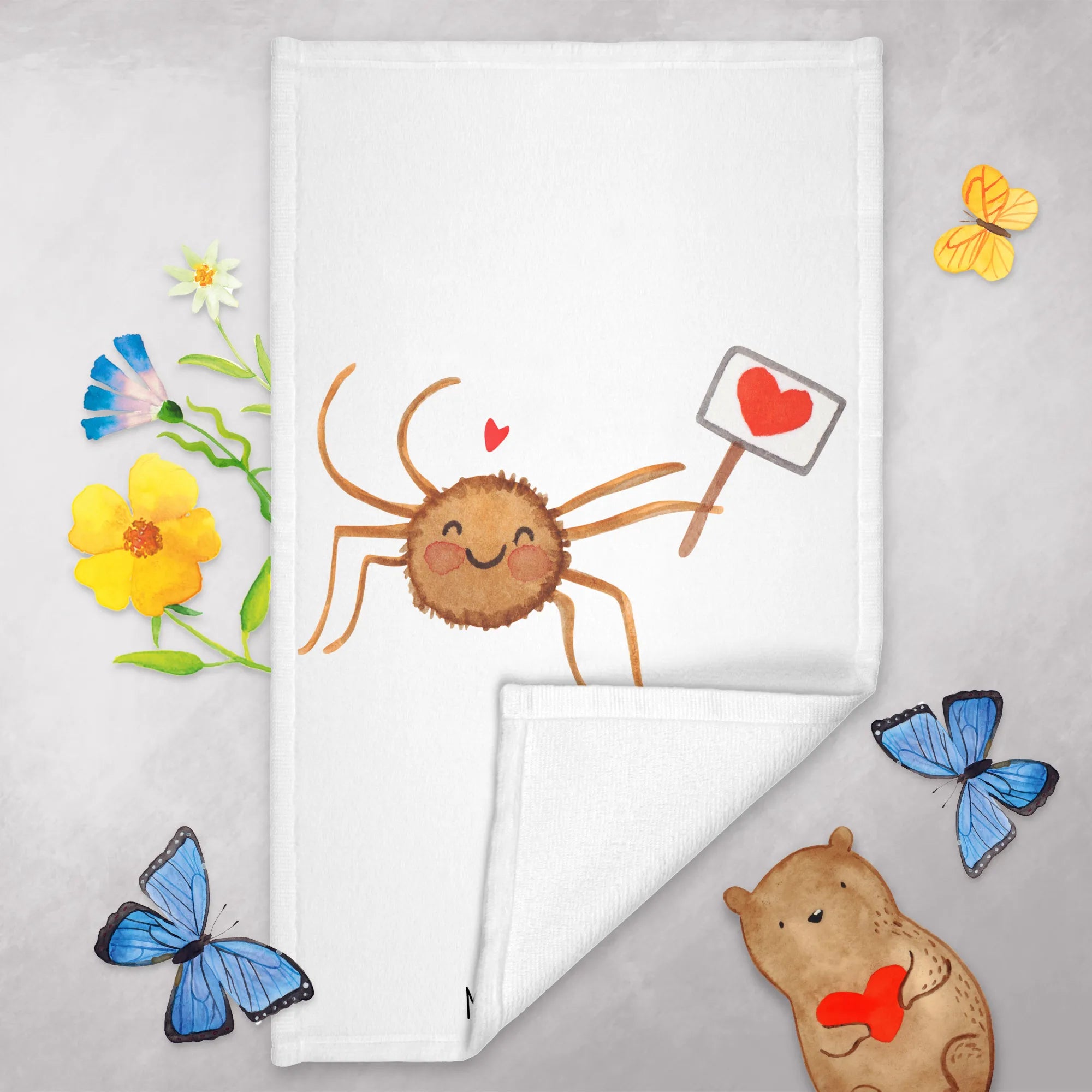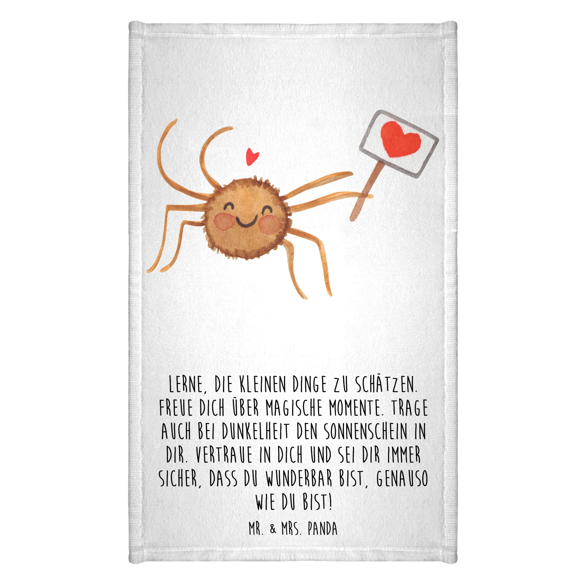 Das bezaubernde Gästehandtuch Spinne Agathe Motivation aus der Kollektion Spinne Agathe von Mr. & Mrs. Panda ist nicht nur ein praktischer Begleiter, sondern auch eine Quelle der Inspiration und des Glücks. Mit seinem einzigartigen Design, das die fröhliche Spinne Agathe zeigt, die ein Herzschild hält und leuchtend lächelt, bringt es Farbe und Freude in jedes Badezimmer.