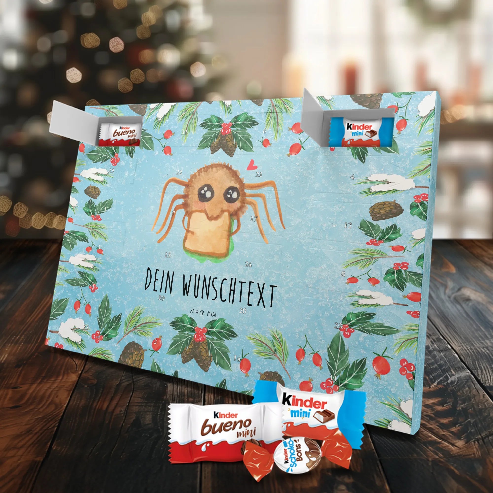 Fröhlich, persönlich und süß – unser Personalisierter Schoko Adventskalender von Mr. & Mrs. Panda bringt Wärme in die Adventszeit. Der Kalender ist liebevoll bedruckt mit wunderschönen Motiven & Sprüchen von Mr. & Mrs. Panda und lässt sich mit deinem Wunschnamen oder Wunschtext personalisieren, sodass jedes Türchen eine kleine, persönliche Überraschung wird. Die brillante Druckqualität in Kombination mit seidenmatter Oberflächenveredelung verleiht dem Kalender eine hochwertige Haptik. Auch die Seitenflächen sind bedruckt, damit dein Geschenk von allen Seiten überzeugt. Maße: 355 mm x 245 mm x 11 mm – praktisch und stilvoll. Besonderheit: kann aufgehängt oder aufgestellt werden, perfekt für Fensterbank, Kommode oder als Dekoration an der Wand. Gefüllt mit kinder® Schokolade: Adventskalender gefüllt mit kinder® Schokolade; Inhalt: kinder® Schoko-Bons, kinder® Bueno mini und kinder® Schokolade mini. Ob als Geschenk für die Liebsten oder als süße Belohnung für dich selbst – dieser Adventskalender verbindet tolles Design mit leckerem Inhalt und persönlicher Note.