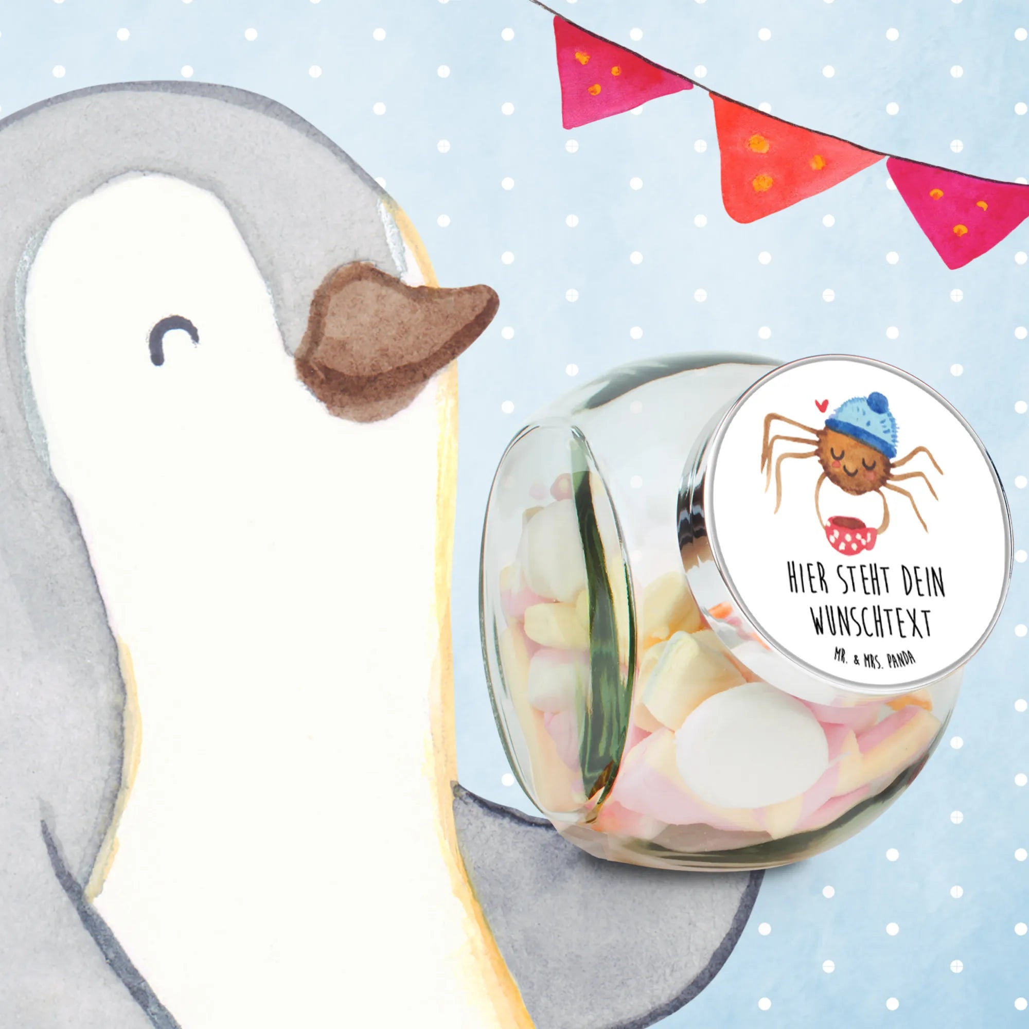 Die Spinne Agathe Kollektion von Mr. & Mrs. Panda ist mit viel Liebe und Aquarellzeichnungen entstanden und verbindet niedliche Designs mit positiven Lebensweisheiten. Verschenke Freude und mache jeden Tag zu etwas Besonderem mit diesem charmanten Bonbonglas.