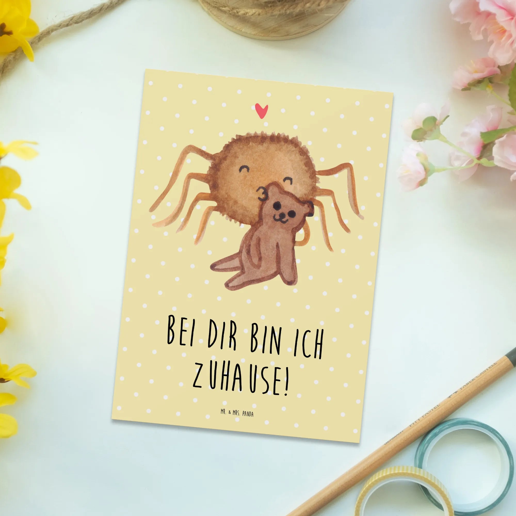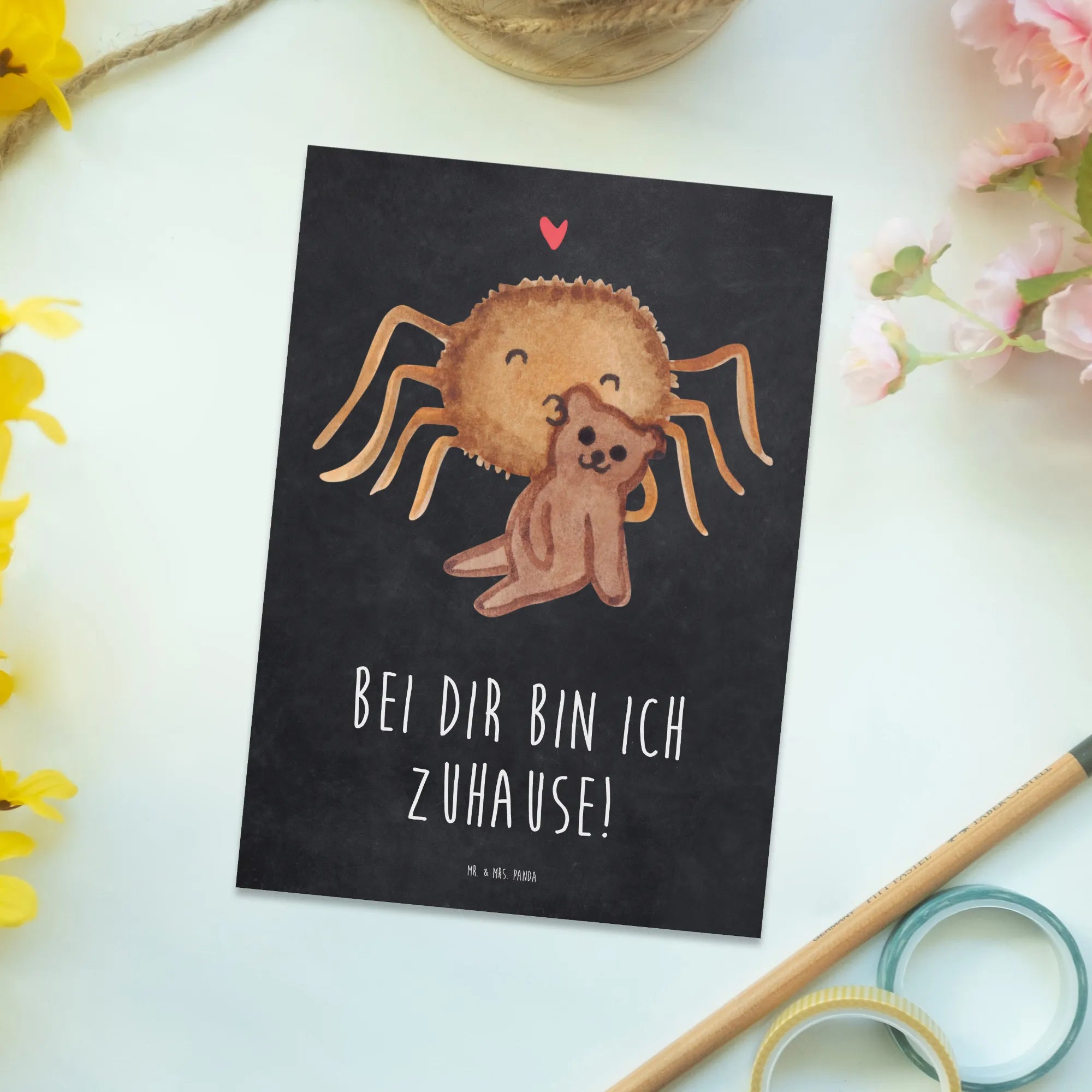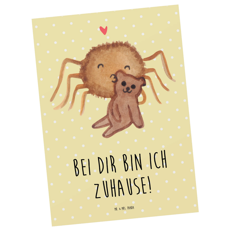 Die Postkarte mit dem zauberhaften Motiv „Spinne Agathe Teddy“ von Mr. & Mrs. Panda ist das perfekte Geschenk für deine Liebsten! Diese einzigartige Karte ist nicht nur mit einem niedlichen Design von der talentierten Mrs. Panda bedruckt, sondern auch mit einem süßen Spruch "Bei dir bin ich zuhause!". Sie eignet sich wunderbar für zahlreiche Anlässe, sei es zum Geburtstag, als Dankeschön oder einfach nur so, um deinen Freunden und deiner Familie eine Freude zu bereiten.