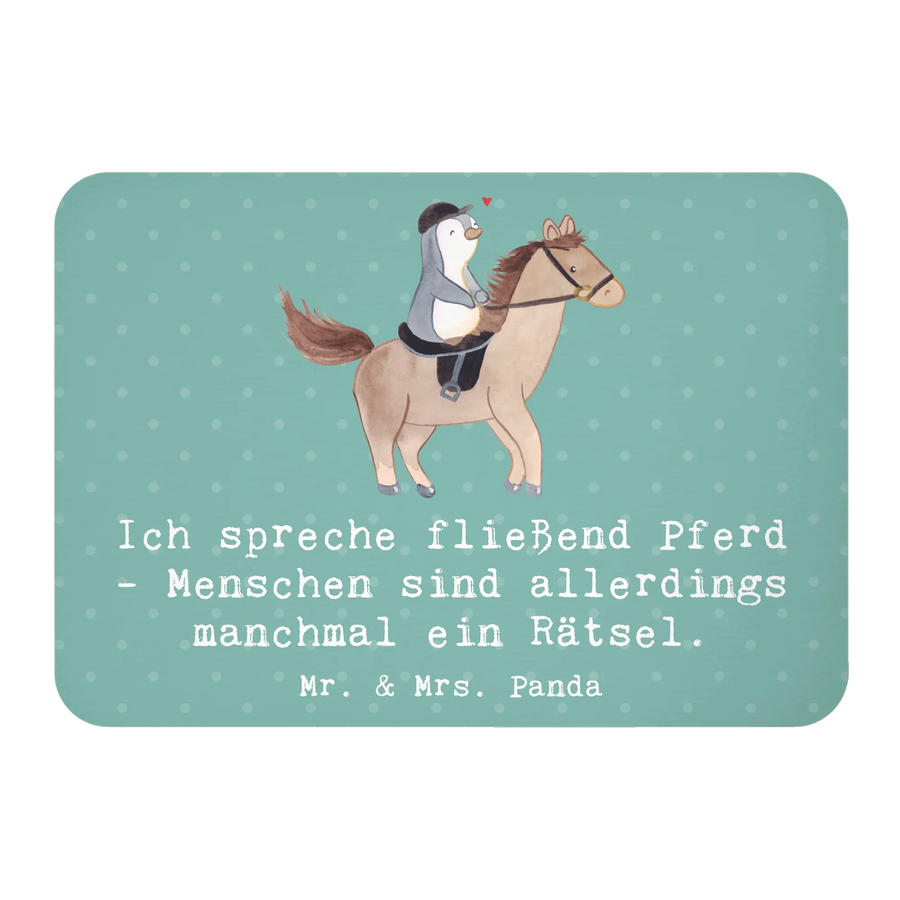 Ein Kühlschrankmagnet von Mr. & Mrs. Panda für alle Pferdeliebhaber und Sportenthusiasten! Dieser wunderschöne Magnet trägt das liebevoll gestaltete Motiv "Reiten" und den humorvollen Spruch "Ich spreche fließend Pferd - Menschen sind allerdings manchmal ein Rätsel." Mit seinen kompakten Maßen von 52 mm x 74 mm x 5 mm und einem Gewicht von nur 20 g ist er der perfekte Begleiter für deinen Kühlschrank oder dein Whiteboard.