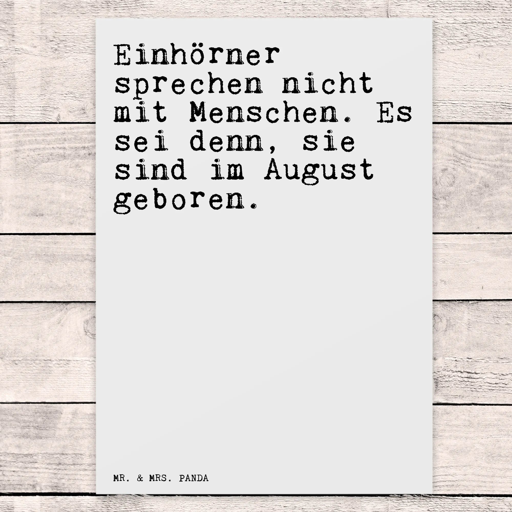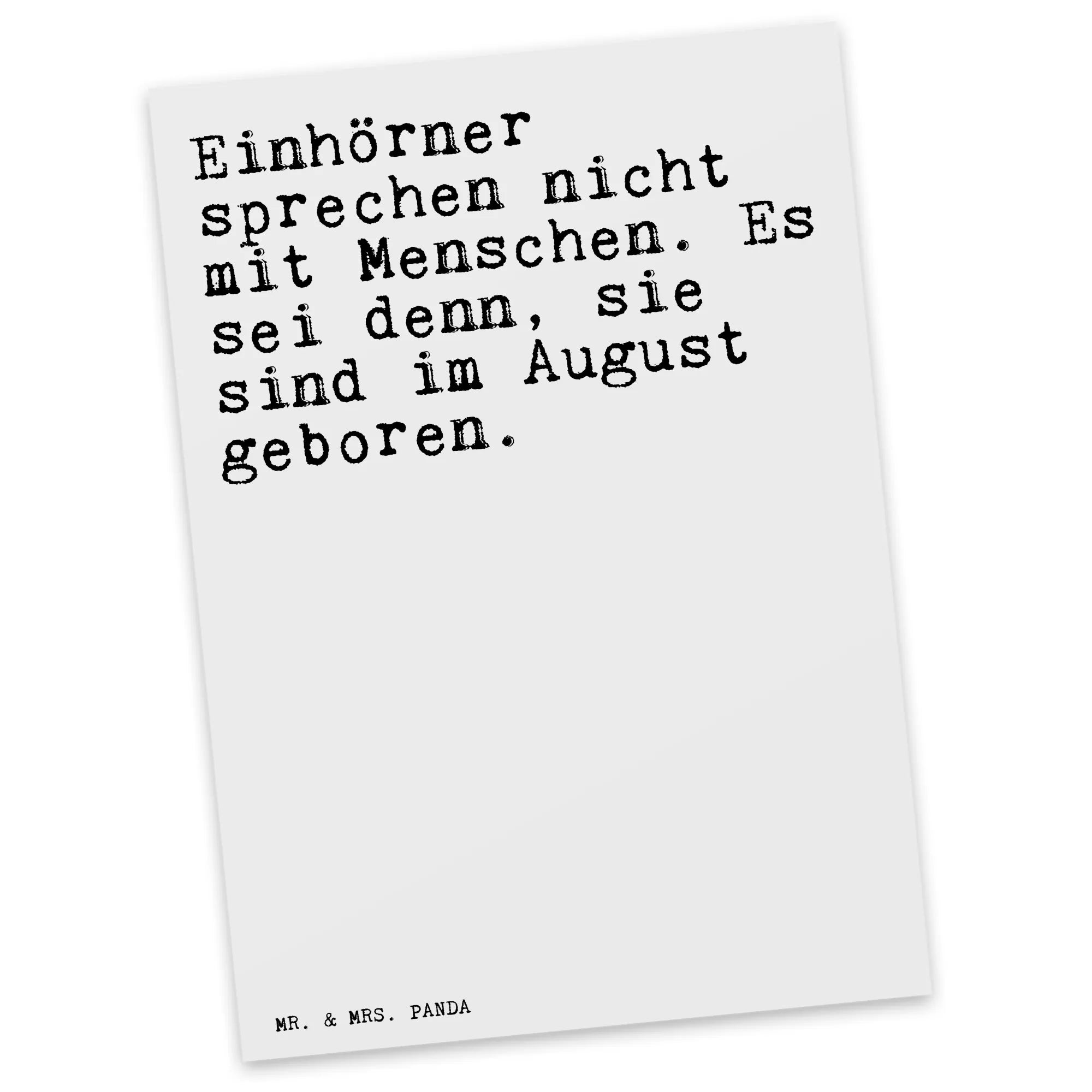 Entdecke unsere einzigartige Postkarte "Einhörner sprechen nicht mit Menschen. Es sei denn, sie sind im August geboren." von Mr. & Mrs. Panda. Diese Karte ist nicht nur ein echter Hingucker, sie bringt auch ein Lächeln auf die Gesichter deiner Freunde und Familie. Sie eignet sich perfekt als Geburtstag