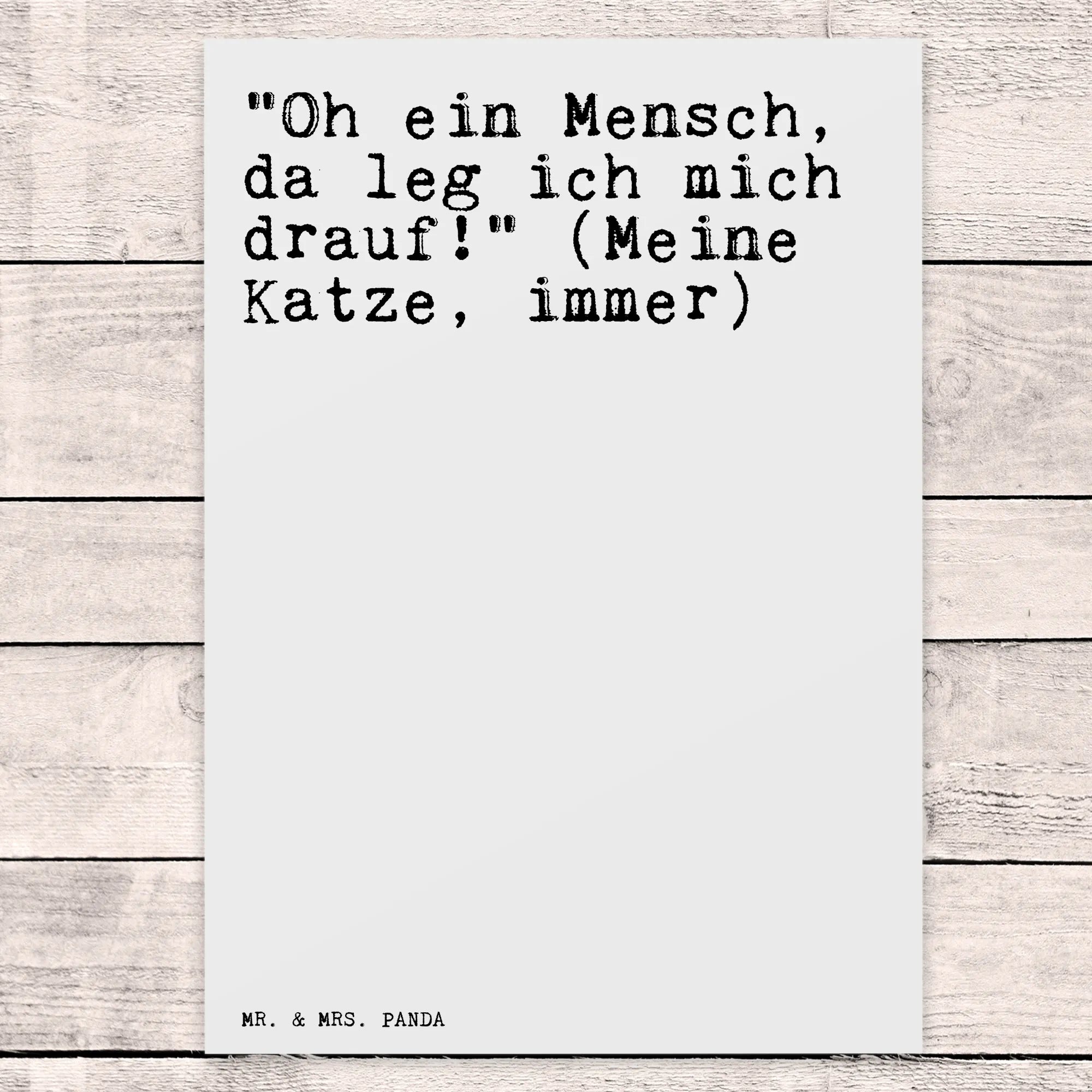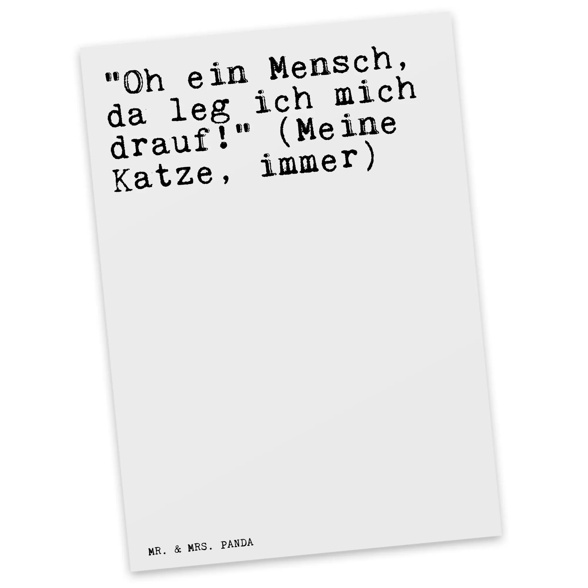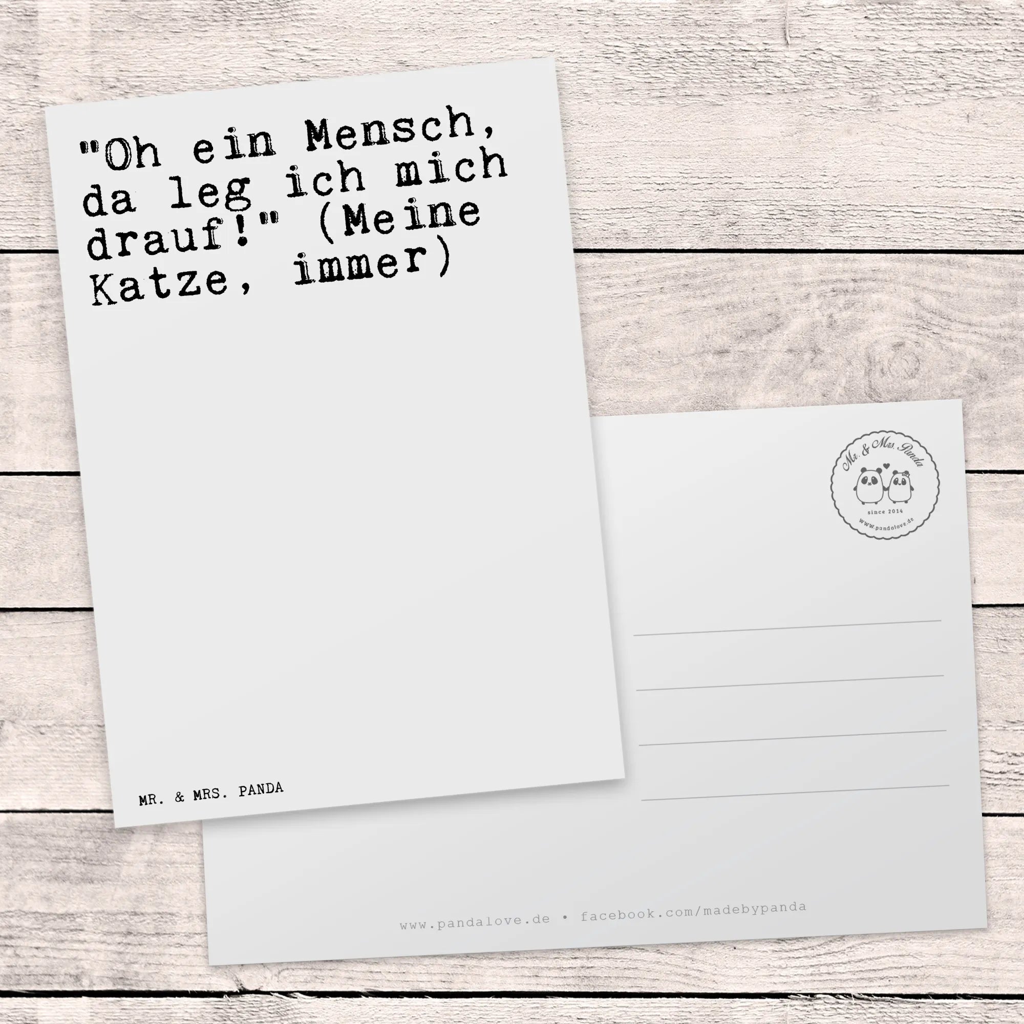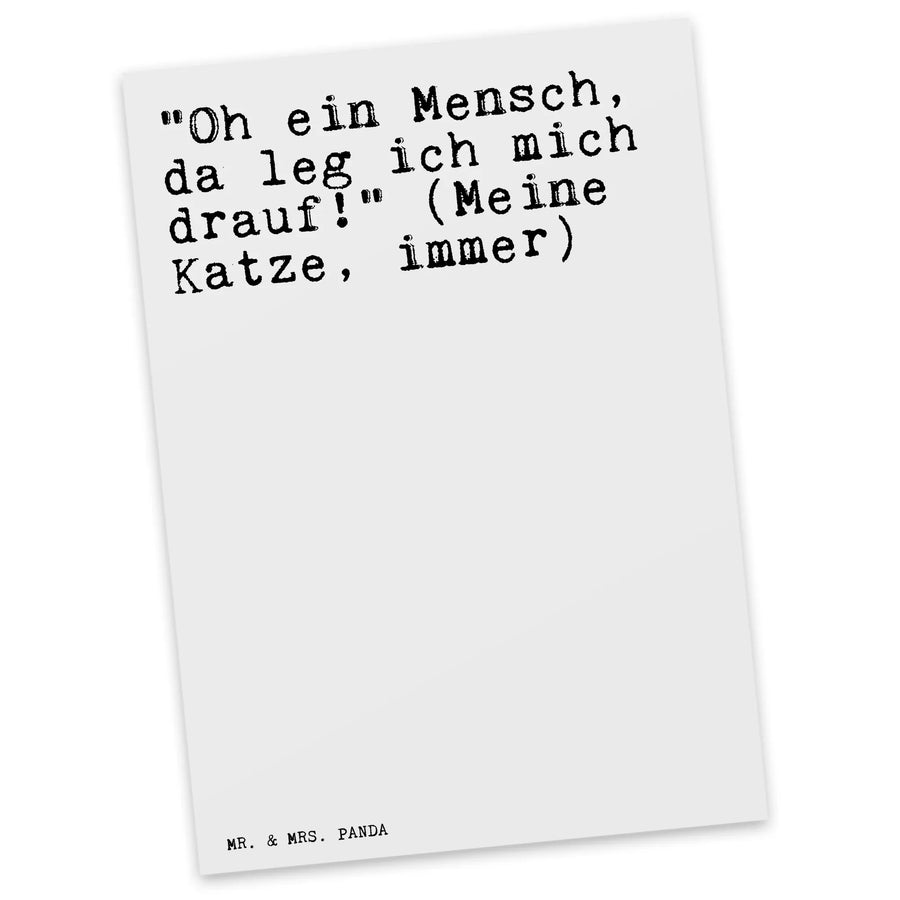 Diese niedliche Postkarte mit dem charmanten Spruch "Oh ein Mensch, da leg ich mich drauf!" aus der Kollektion von Mr. & Mrs. Panda ist das perfekte Geschenk für Katzenliebhaber und Freunde der Stubentiger!