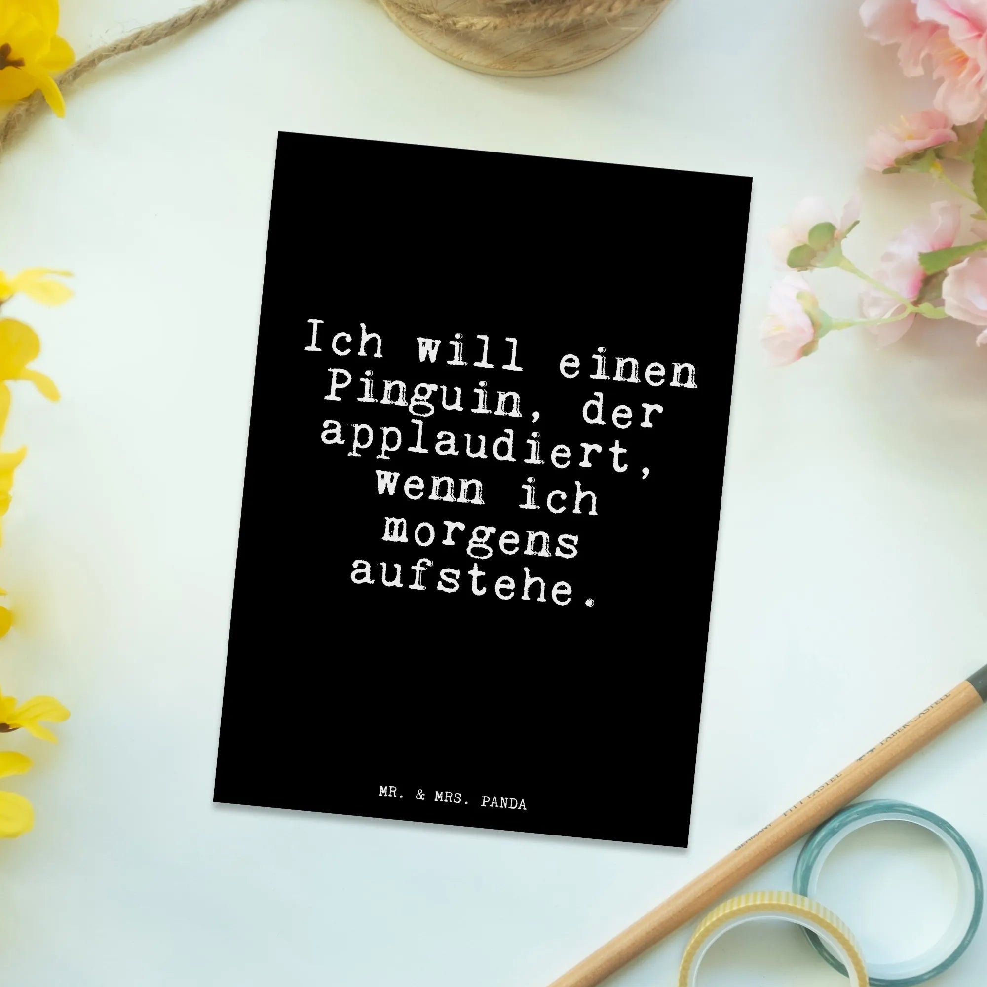 Die bezaubernde Postkarte "Ich will einen Pinguin, der applaudiert, wenn ich morgens aufstehe" von Mr. & Mrs. Panda ist das perfekte Geschenk für alle, die am Morgen gerne einen kleinen Motivationsschub bekommen. Egal, ob du sie einer Freundin, einem Morgenmuffel oder einfach einem lieben Menschen schenken möchtest, diese charmante Karte bringt garantiert ein Lächeln ins Gesicht. Gefertigt aus hochwertigem 300 Gramm Karton, ist die Karte nicht nur hübsch, sondern auch langlebig und robust. Sie hat eine hochglänzende veredelte Vorderseite, die die Farben leuchten lässt und somit die witzige Botschaft noch mehr zur Geltung bringt.