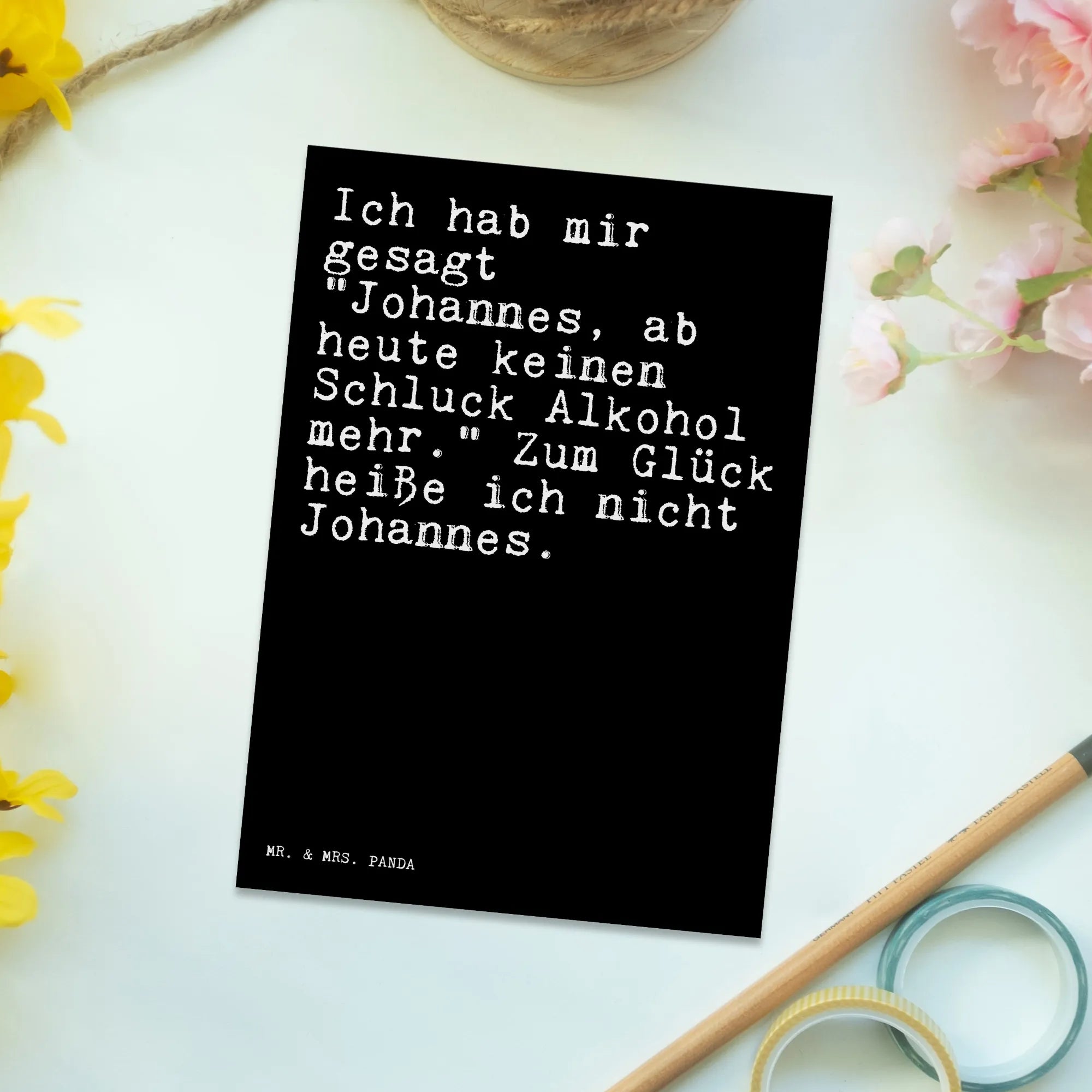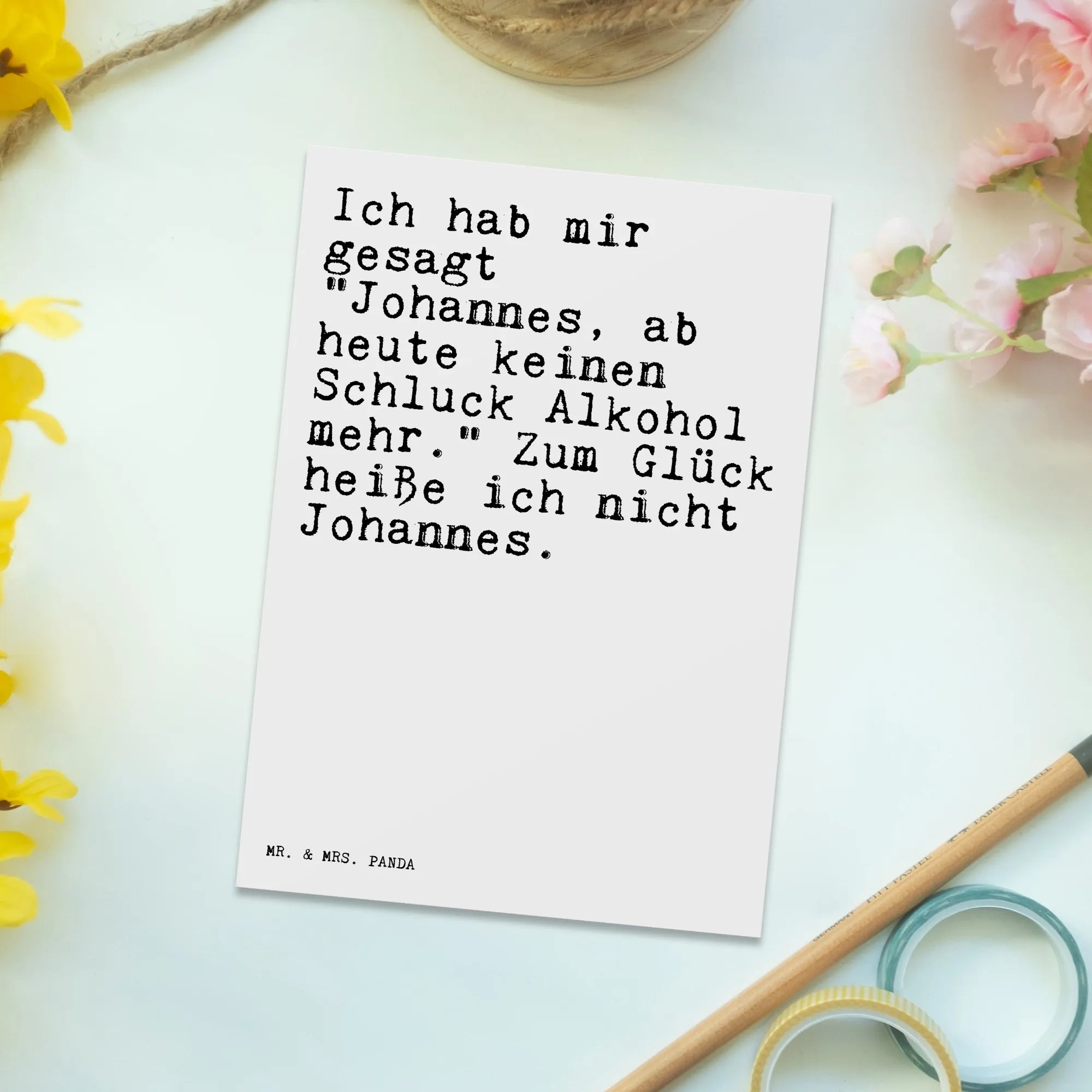 Die perfekte Postkarte von Mr. & Mrs. Panda ist ein wundervolles Geschenk für jeden Anlass! Mit dem humorvollen Spruch "Ich hab mir gesagt \"Johannes, ab heute keinen Schluck Alkohol mehr.\" Zum Glück heiße ich nicht Johannes." ist diese Karte besonders geeignet für Freunde, die gerne einen herzlichen Lacher teilen. Ob zum Geburtstag, für eine Einladung zur Feier oder als Dankeskarte – diese Karte bringt ein Lächeln auf jedes Gesicht!