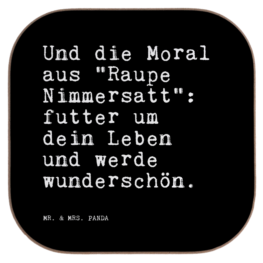 Quadratische Untersetzer Sprüche und Zitate Und die Moral aus "Raupe Nimmersatt": futter um dein Leben und werde wunderschön. - Schwarz