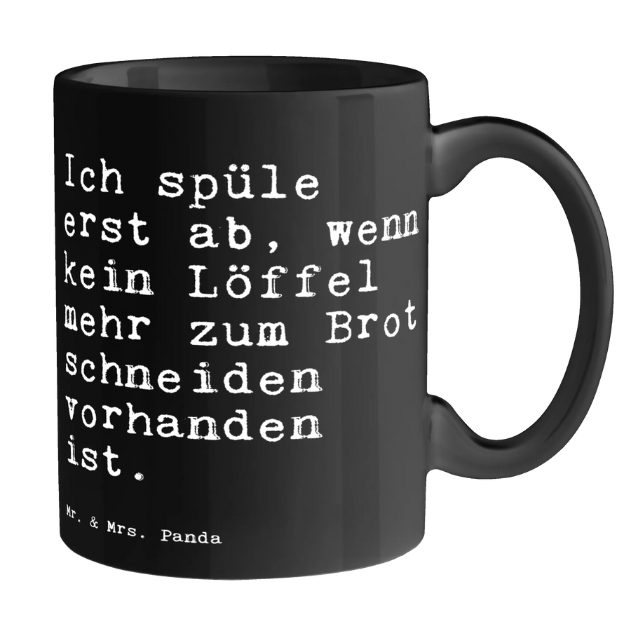 Entdecke die perfekte Kaffeetasse von Mr. & Mrs. Panda mit dem witzigen Spruch 'Ich spüle erst ab, wenn kein Löffel mehr zum Brot schneiden vorhanden ist.'