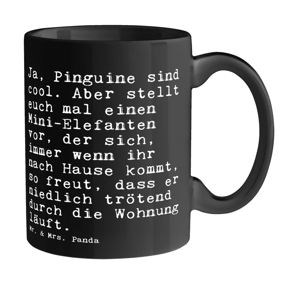 Tasse Sprüche und Zitate Ja, Pinguine sind cool. Aber stellt euch mal einen Mini-Elefanten vor, der sich, immer wenn ihr nach Hause kommt, so freut, dass er niedlich trötend durch die Wohnung läuft. - Keramik Schwarz - Schwarz