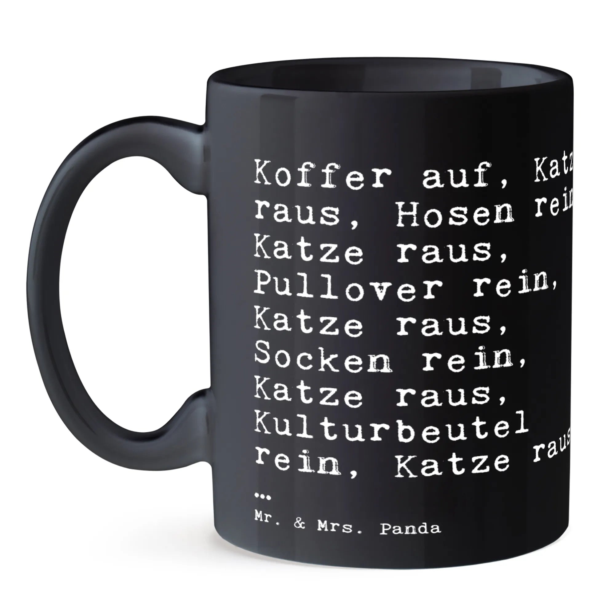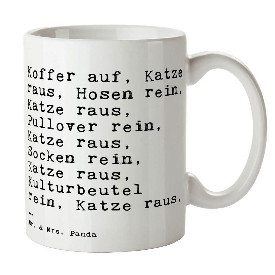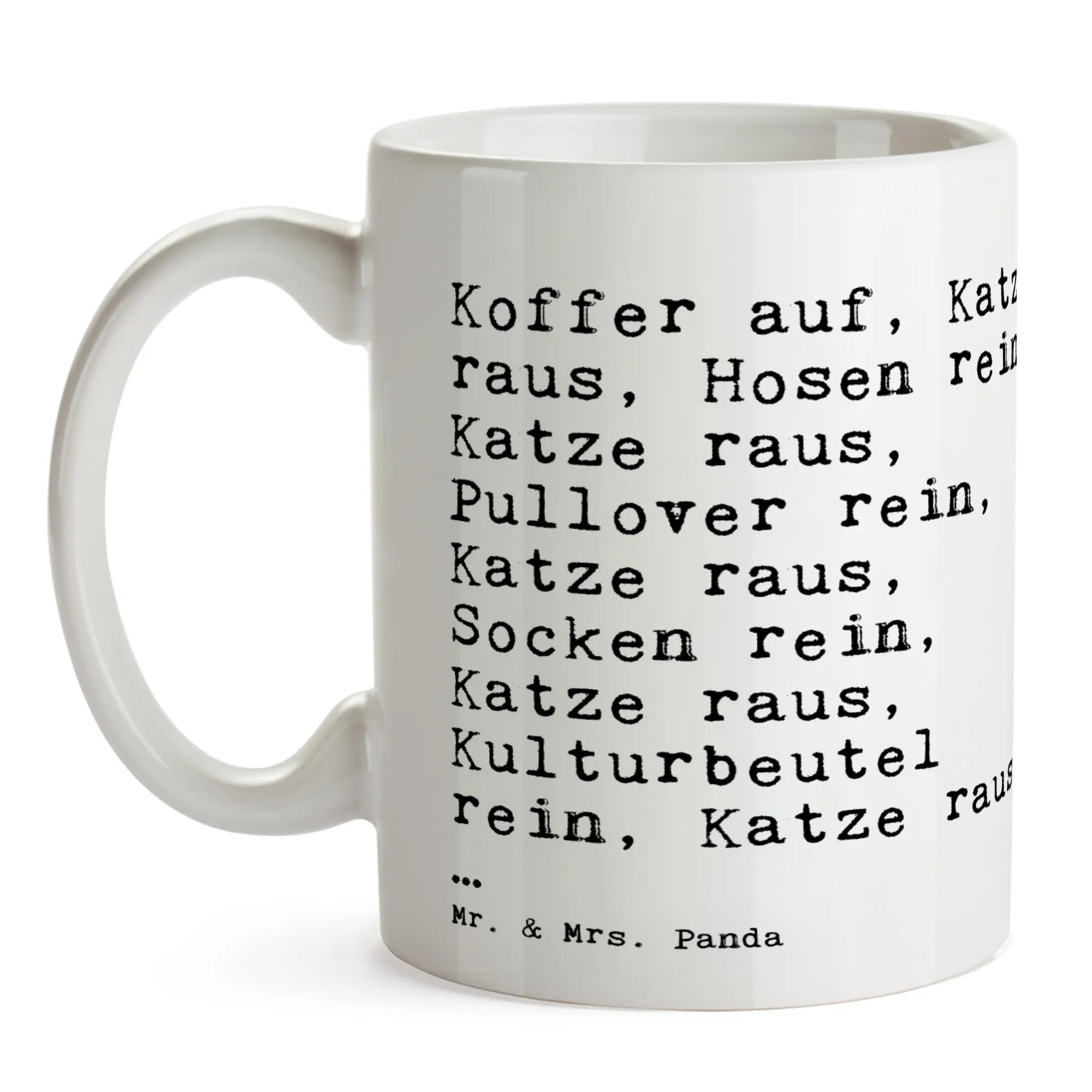 Tasse Sprüche und Zitate Koffer auf, Katze raus, Hosen rein, Katze raus, Pullover rein, Katze raus, Socken rein, Katze raus, Kulturbeutel rein, Katze raus, … - Keramik - Weiß