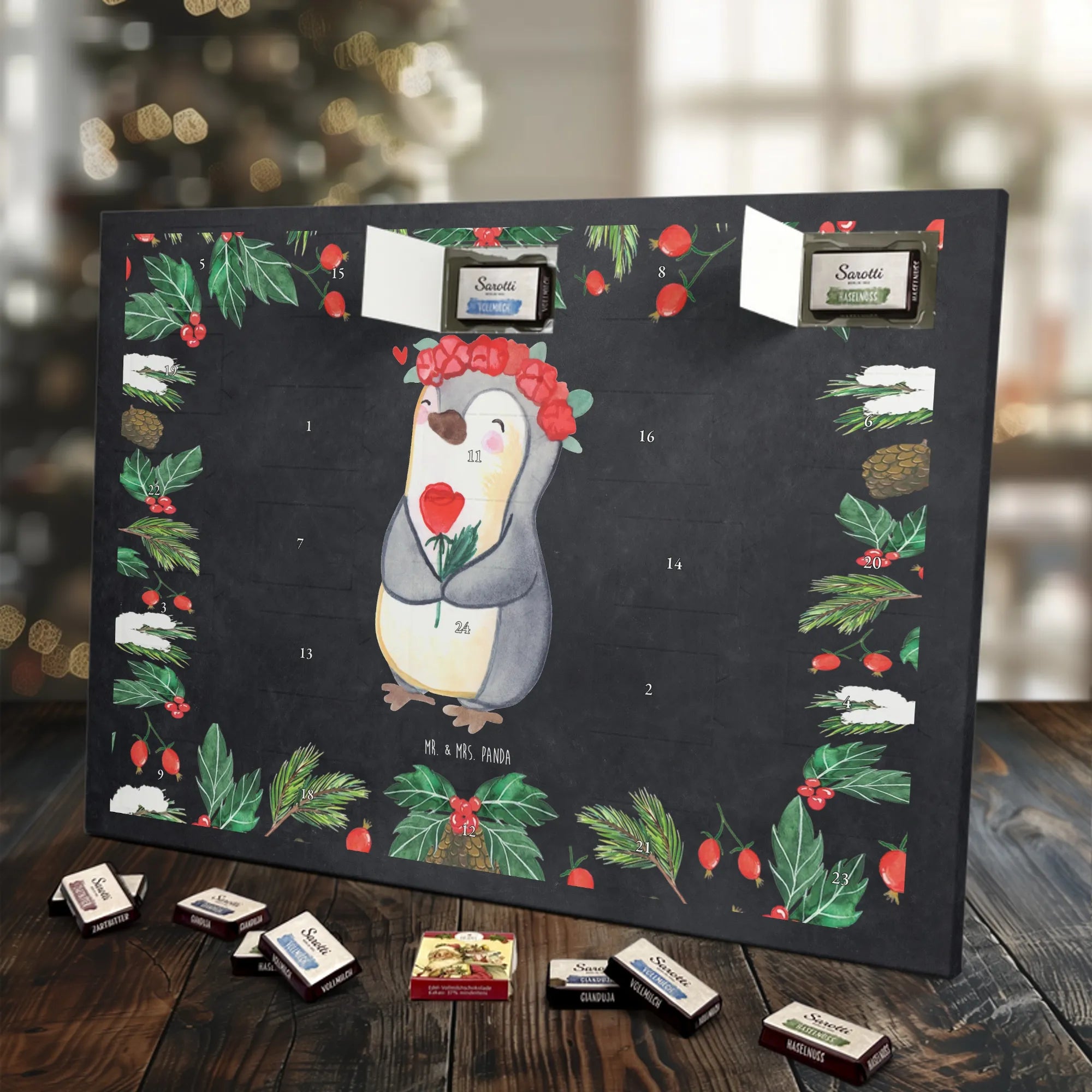 Perfektes Geschenk für Jungfrauen: Du suchst ein besonderes Adventsgeschenk für eine Frau, die im Zeichen der Jungfrau geboren ist? Unser Schoko Adventskalender Jungfrau aus der Sternzeichen-Kollektion von Mr. & Mrs. Panda vereint liebevolle Illustration und köstliche Schokolade. Das handgezeichnete Motiv zeigt einen niedlichen Pinguin mit Blumenkranz, der eine rote Rose hält – zart, verträumt und voller Herz.