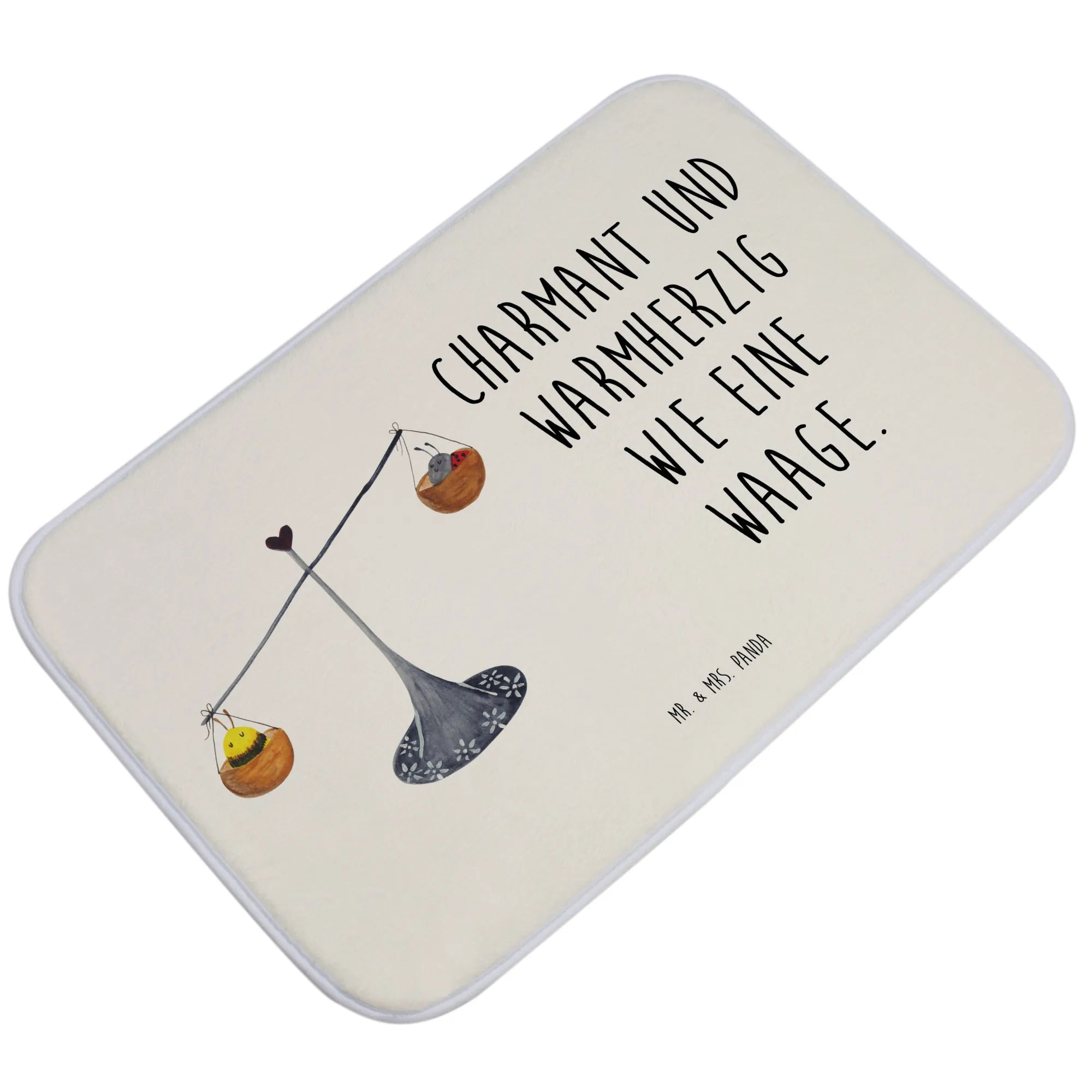 Dieser wunderschöne Badvorleger von Mr. & Mrs. Panda ist das perfekte Geschenk für Freunde und Familie! Mit seinem liebevoll handgezeichneten Motiv des Sternzeichens Waage bringt er nicht nur Farbe in Dein Badezimmer, sondern sorgt auch für ein warmherziges und charmantes Ambiente. Die Waage selbst steht für Gleichgewicht und Harmonie. Auf jeder Seite des Badvorlegers sitzt ein kleiner Marienkäfer und eine Hummel, die Visitenkarte der Waage. Sie helfen, die Balance zu halten und vermitteln somit das Gefühl der Ausgeglichenheit.