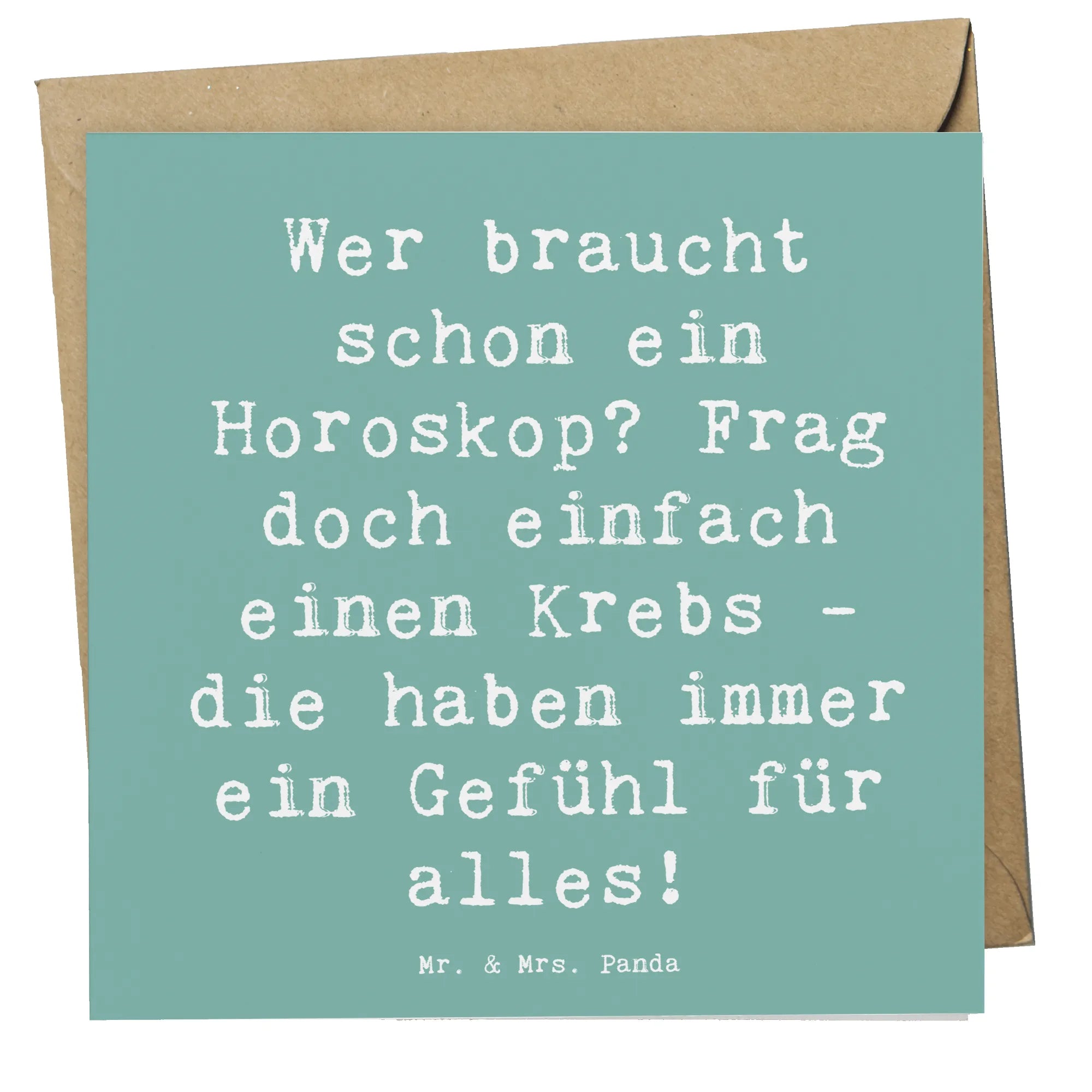 Gerade Krebse sind für ihre Sensibilität und Empathie bekannt. Mit dem Slogan "Wer braucht schon ein Horoskop? Frag doch einfach einen Krebs - die haben immer ein Gefühl für alles!" spricht die Karte genau die Eigenschaften an, die diesen Tierkreiszeichen so besonders machen. Wenn du also jemanden kennst, der unter dem Zeichen Krebs geboren wurde, dann ist diese Karte ein wunderbares Geschenk, das seine oder ihre Persönlichkeit widerspiegelt.