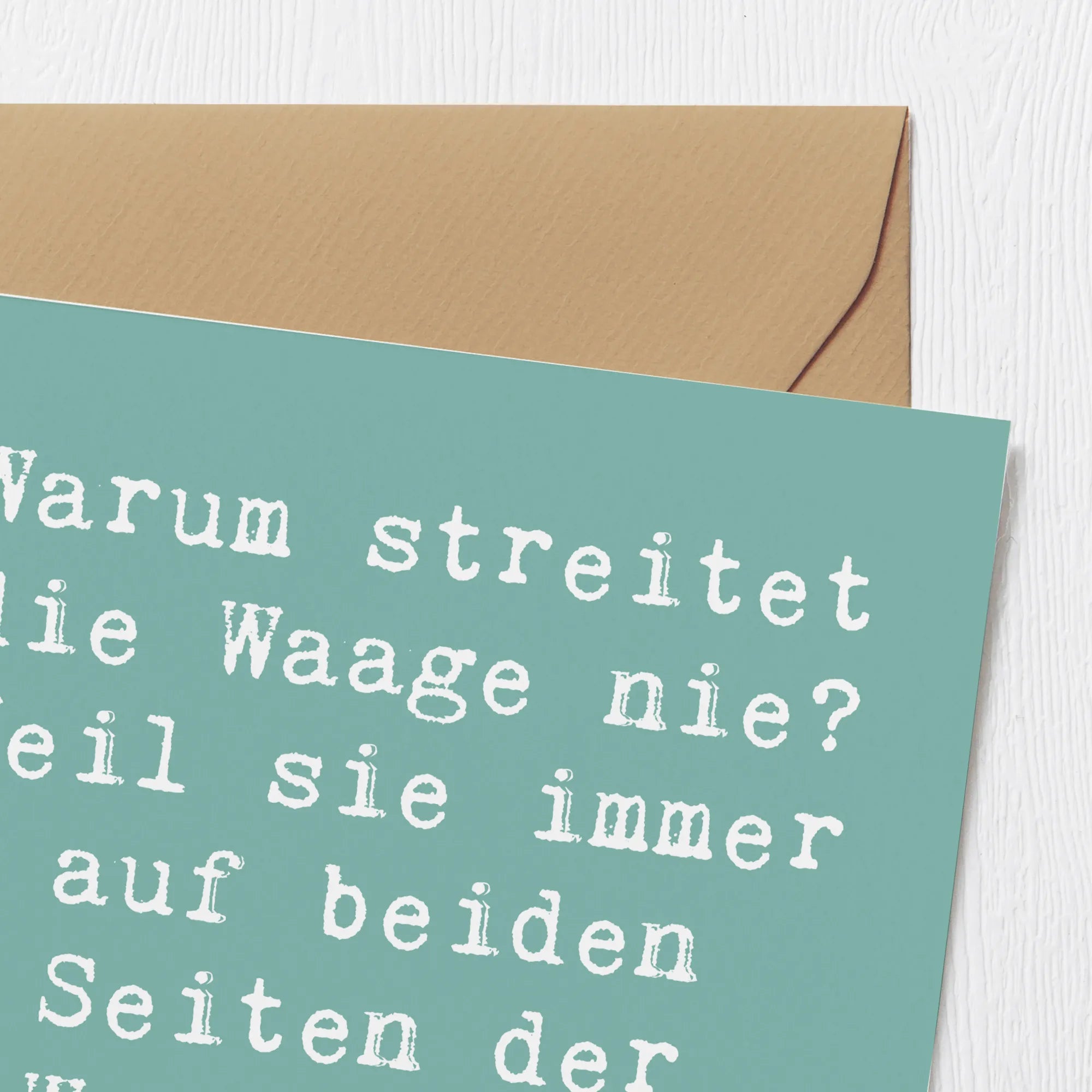 Mit einem charmanten Spruch "Warum streitet die Waage nie? Weil sie immer auf beiden Seiten der Waagschale stehen!" bringt diese Karte eine humorvolle Note in feierliche Anlässe. Egal ob Geburtstag, Hochzeit, Jubiläum oder einfach als liebevolle Geste, diese Karte ist ideal für individuelle Grüße und Glückwünsche.