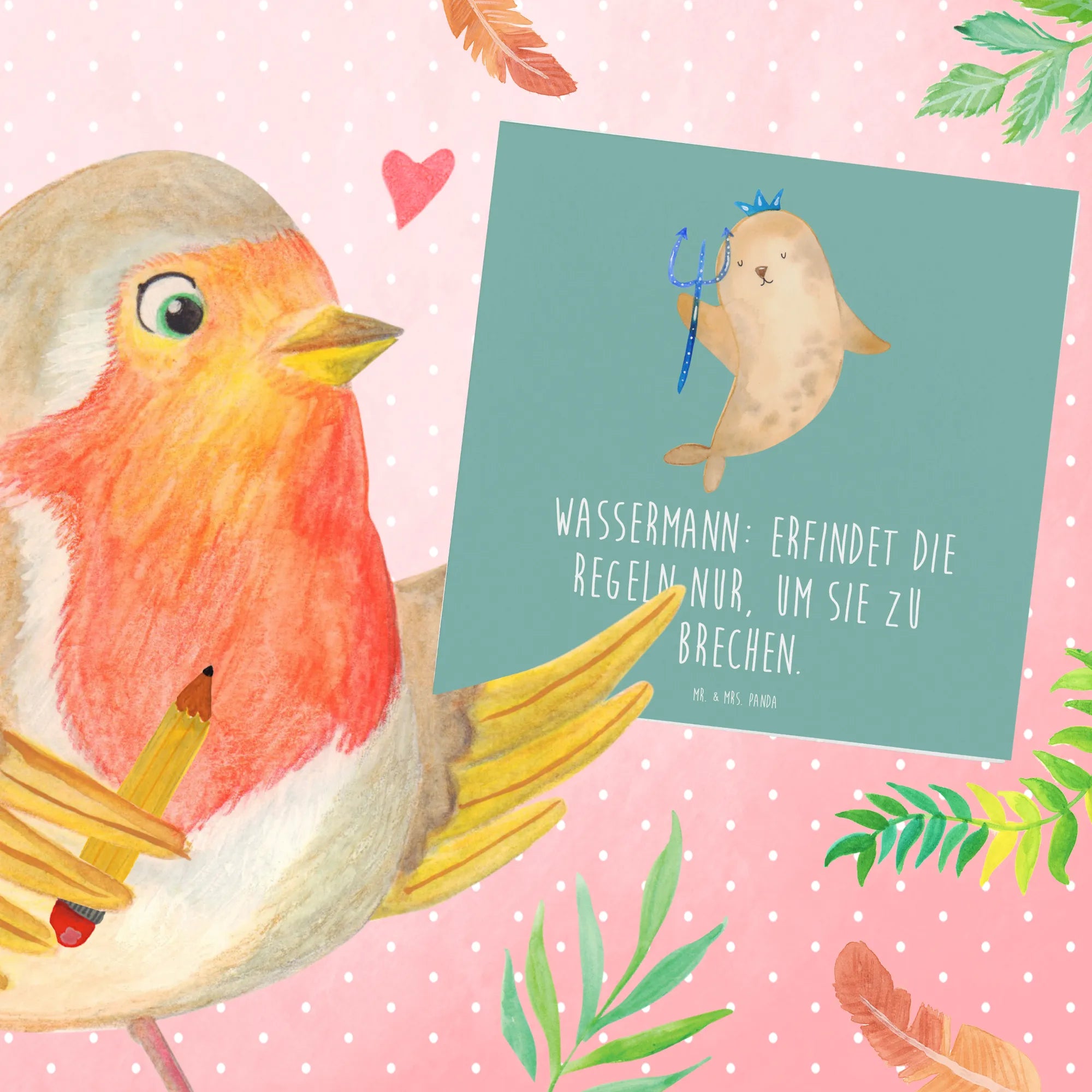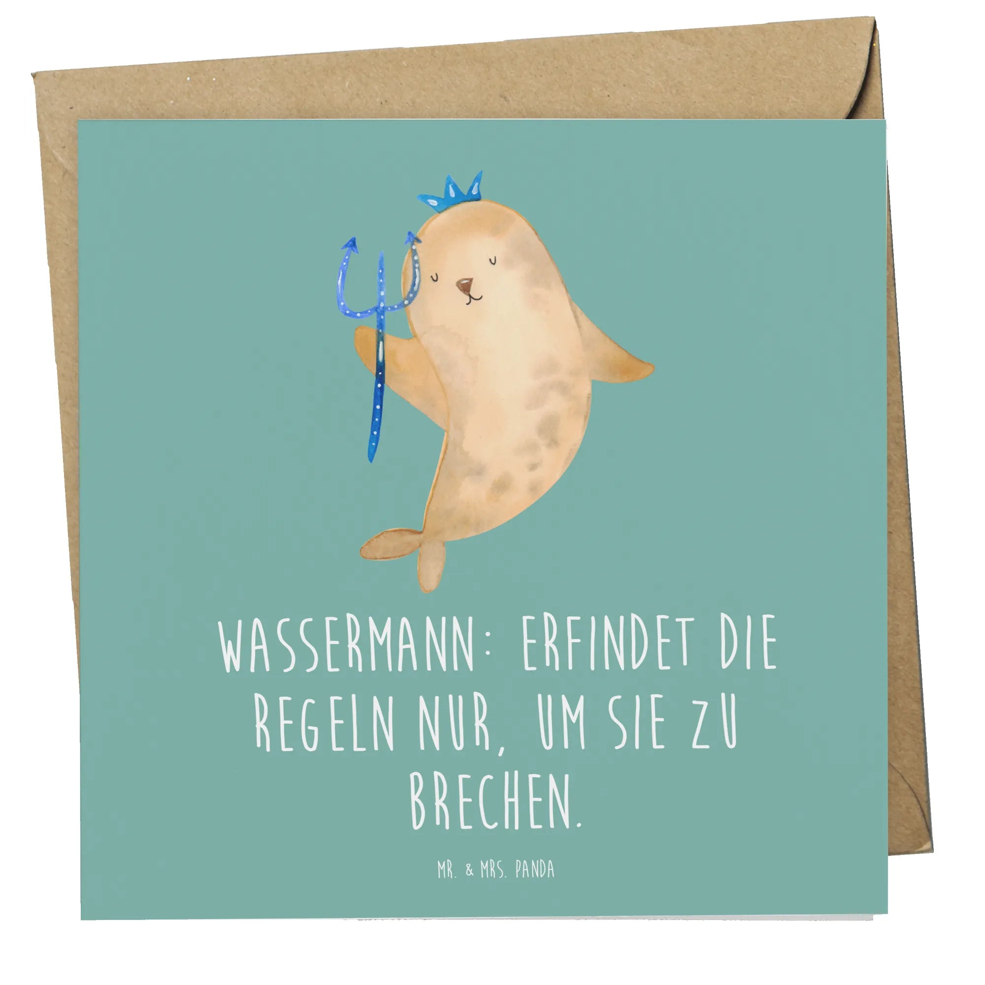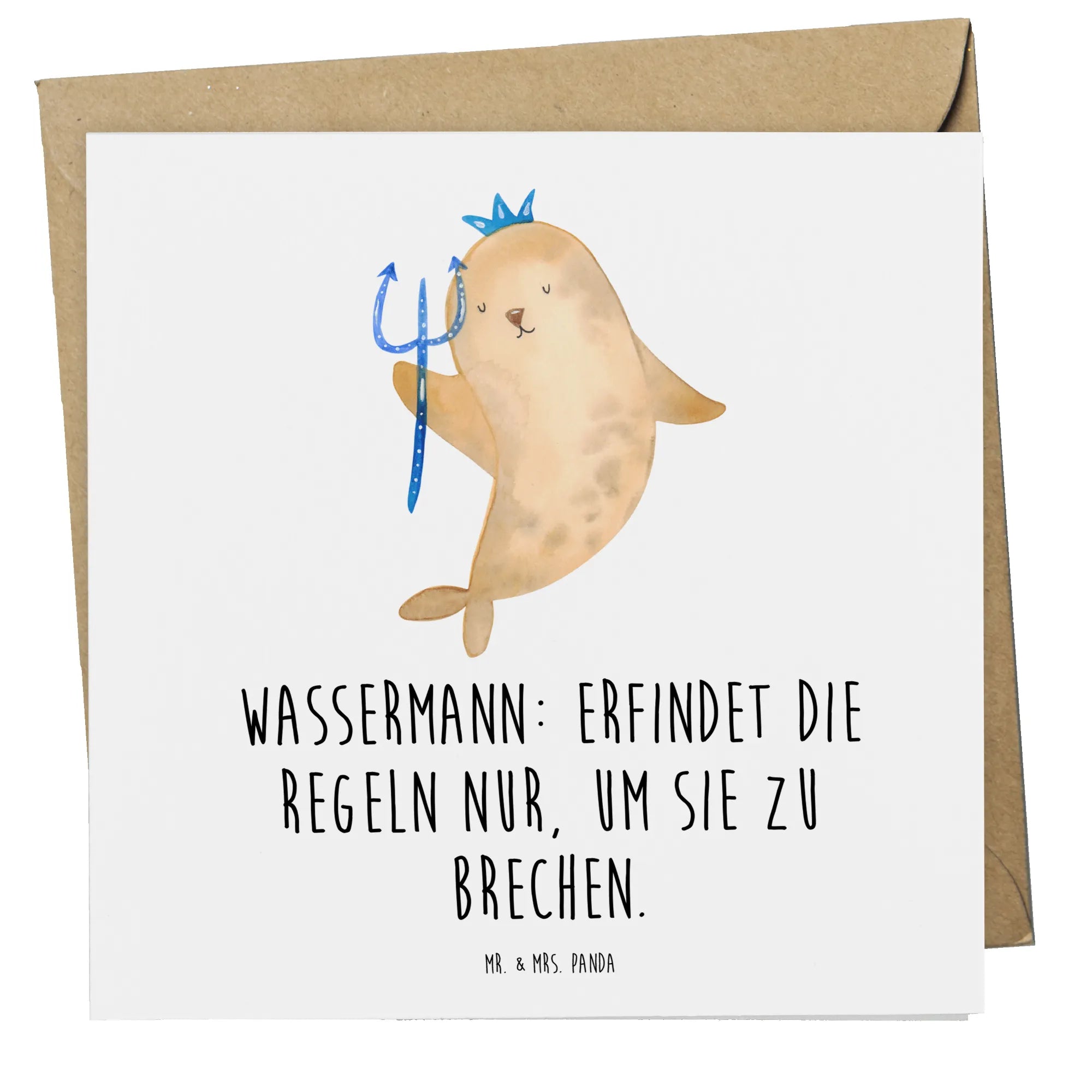 Mit dem Spruch "Wassermann: Erfindet die Regeln nur, um sie zu brechen" strahlt die Karte Charme und Humor aus. Die handgezeichneten Designs von Mrs. Panda bringen das besondere Flair der Sternzeichen zum Leben und machen jede Grußkarte einzigartig.