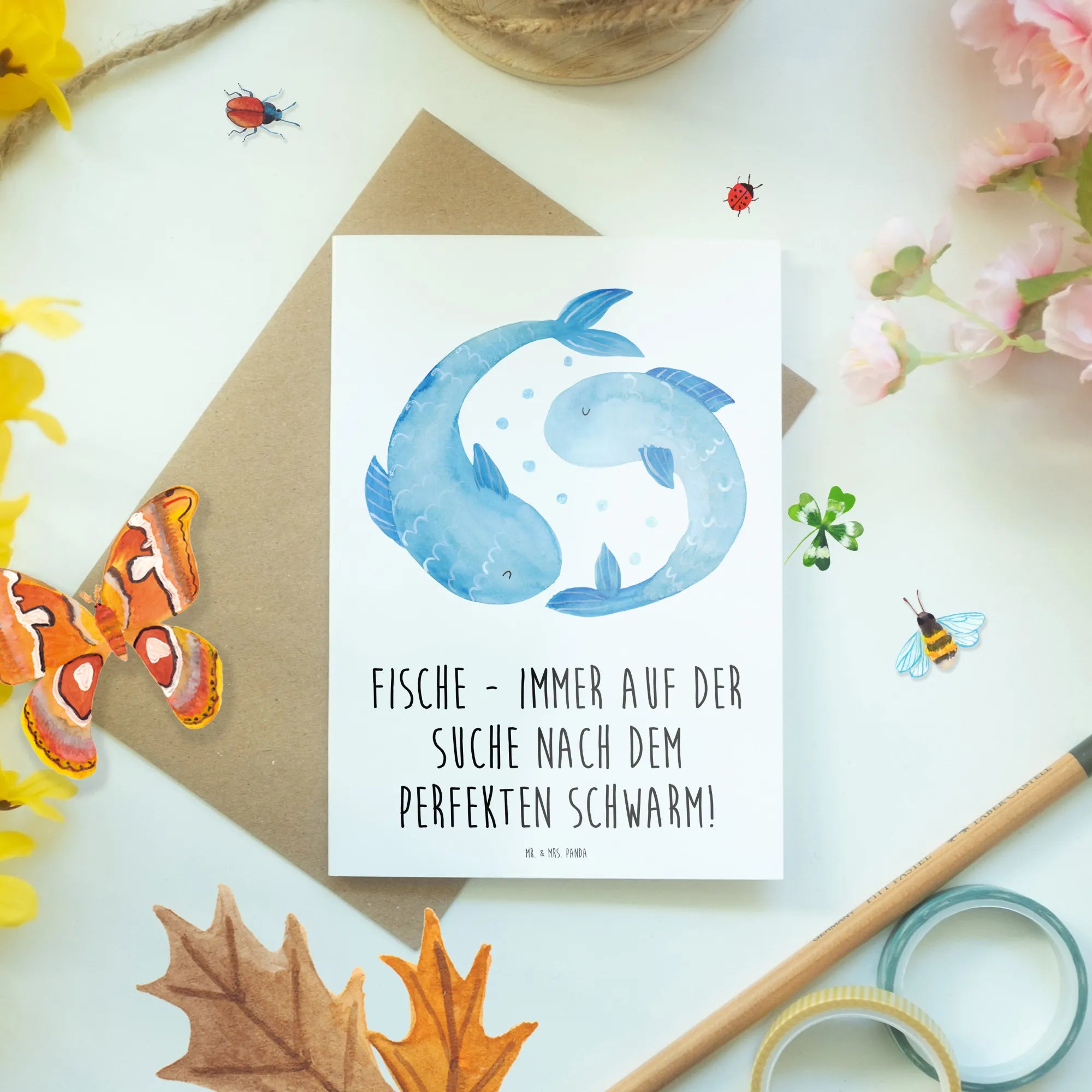 Die wunderschöne Grußkarte "Fische - immer auf der Suche nach dem perfekten Schwarm!" aus der Sternzeichen-Kollektion von Mr. & Mrs. Panda ist das ideale Geschenk für jeden Anlass. Egal ob du einem Freund, einer Freundin oder einem geliebten Menschen eine Freude machen möchtest, diese Karte ist perfekt geeignet, um deine Glückwünsche elegant zu übermitteln. Ob zum Geburtstag, zu einer Hochzeit oder einfach nur so, sie bringt ein Lächeln auf jedes Gesicht. Das niedliche Motiv der Fische, liebevoll von Mrs. Panda handgezeichnet, bringt die Eigenschaften des Sternzeichens perfekt zur Geltung und sorgt für einen ganz besonderen Charme.