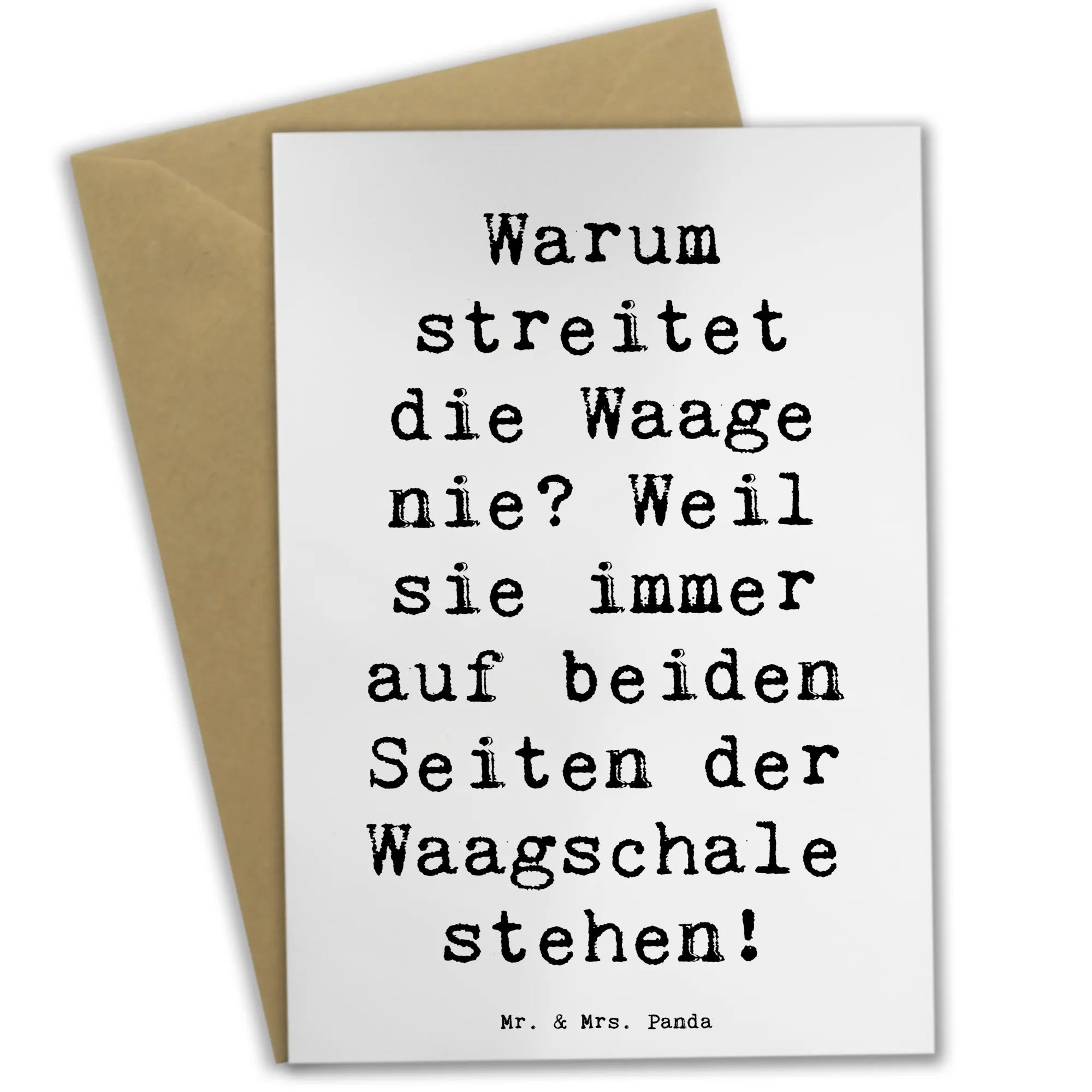 Die wunderschöne Grußkarte "Waage" aus der Sternzeichen-Kollektion von Mr. & Mrs. Panda ist das perfekte Geschenk für alle, die das astrologische Flair schätzen. Mit dem Spruch "Warum streitet die Waage nie? Weil sie immer auf beiden Seiten der Waagschale stehen!" bringt diese Karte ein fröhliches Lächeln und ist ideal für Freunde, Familie und Liebste, die im Zeichen der Waage geboren sind. Die Karte eignet sich wunderbar für jeden feierlichen Anlass wie Geburtstage, Hochzeiten oder einfach als Glückwunschkarte.