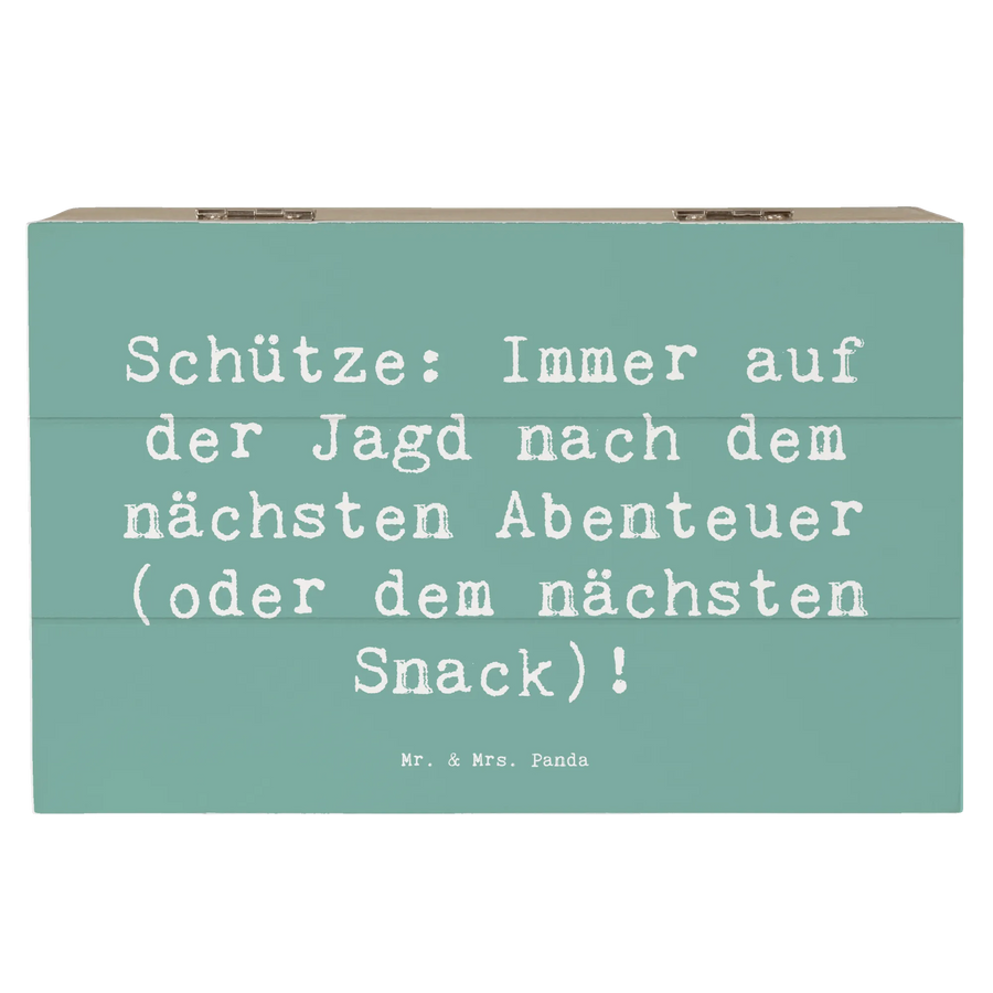 Die Holzkiste ist stabil, aus robuster Holzfaser gefertigt und mit dem charmanten Spruch „Schütze: Immer auf der Jagd nach dem nächsten Abenteuer (oder dem nächsten Snack)!“ verziert. Dieses wunderschöne Design, das von Mrs. Panda handgezeichnet wurde, spricht die Abenteuerlust an, die Schützen so lieben.