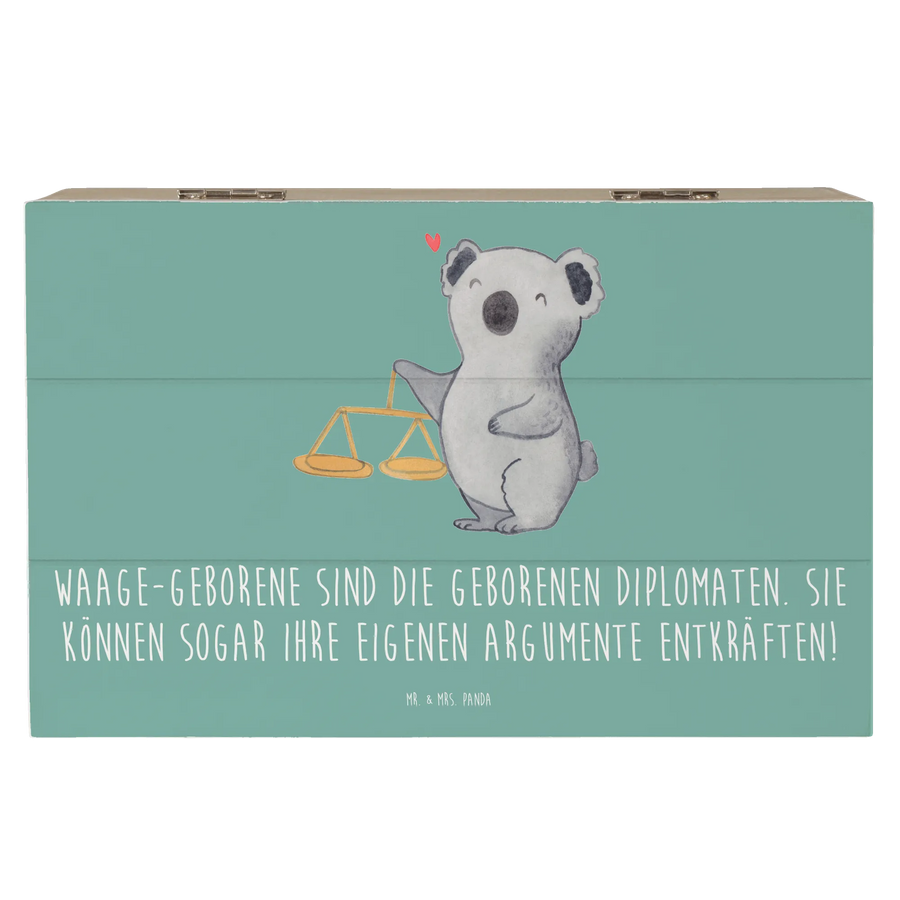 Entdecke die bezaubernde Holzkiste mit dem schönen Waage-Motiv aus der Sternzeichen-Kollektion von Mr. & Mrs. Panda! Diese wundervolle Kiste ist nicht nur ein echter Hingucker, sondern auch der perfekte Ort, um deine wertvollsten Erinnerungen zu bewahren. Egal, ob du sie für die Aufbewahrung von kleinen Schätzen, Fotos oder besonderen Erinnerungsstücken nutzen möchtest – diese robusten Holzbox überzeugt mit ihrer liebevollen Gestaltung und dem ansprechenden Slogan: „Waage-Geborene sind die geborenen Diplomaten. Sie können sogar ihre eigenen Argumente entkräften!".
