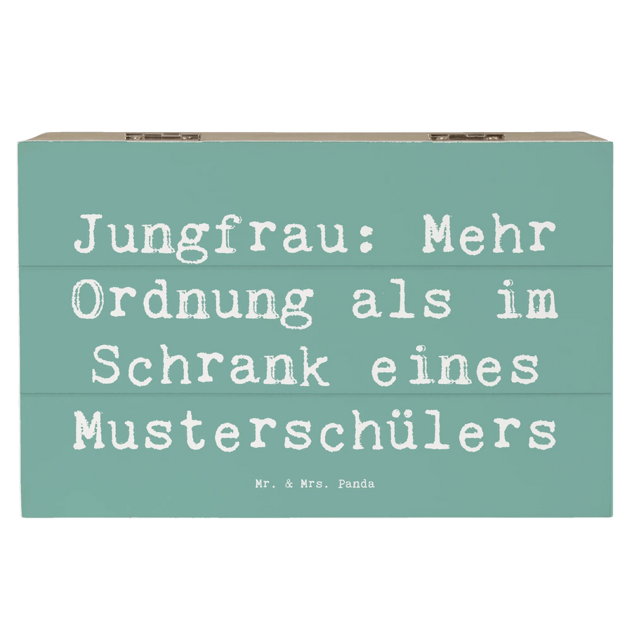 Die Holzkiste "Jungfrau" von Mr. & Mrs. Panda ist der perfekte Begleiter für all jene, die Liebe zur Ordnung und zum Detail schätzen. Mit einem liebevoll gestalteten Motiv und dem charmanten Spruch "Jungfrau: Mehr Ordnung als im Schrank eines Musterschülers" bringt diese Kiste nicht nur einen Hauch von Persönlichkeit in dein Zuhause, sondern bietet auch einen praktischen Platz für all deine Schätze und Erinnerungen.