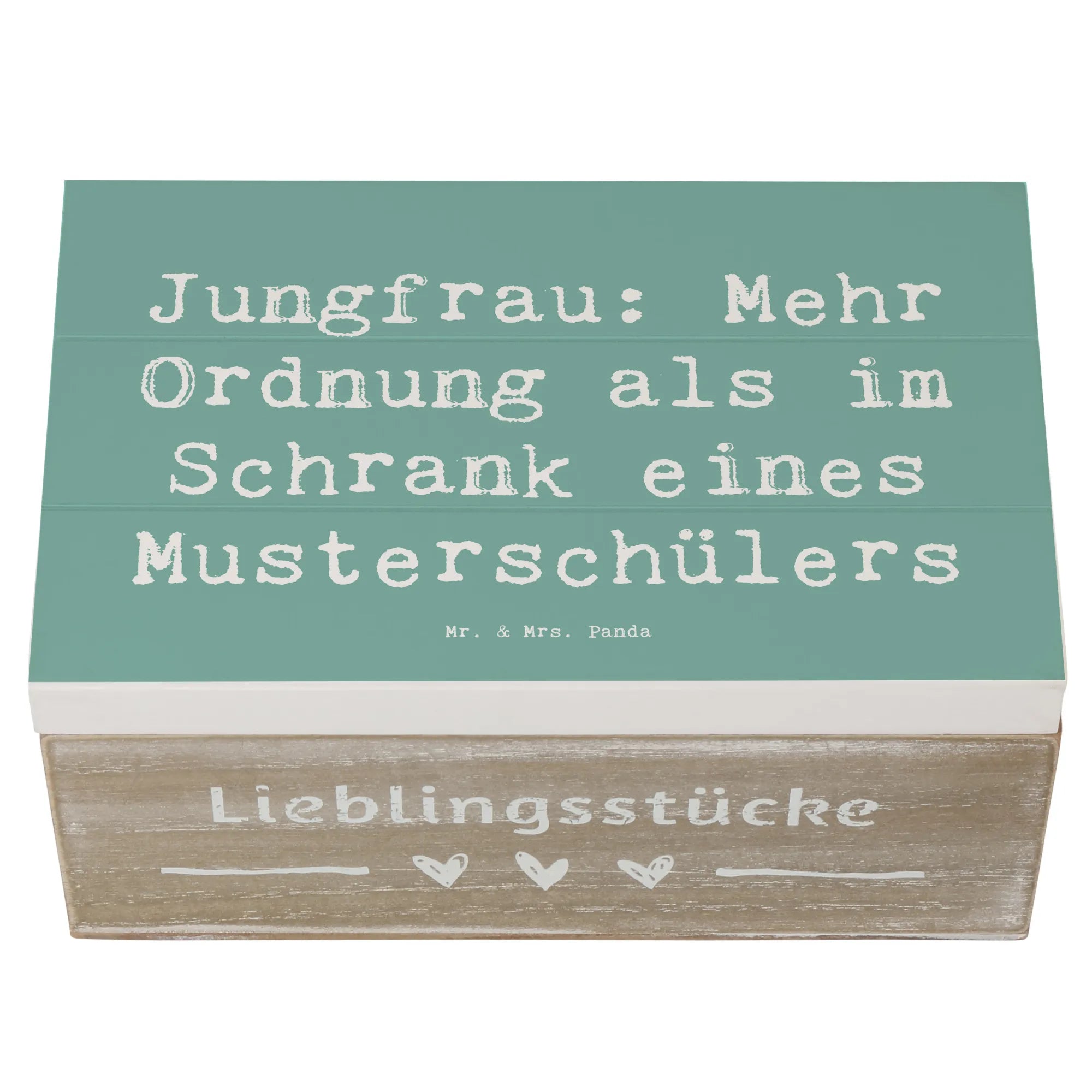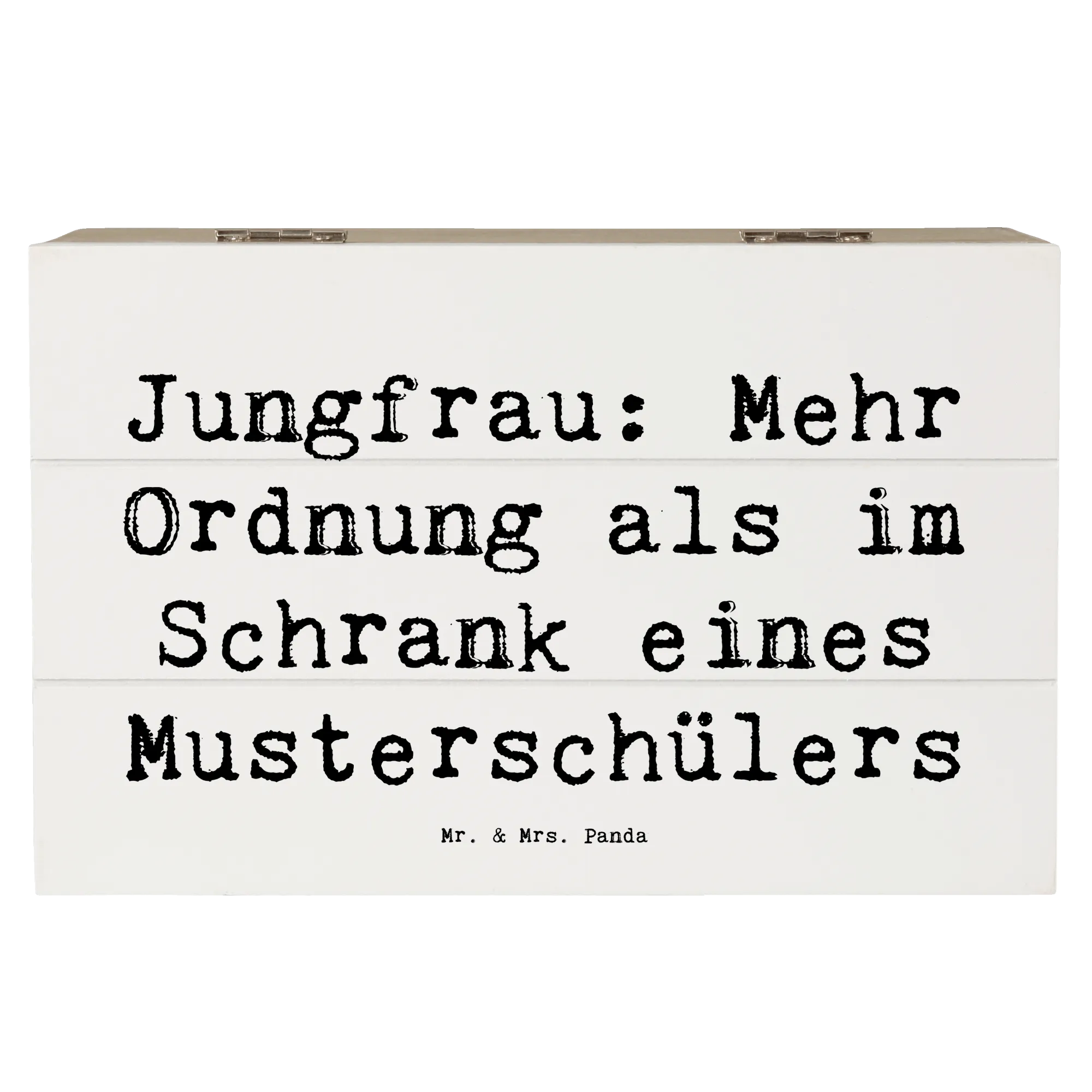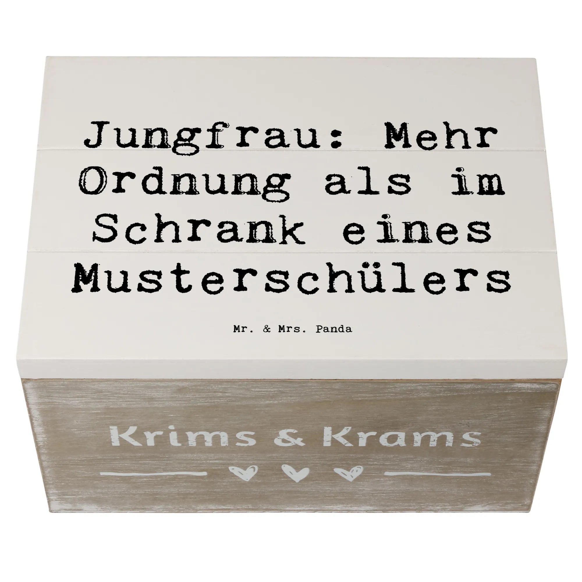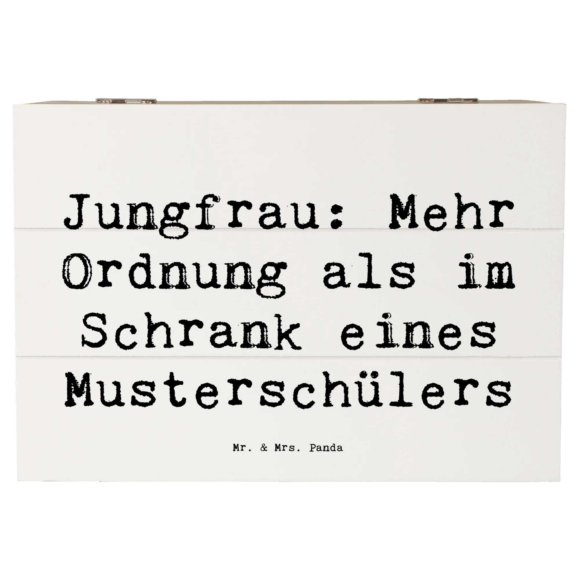 Die Holzkiste "Jungfrau" von Mr. & Mrs. Panda ist der perfekte Begleiter für all jene, die Liebe zur Ordnung und zum Detail schätzen. Mit einem liebevoll gestalteten Motiv und dem charmanten Spruch "Jungfrau: Mehr Ordnung als im Schrank eines Musterschülers" bringt diese Kiste nicht nur einen Hauch von Persönlichkeit in dein Zuhause, sondern bietet auch einen praktischen Platz für all deine Schätze und Erinnerungen.