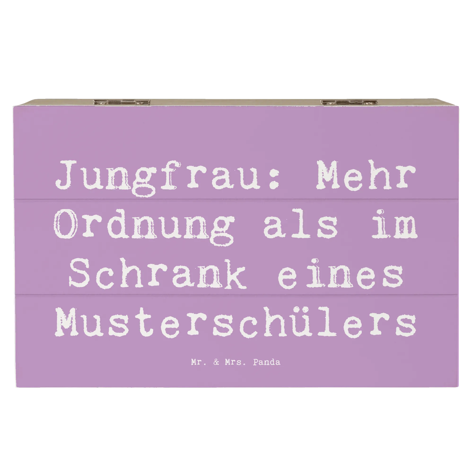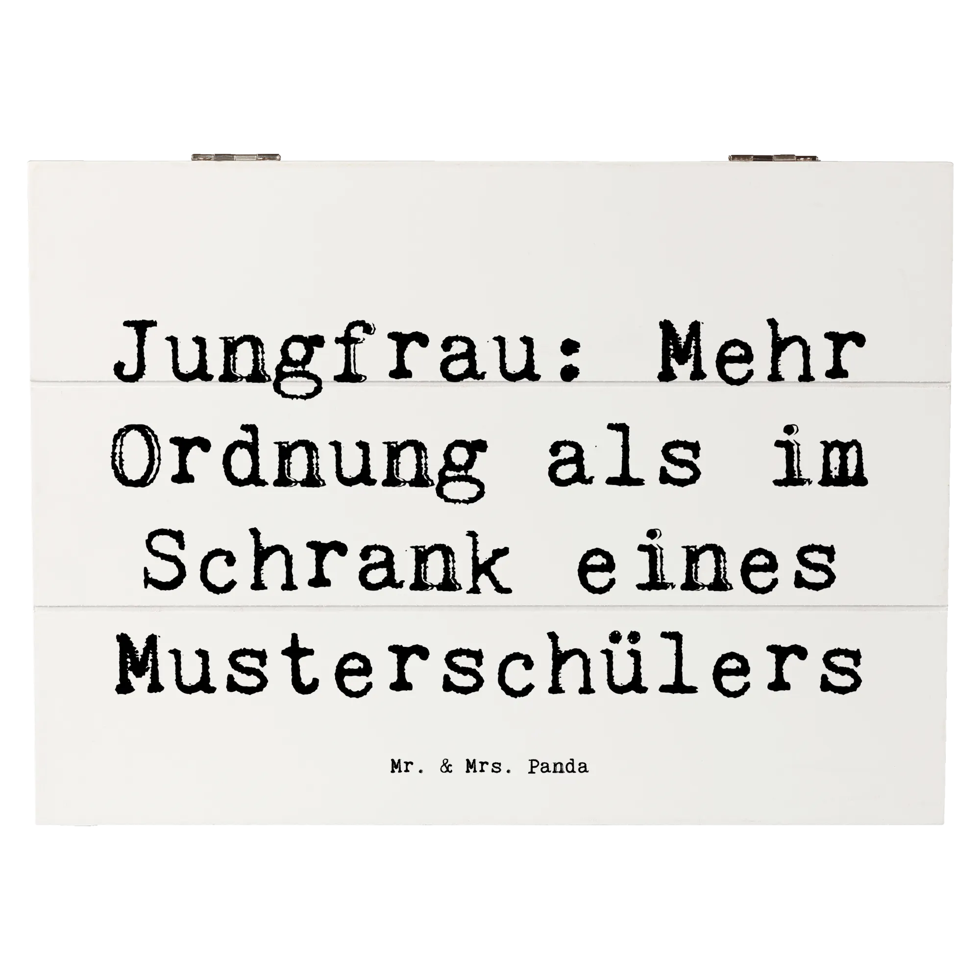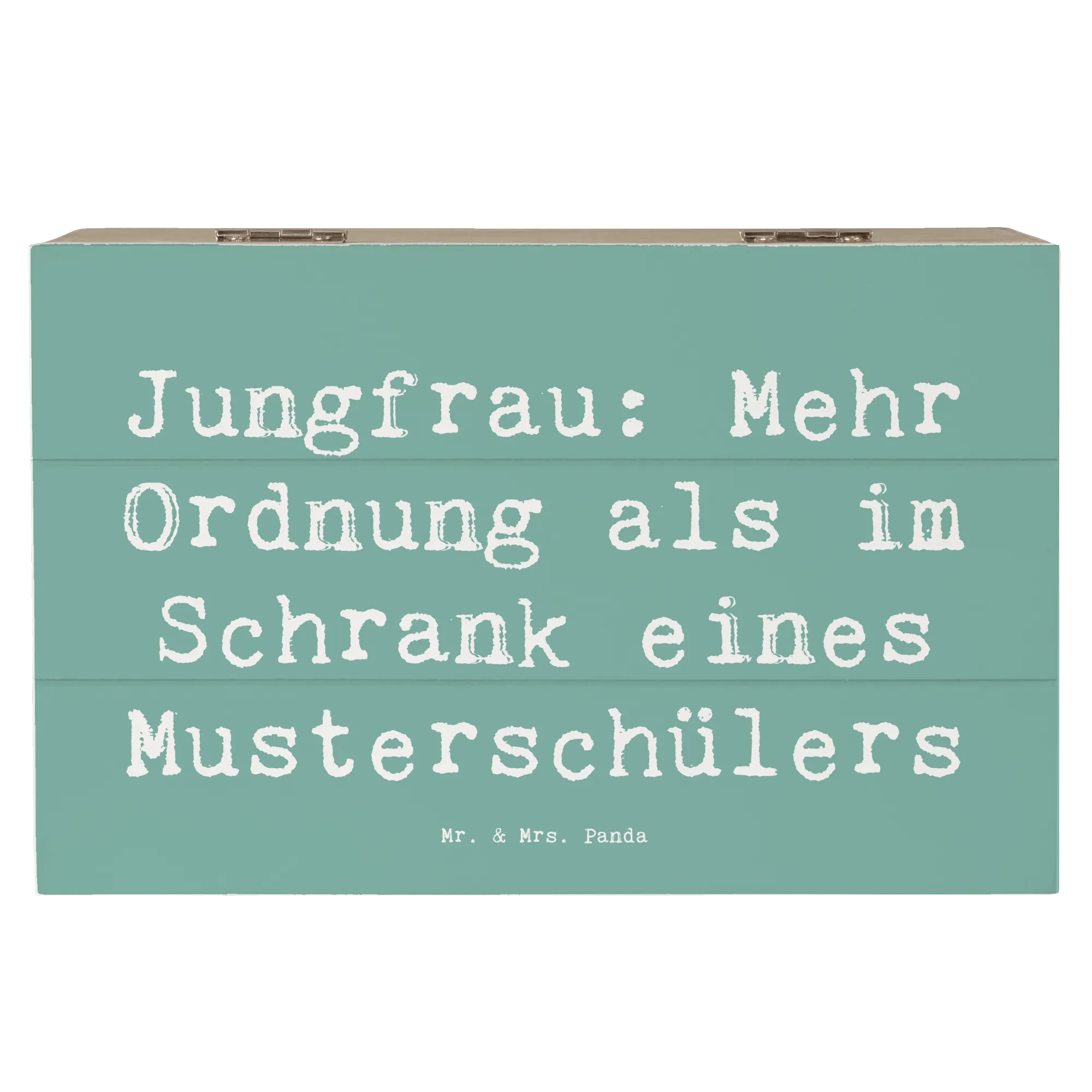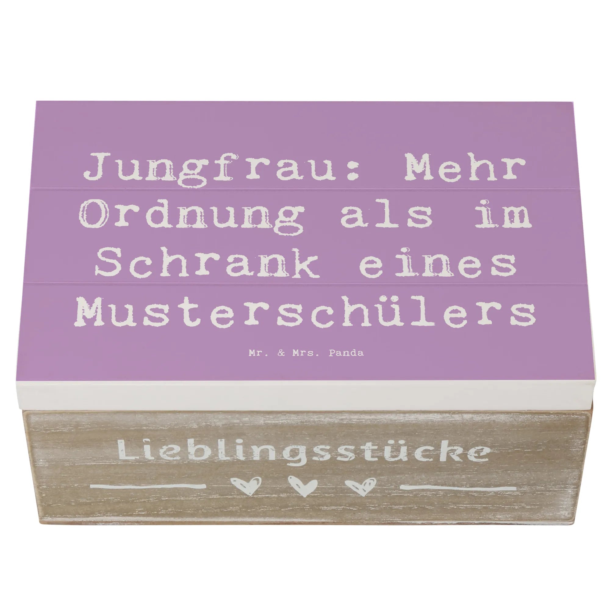 Die Holzkiste "Jungfrau" von Mr. & Mrs. Panda ist der perfekte Begleiter für all jene, die Liebe zur Ordnung und zum Detail schätzen. Mit einem liebevoll gestalteten Motiv und dem charmanten Spruch "Jungfrau: Mehr Ordnung als im Schrank eines Musterschülers" bringt diese Kiste nicht nur einen Hauch von Persönlichkeit in dein Zuhause, sondern bietet auch einen praktischen Platz für all deine Schätze und Erinnerungen.