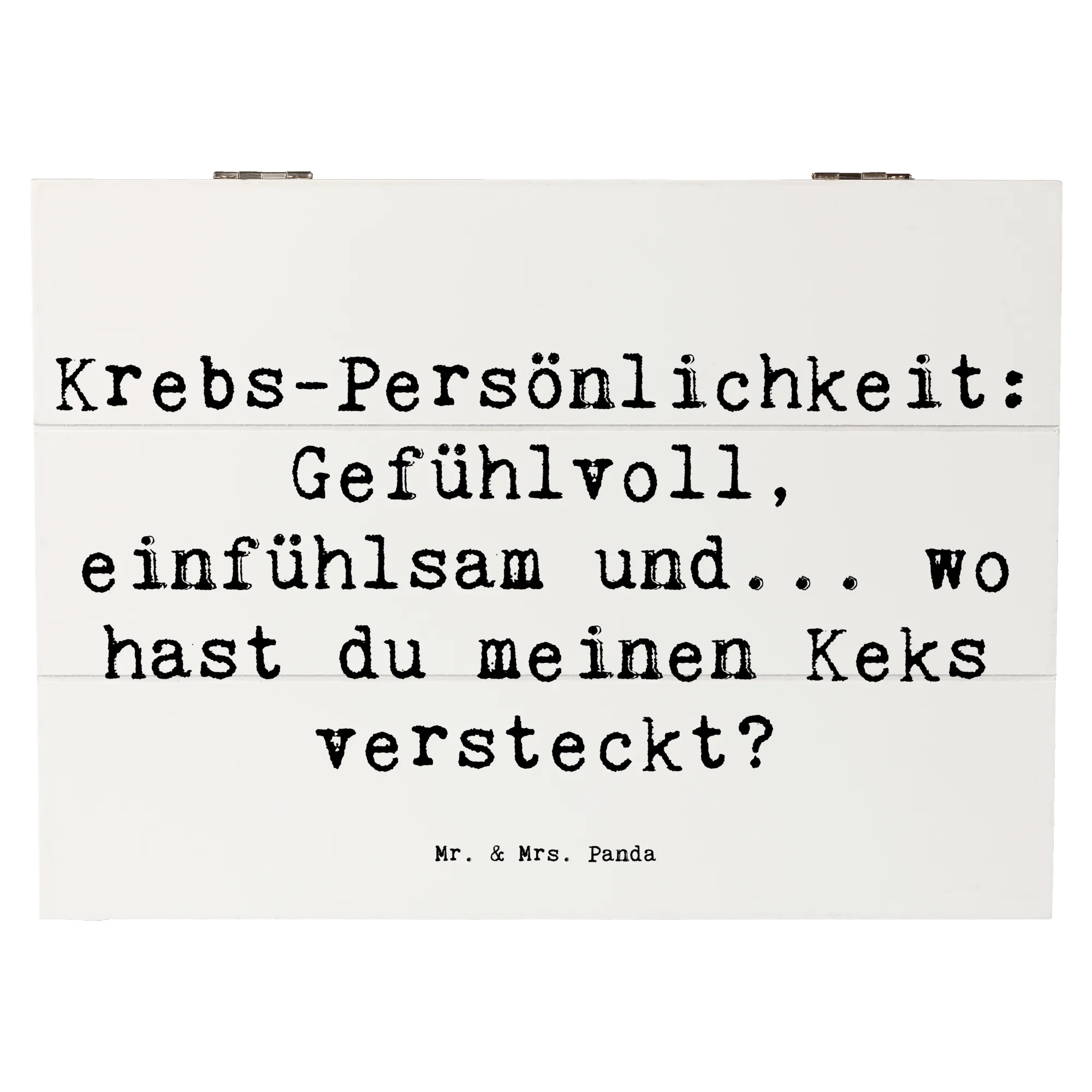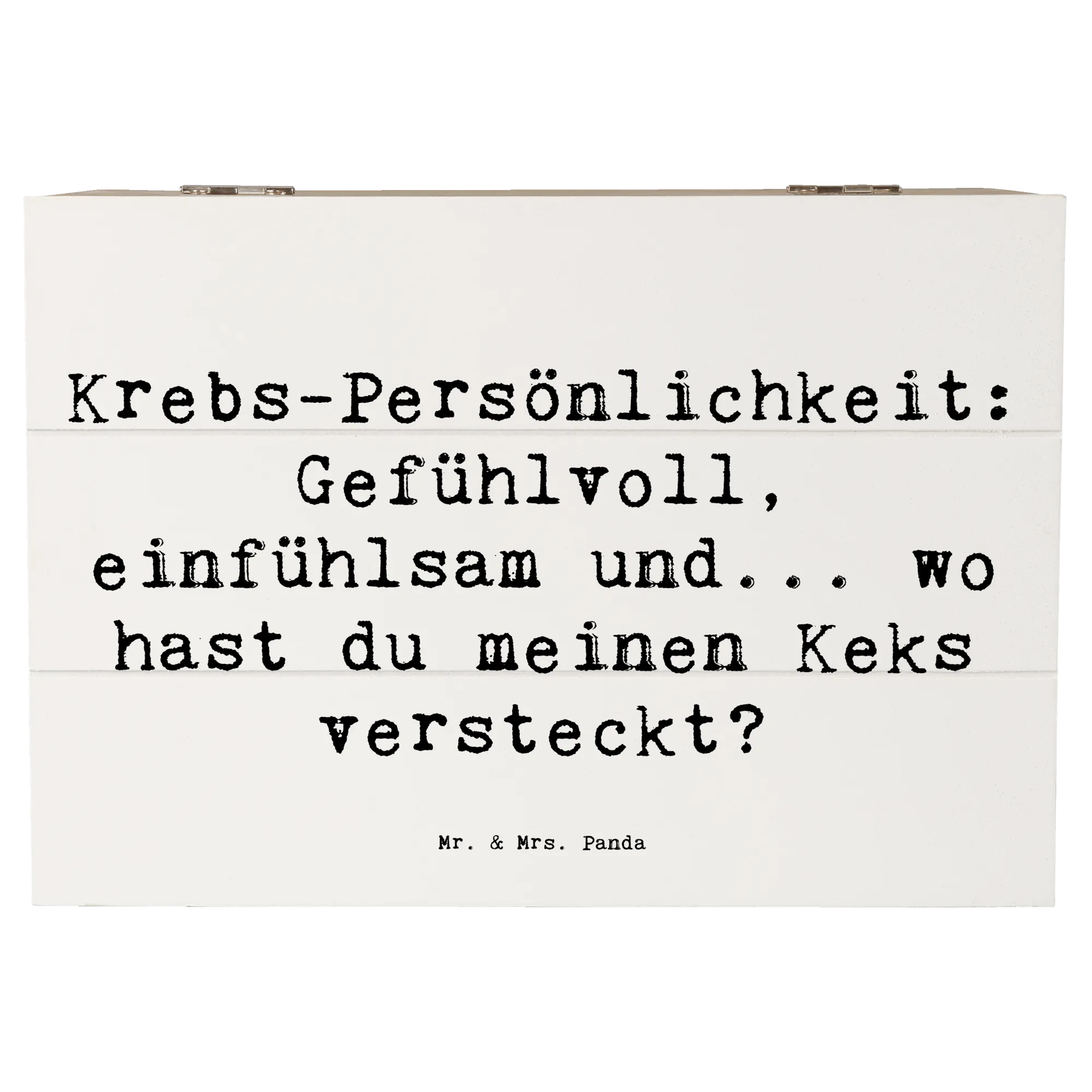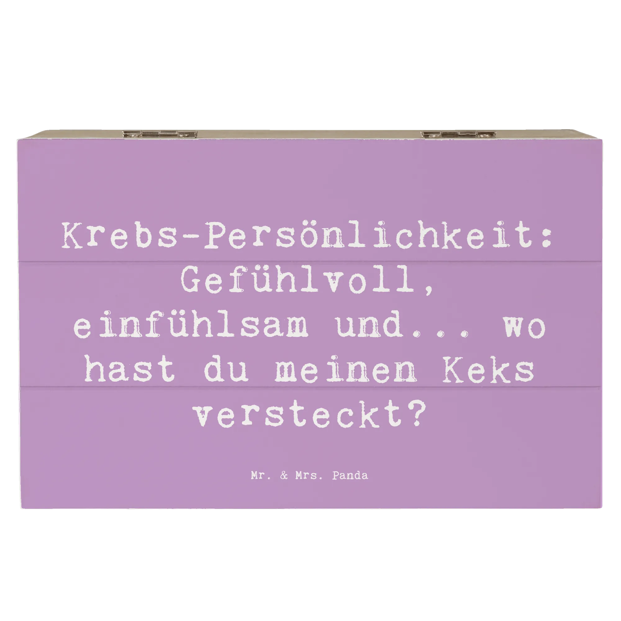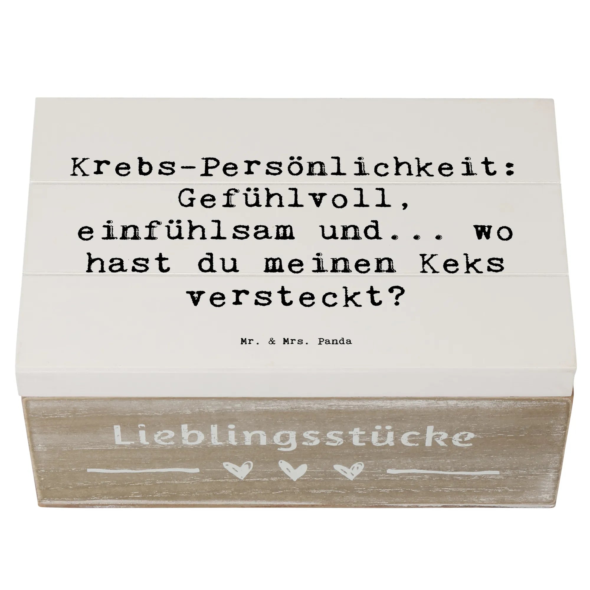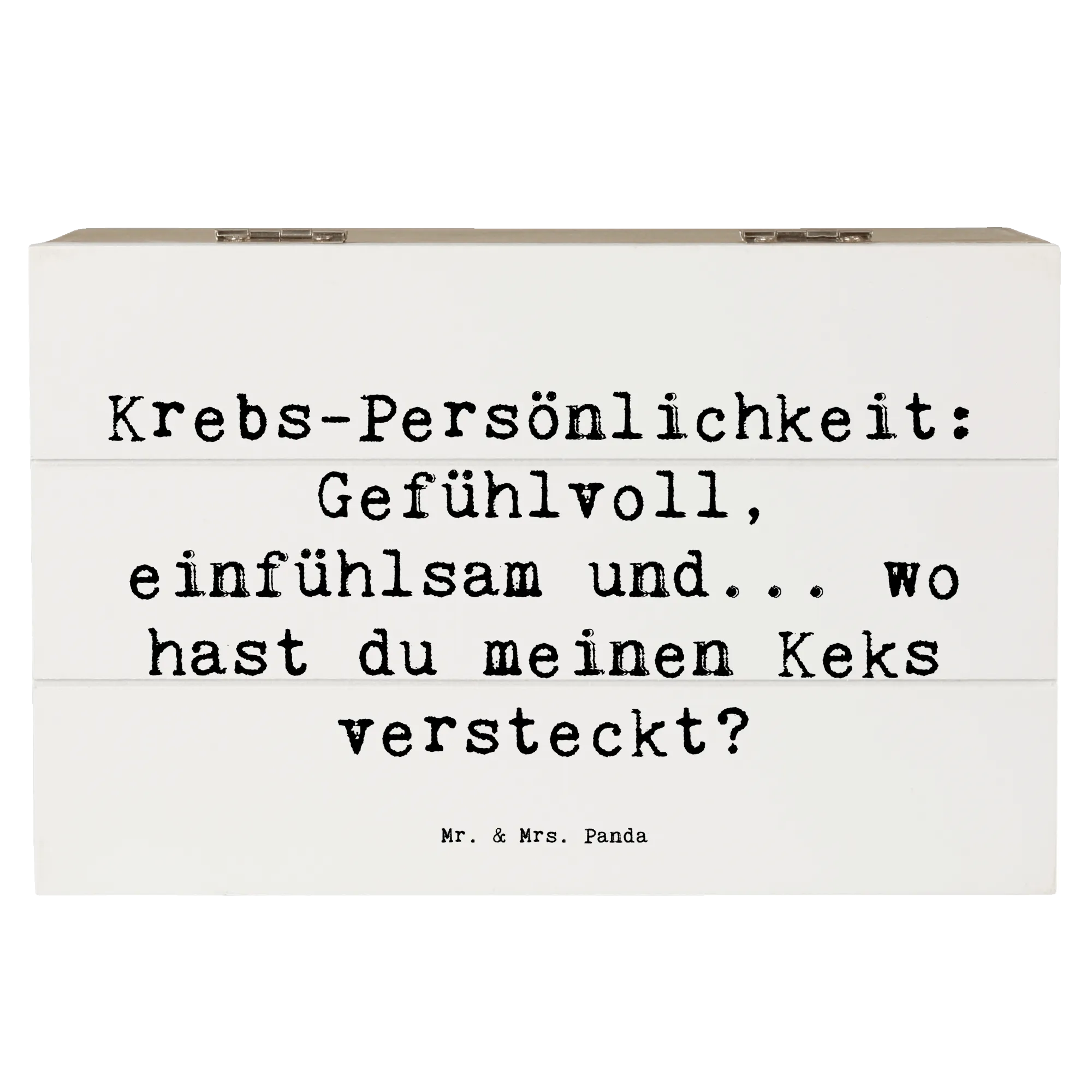 Eine liebevolle Holzkiste für Herzmenschen: Die Holzkiste Krebs von Mr. & Mrs. Panda ist die perfekte Kombination aus Funktion und Persönlichkeit. Mit dem charmanten Spruch „Krebs-Persönlichkeit: Gefühlvoll, einfühlsam und... wo hast du meinen Keks versteckt?“ bringt diese dekorative Schachtel ein Lächeln in jeden Raum und passt ideal zu Menschen, die ihr Sternzeichen mit Stolz und Humor tragen.