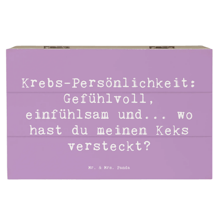 Eine liebevolle Holzkiste für Herzmenschen: Die Holzkiste Krebs von Mr. & Mrs. Panda ist die perfekte Kombination aus Funktion und Persönlichkeit. Mit dem charmanten Spruch „Krebs-Persönlichkeit: Gefühlvoll, einfühlsam und... wo hast du meinen Keks versteckt?“ bringt diese dekorative Schachtel ein Lächeln in jeden Raum und passt ideal zu Menschen, die ihr Sternzeichen mit Stolz und Humor tragen.