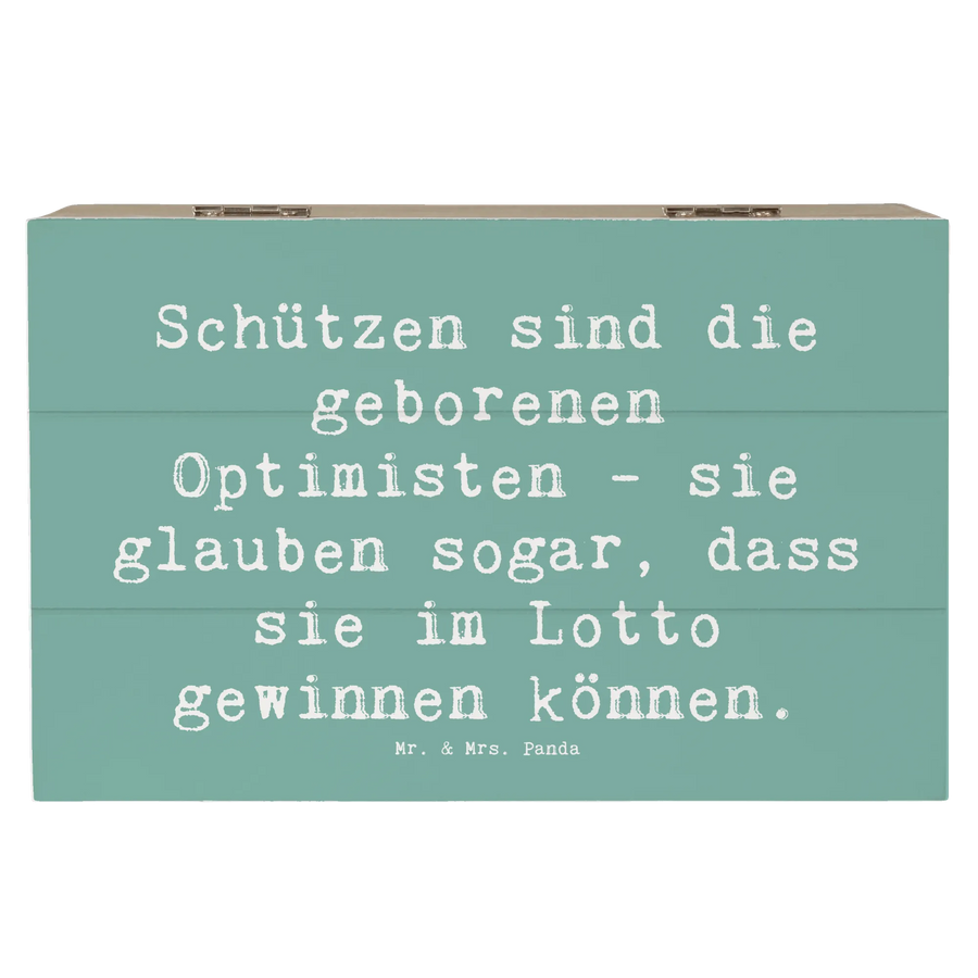 Die Einschlagscharniere ermöglichen ein einfaches Öffnen und Schließen der Kiste, sodass Du jederzeit Zugriff auf Deine Schätze hast. Der Spruch "Schützen sind die geborenen Optimisten - sie glauben sogar, dass sie im Lotto gewinnen können." bringt ein Lächeln ins Gesicht und passt perfekt zu den optimistischen Eigenschaften, die dieses Sternzeichen auszeichnet.