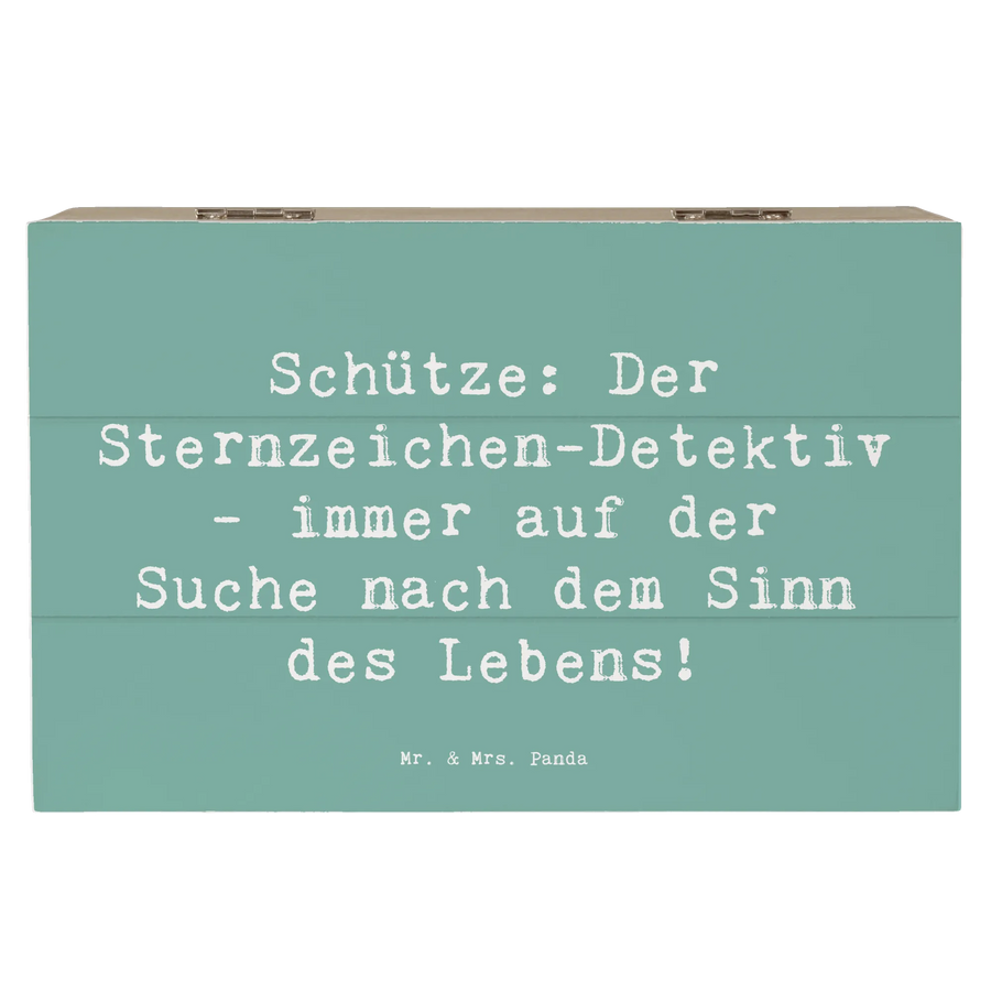 Entdecke die wundervolle Holzkiste von Mr. & Mrs. Panda, die nicht nur ein idealer Aufbewahrungsort für deine Schätze ist, sondern auch ein zauberhaftes Geschenk für jeden Schützen und Astrologie-Liebhaber. Diese spezielle Kiste aus robuster Holzfaser ist bedruckt mit einem liebevollen Motiv, das das Sternzeichen Schütze repräsentiert. Der Spruch "Schütze: Der Sternzeichen-Detektiv - immer auf der Suche nach dem Sinn des Lebens!" strahlt eine positive Energie aus und bringt jeden zum Schmunzeln.