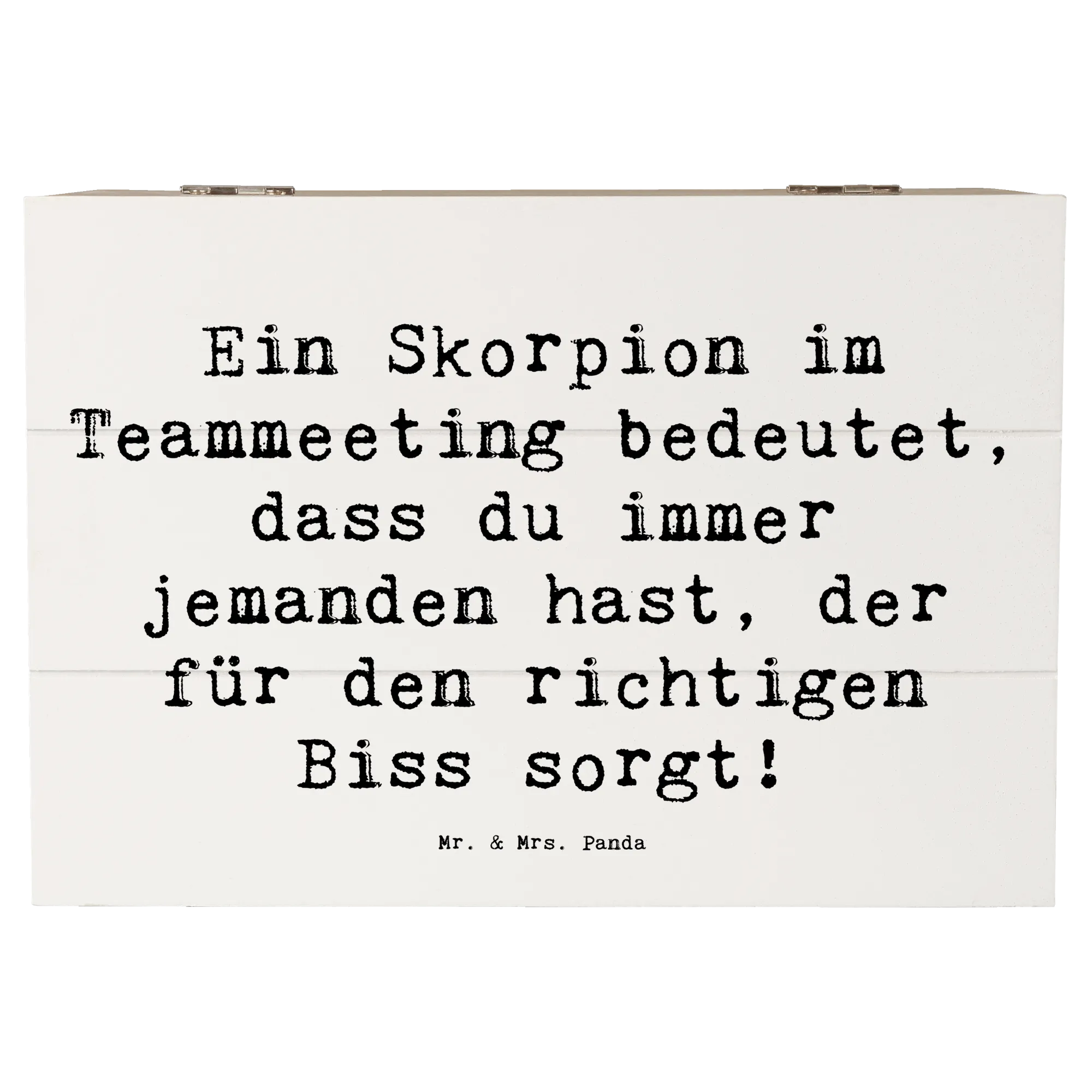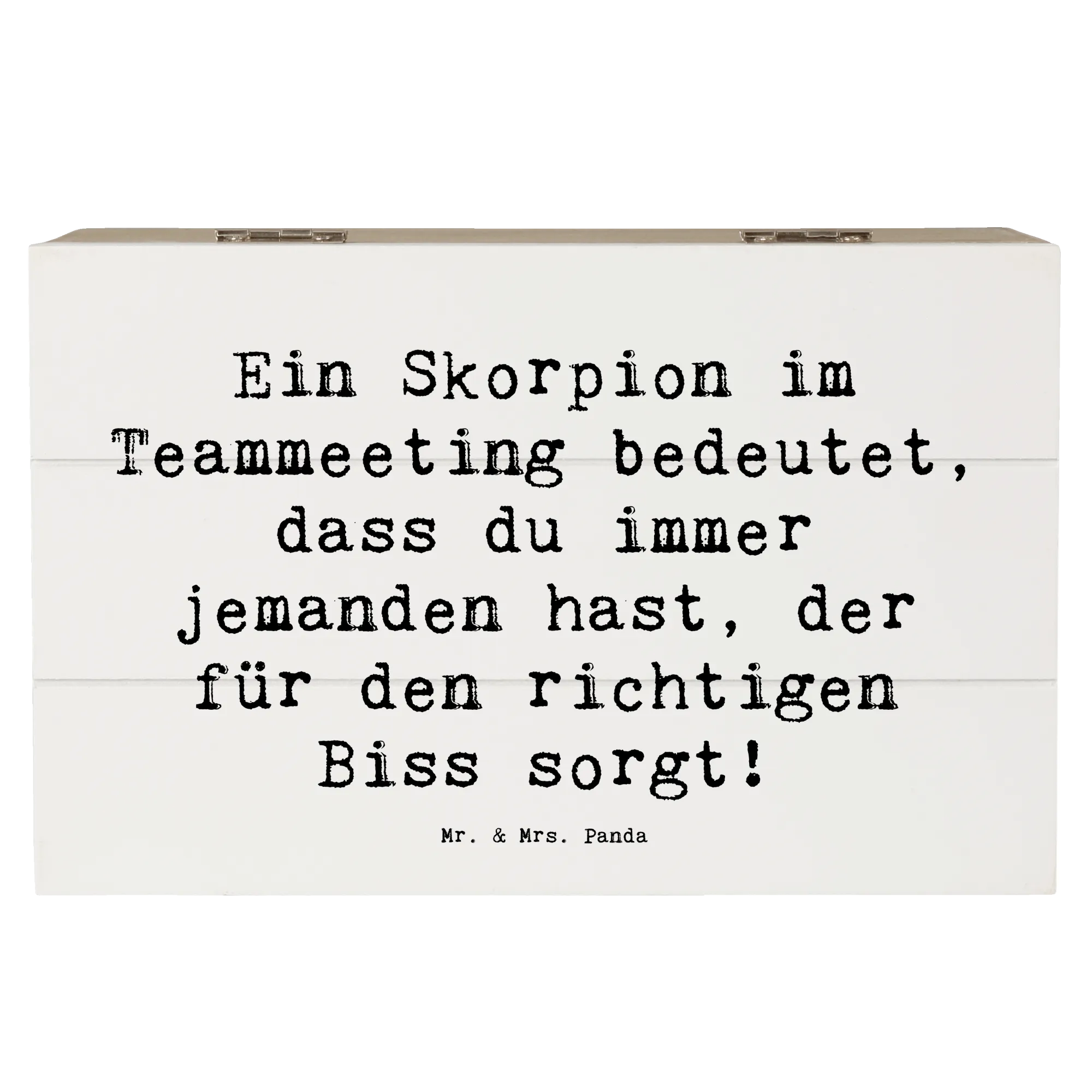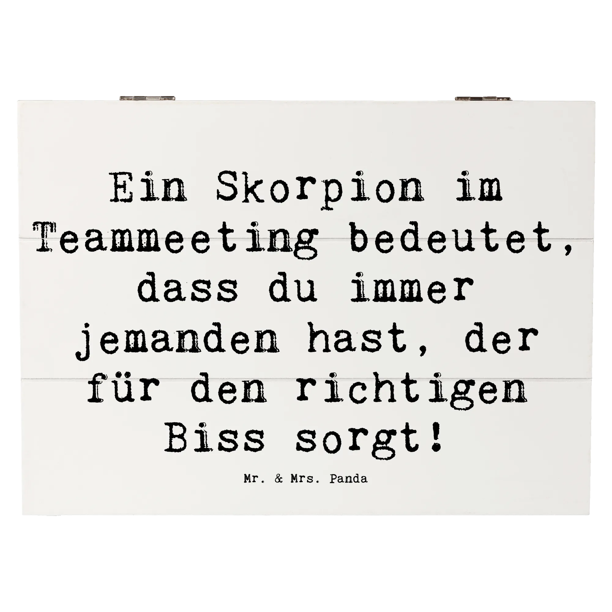 Diese Holzkiste begeistert nicht nur durch ihre Funktionalität, sondern auch durch ihr zauberhaftes Design. Der Spruch "Ein Skorpion im Teammeeting bedeutet, dass du immer jemanden hast, der für den richtigen Biss sorgt!" sorgt für Schmunzeln und macht diese Kiste zu einem ganz besonderen Geschenk. Ideal für Festlichkeiten, Kommunion, Konfirmation oder einfach als charmante Geschenkbox für Familie und Freunde.
