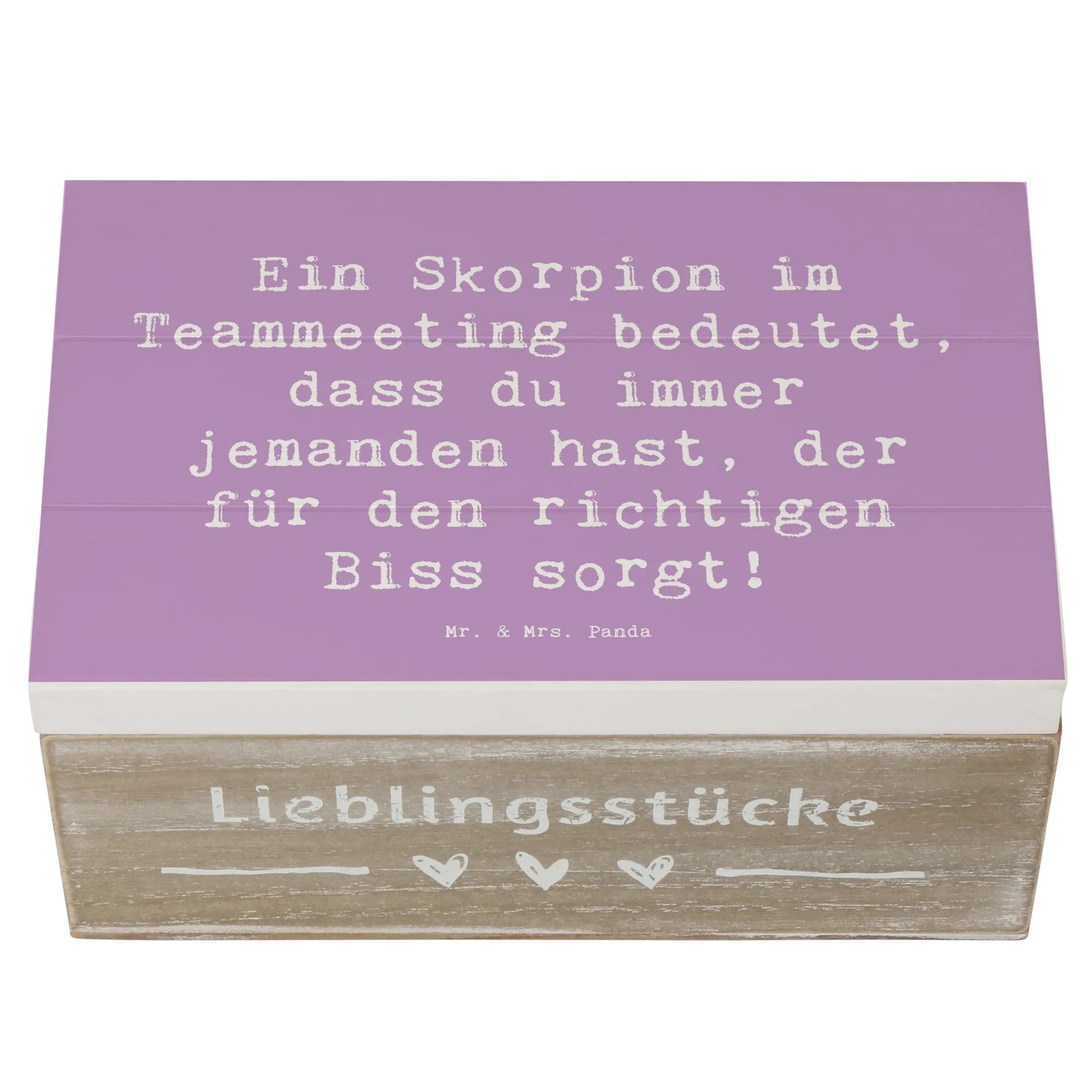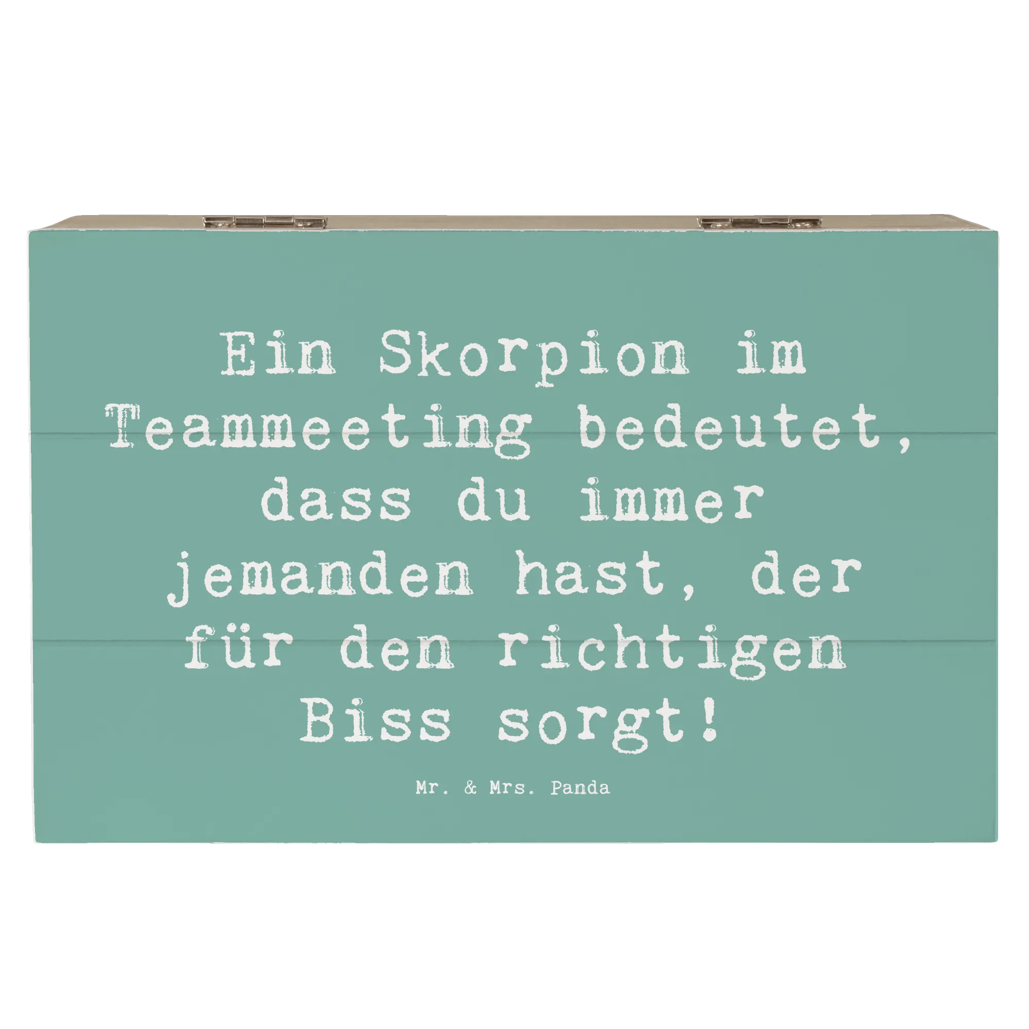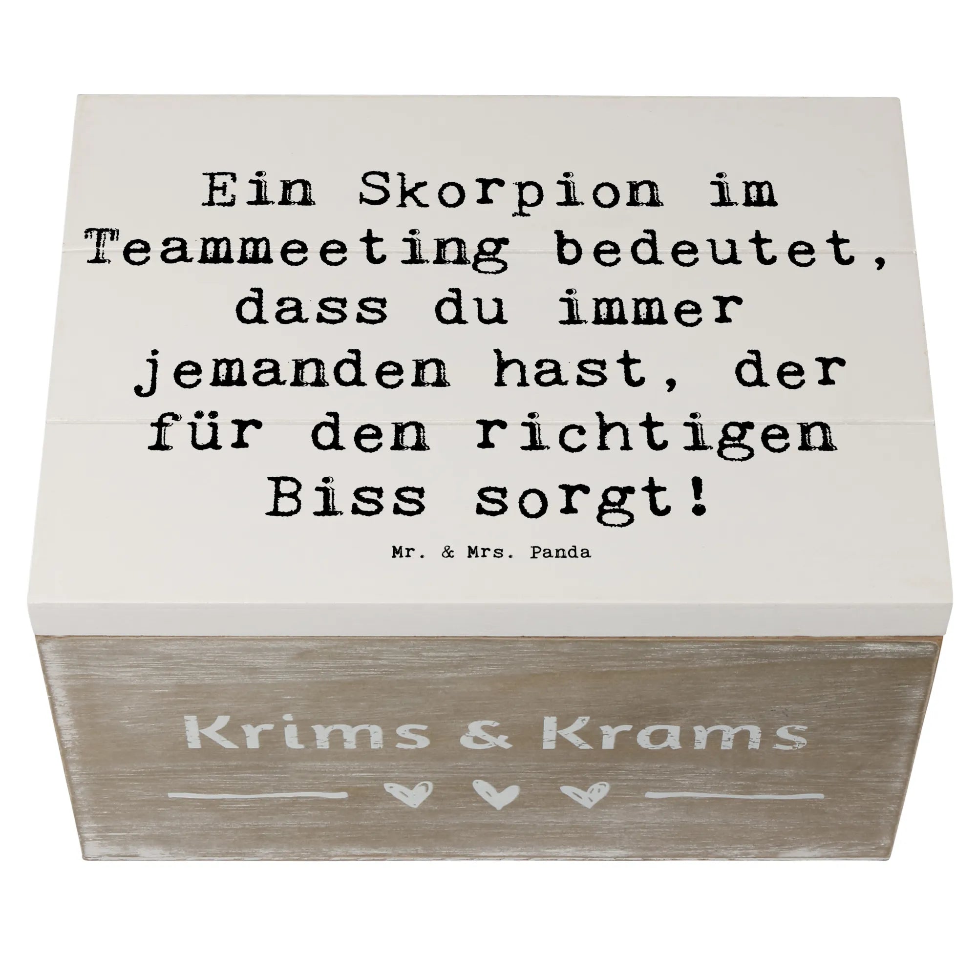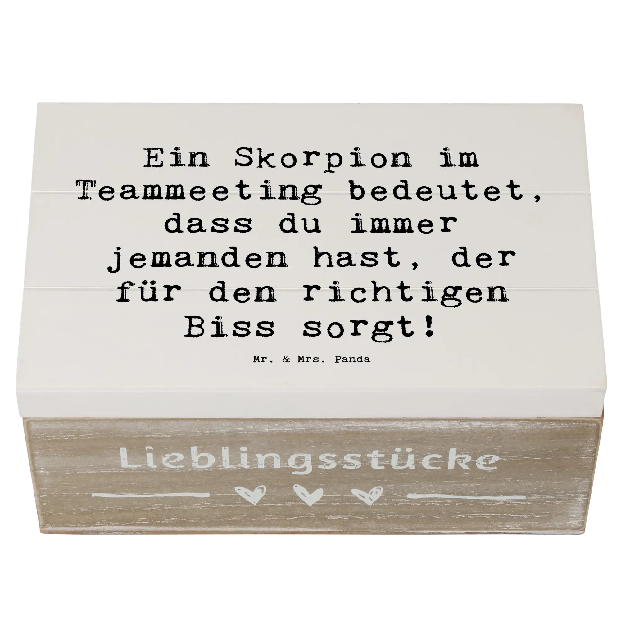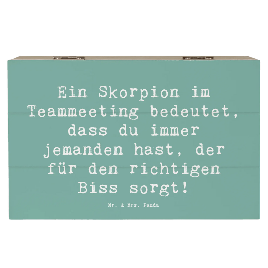 Die robuste Holzfaser sorgt dafür, dass die Kiste stabil und langlebig ist. Das besondere Design wird durch den charmanten Spruch „Ein Skorpion im Teammeeting bedeutet, dass du immer jemanden hast, der für den richtigen Biss sorgt!“ ergänzt, der als humorvolle Erinnerung dient, wie wichtig es ist, den richtigen Biss im Leben zu finden. Mit ihrer einzigartigen Optik und den sanften Farben passt sie sowohl in dein Wohnambiente als auch als Liebesbeweis an deine Freunde und Familie.