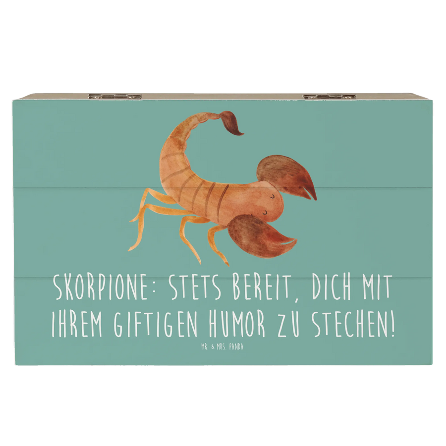 Mit den Maßen von 19 x 12 cm bietet sie genügend Platz für all die besonderen Dinge in Deinem Leben, die Du nicht verlieren möchtest. Die Holzkiste ist nicht nur praktisch, sondern auch ein toller Dekorationsgegenstand für Dein Zuhause oder das Kinderzimmer. Der Spruch 'Skorpione: Stets bereit, dich mit ihrem giftigen Humor zu stechen!' verleiht der Kiste einen humorvollen Touch und macht sie zu einem ganz besonderen Geschenk.