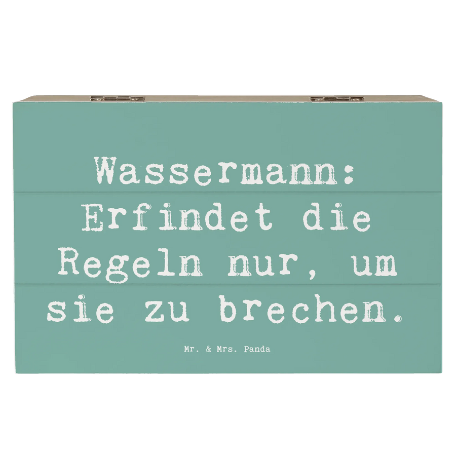 Entdecke die zauberhafte Holzkiste für Wassermann-Fans! Diese wunderschöne Holzkiste von Mr. & Mrs. Panda ist nicht nur ein echter Blickfang, sondern bietet auch den perfekten Aufbewahrungsort für deine wertvollsten Schätze. Egal, ob du Erinnerungen aus der Kindheit aufbewahren möchtest, die besonderen Momenten deines Lebens eine sichere Heimat bieten willst oder einfach nur eine stilvolle Dekokiste suchst – diese Kiste ist genau die richtige Wahl. Mit den liebevoll handgezeichneten Motiven und dem charakteristischen Spruch "Wassermann: Erfindet die Regeln nur, um sie zu brechen" wird sie zum idealen Geschenk für Freunde und Familie, die unter dem Sternzeichen Wassermann geboren sind.