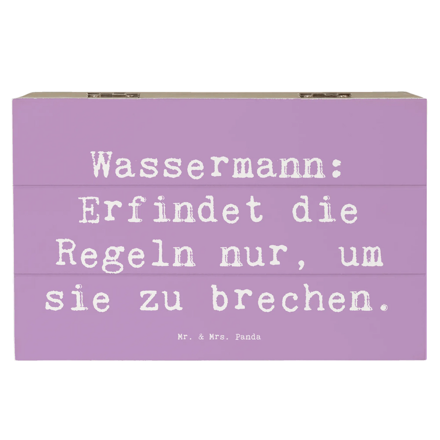 Entdecke die zauberhafte Holzkiste für Wassermann-Fans! Diese wunderschöne Holzkiste von Mr. & Mrs. Panda ist nicht nur ein echter Blickfang, sondern bietet auch den perfekten Aufbewahrungsort für deine wertvollsten Schätze. Egal, ob du Erinnerungen aus der Kindheit aufbewahren möchtest, die besonderen Momenten deines Lebens eine sichere Heimat bieten willst oder einfach nur eine stilvolle Dekokiste suchst – diese Kiste ist genau die richtige Wahl. Mit den liebevoll handgezeichneten Motiven und dem charakteristischen Spruch "Wassermann: Erfindet die Regeln nur, um sie zu brechen" wird sie zum idealen Geschenk für Freunde und Familie, die unter dem Sternzeichen Wassermann geboren sind.
