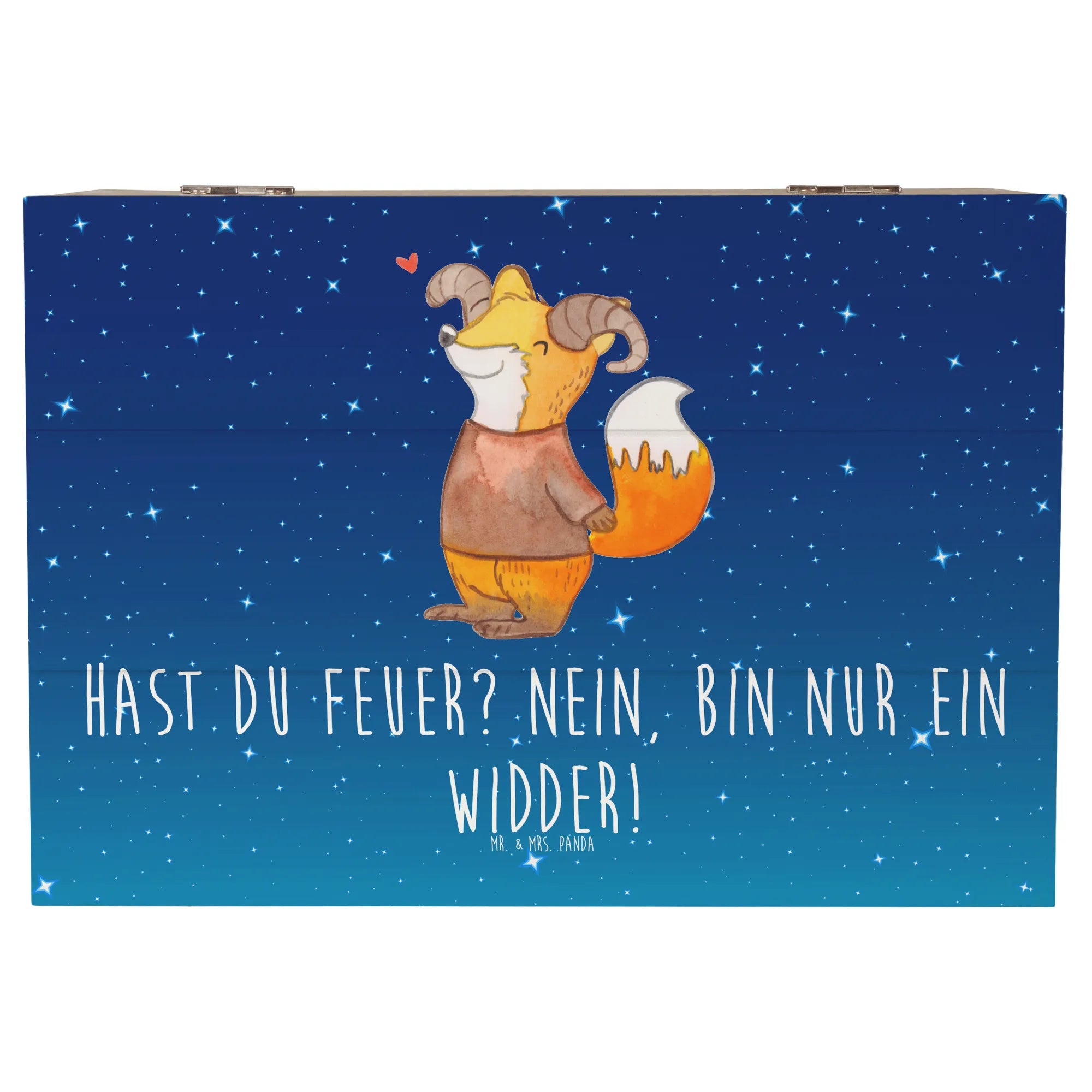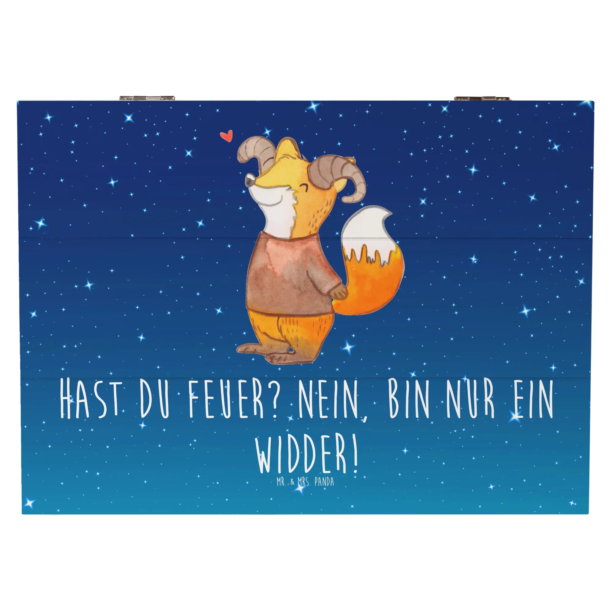 Die Holzkiste Widder von Mr. & Mrs. Panda ist das perfekte Geschenk für alle, die das Sternzeichen Widder lieben oder selbst dazu gehören. Diese wunderschöne Holzkiste, gefertigt aus hochwertiger Premium Hartfaser, ist nicht nur ein praktisches Aufbewahrungsobjekt, sondern auch ein echter Hingucker. Mit der Aufschrift "Hast du Feuer? Nein, bin nur ein Widder!" bringt sie ein Lächeln in jedes Gesicht und sorgt für gute Laune. Egal, ob zur Geburtstagsfeier, zur Konfirmation oder einfach als kleine Aufmerksamkeit zwischendurch – diese Kiste ist vielseitig einsetzbar.