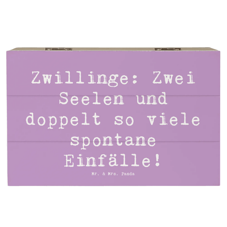 Die wunderschöne Holzkiste von Mr. & Mrs. Panda ist das perfekte Geschenk für alle Zwillinge. Ob zur Kommunion, Konfirmation oder als Aufbewahrungsort für die schönsten Erinnerungen, diese Erinnerungskiste aus robuster Holzfaser vereint Funktionalität mit einem tollen Design. Der originelle Spruch "Zwillinge: Zwei Seelen und doppelt so viele spontane Einfälle!" sorgt für ein Lächeln bei jeder Gelegenheit.