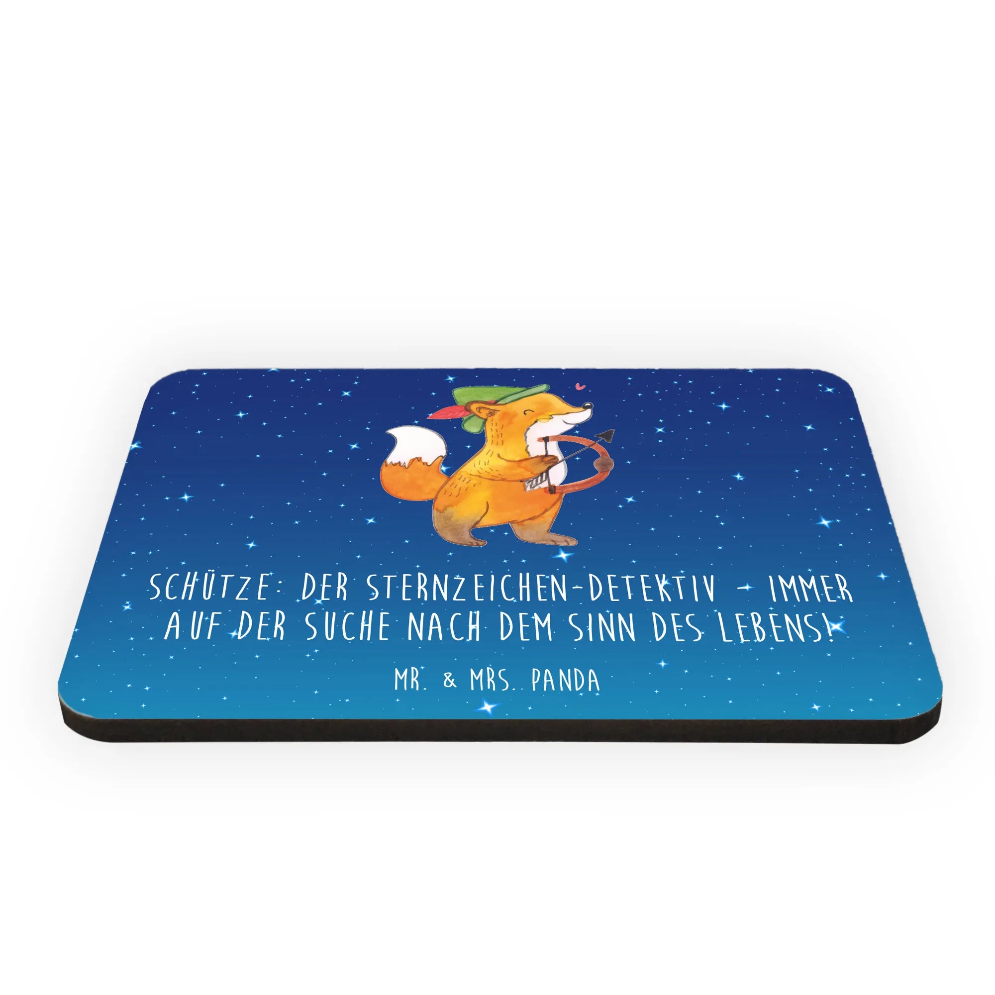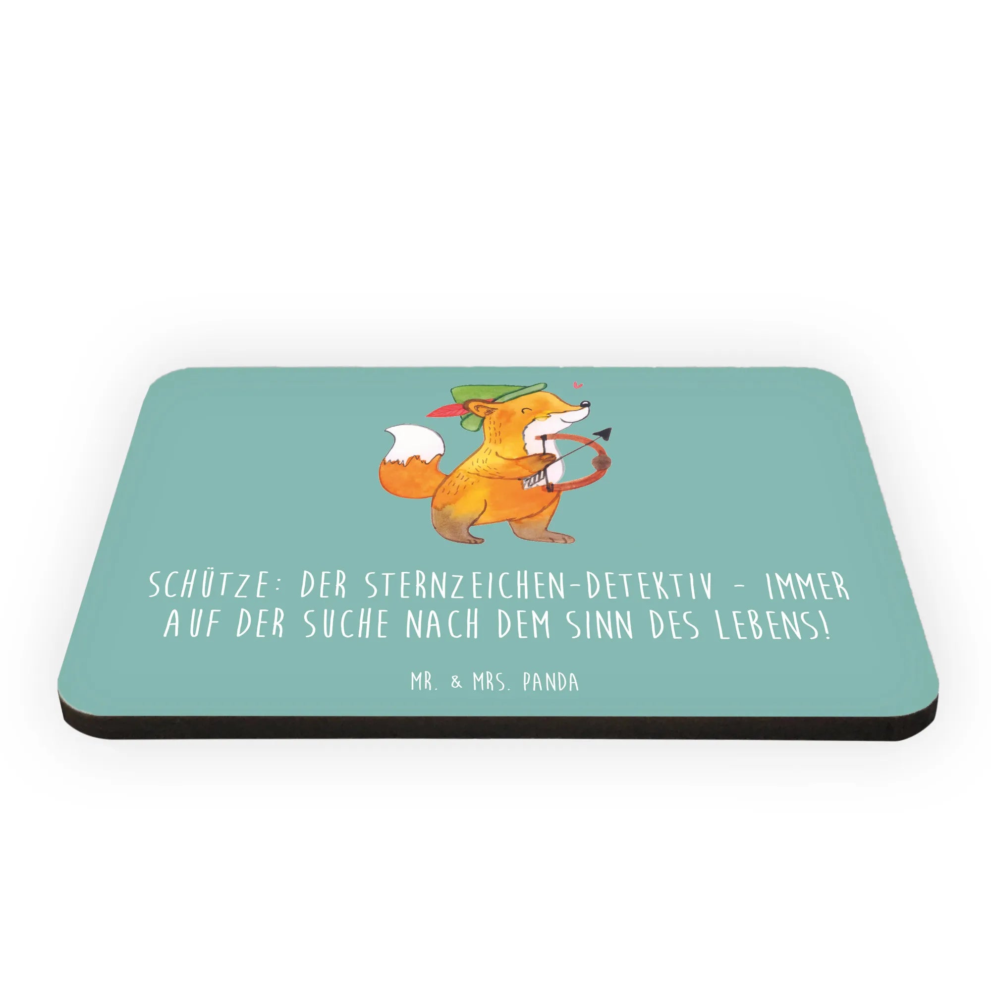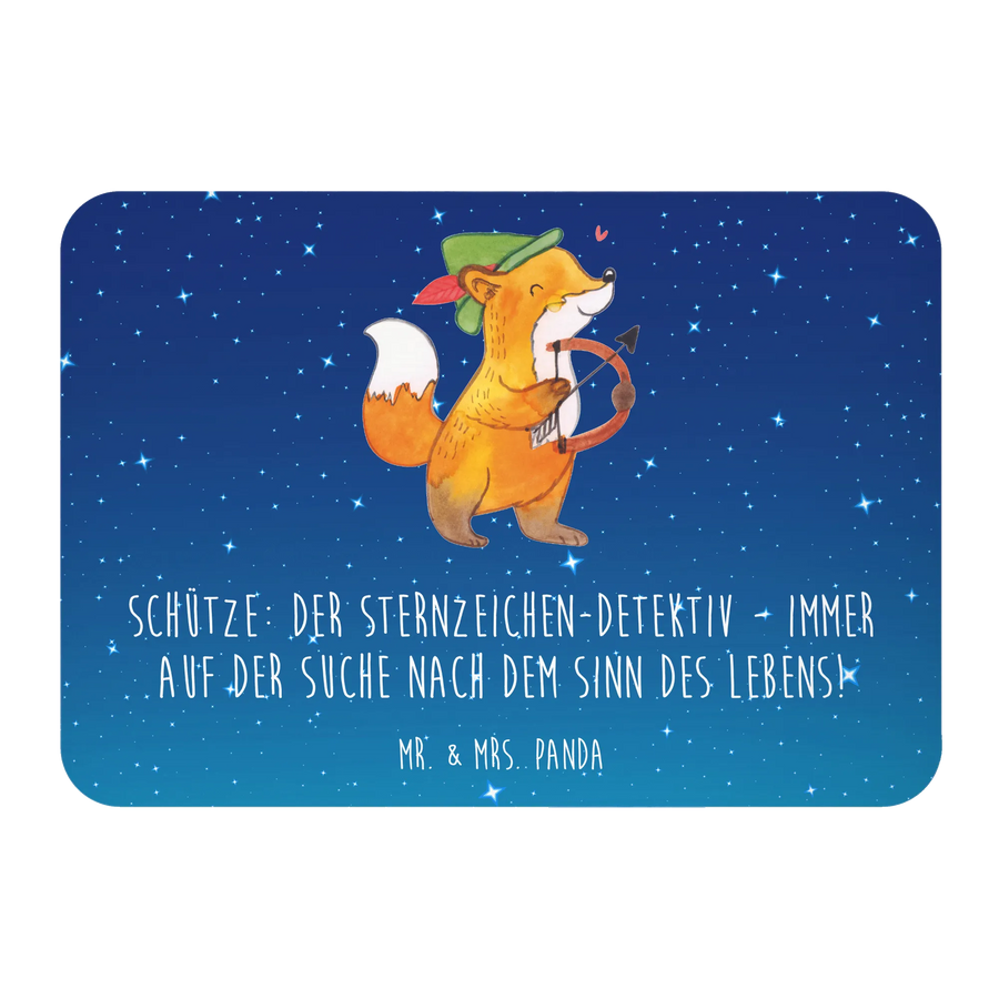 Der Kühlschrankmagnet "Schütze: Der Sternzeichen-Detektiv - immer auf der Suche nach dem Sinn des Lebens!" aus der besonderen Kollektion von Mr. & Mrs. Panda ist das perfekte Geschenk für all jene, die an Astrologie und den Geheimnissen der Sternzeichen interessiert sind.