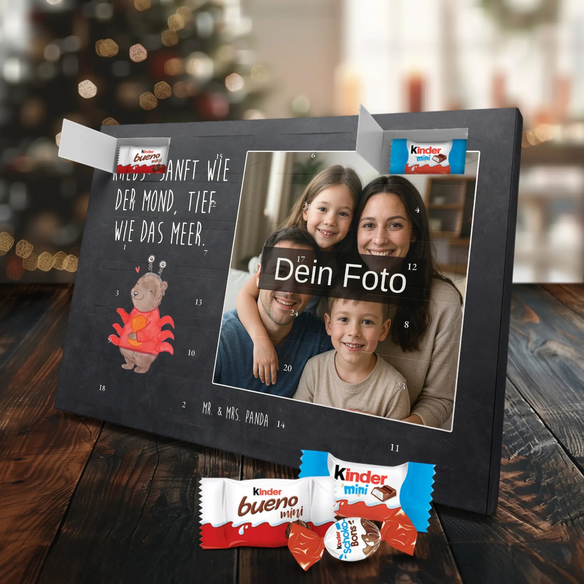 Schoko Foto Adventskalender personalisiert – ein zauberhaftes Produkt von Mr. & Mrs. Panda, das Erinnerungen und Süßigkeiten kombiniert. Gestalte die Vorderseite mit einem persönlichen Foto und überrasche deine Liebsten jeden Tag im Advent. Unsere Designs mit niedlichen Illustrationen und liebevollen Sprüchen runden das Foto perfekt ab. Bitte lade ein hochauflösendes Foto hoch und prüfe den Bildausschnitt, damit das Druckbild optimal wird. Verwende nur Bilder, für die du die Rechte besitzt oder die Freigabe der abgebildeten Personen vorliegt. Beachte: Wir schneiden oder bearbeiten die Fotos nicht; personalisierte Foto-Artikel sind von der Rückgabe ausgeschlossen. Der Kalender besticht durch brillante Druckqualität, seidenmatte Oberflächenveredelung und bedruckte Seitenflächen für ein hochwertiges Finish. Maße: 355 mm x 245 mm x 11 mm. Du kannst den Kalender aufstellen oder ihn an der Wand aufhängen. Gefüllt mit kinder® Schokolade – inklusive kinder® Schoko-Bons, kinder® Bueno mini und kinder® Schokolade mini. Ein warmherziges, persönliches Geschenk mit dem typischen Mr. & Mrs. Panda Flair, das Vorfreude und Geschmack vereint.