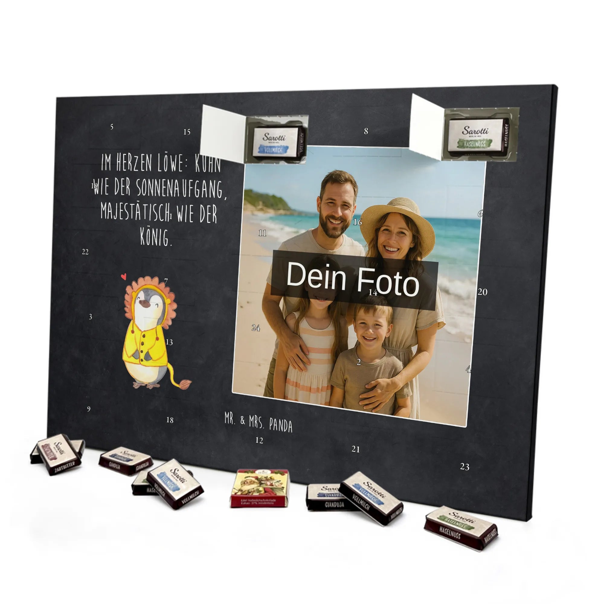 Personalisierter Schoko-Adventskalender mit Foto – das kleine Weihnachtswunder von Mr. & Mrs. Panda! Verschenke jeden Tag Vorfreude: Der Kalender ist liebevoll gestaltet mit unseren herzlichen Illustrationen und Sprüchen, während dein Foto die persönliche Mitte bildet. Bitte lade ein hochauflösendes Foto hoch und prüfe den Bildausschnitt, damit nichts Wichtiges verloren geht. Nutze nur Bilder, für die du die Rechte hast. Die hochwertige, seidenmatte Veredelung und die bedruckten Seitenflächen garantieren ein edles Erscheinungsbild. Maße: 355 mm x 245 mm x 11 mm; lässt sich sowohl aufhängen als auch aufstellen. Achtung: Fotos werden nicht nachbearbeitet oder zugeschnitten; personalisierte Artikel sind vom Rückgaberecht ausgeschlossen. Gefüllt mit 24 einzeln verpackten Schokoladentäfelchen aus den vier Geschmacksrichtungen Vollmilch, Nougat, Zartbitter und Haselnuss – von Sarotti® und Confiserie Heidel®. Insgesamt enthält der Kalender 107 g Markenschokolade. Ein persönliches Geschenk mit süßem Inhalt, ideal für Partner, Familie und Freunde, verpackt mit der typischen Mr. & Mrs. Panda Liebe zum Detail.