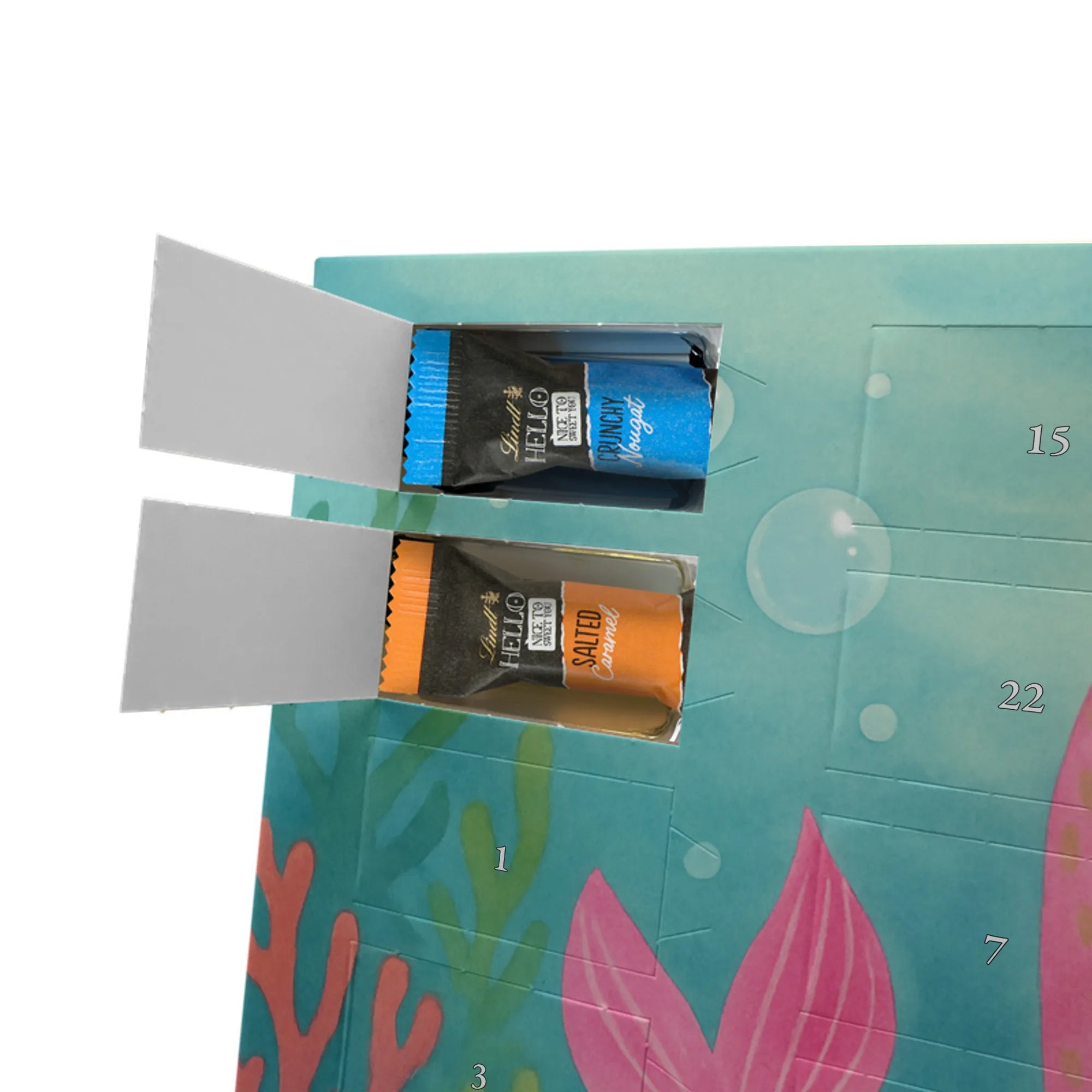 🐼 LINDT HELLO ADVENTSKALENDER: Liebevoll bedruckt, seidenmatte Veredelung, 325×225×27 mm.