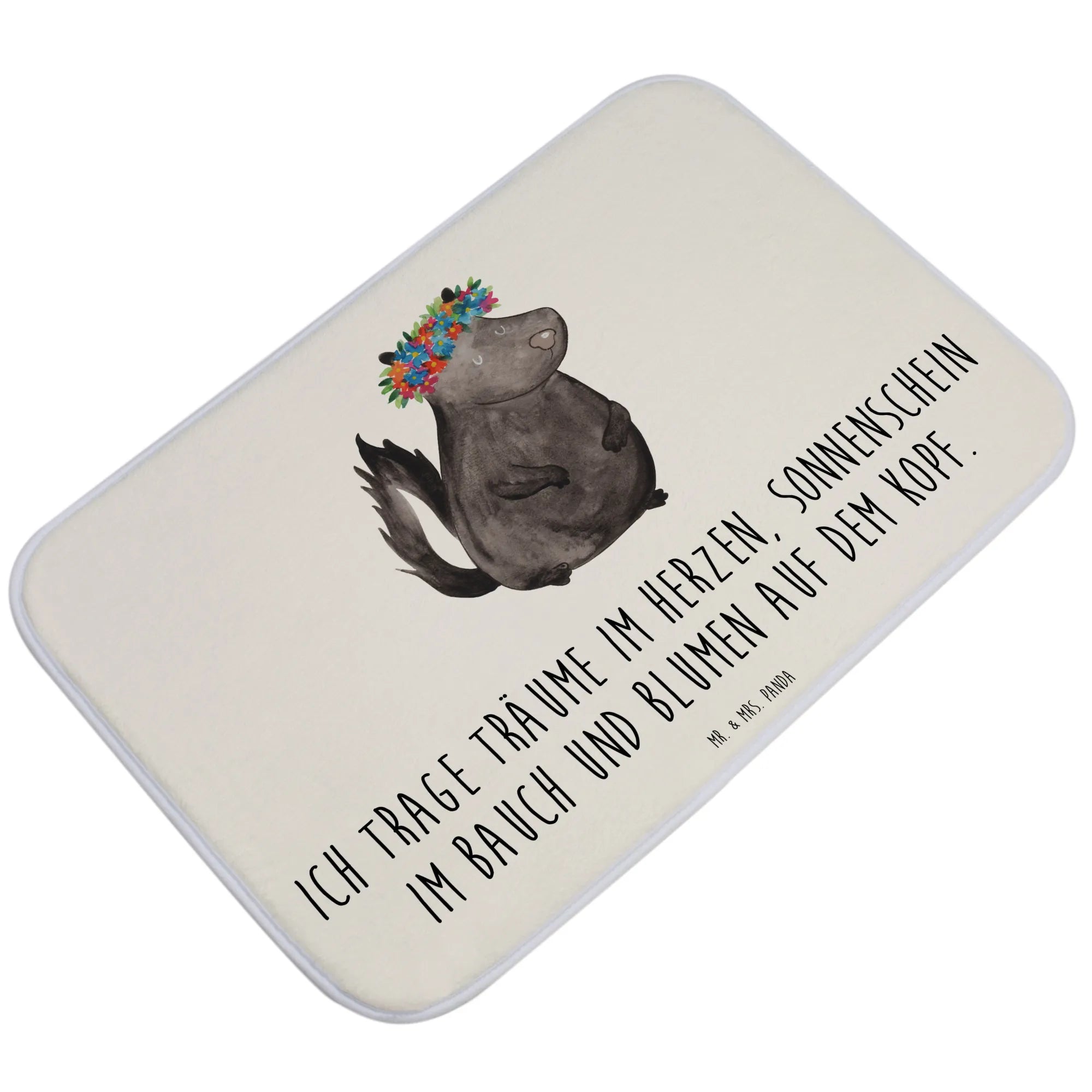 Willkommen in der zauberhaften Welt unserer Stinktier Blumenmädchen Badematte von Mr. & Mrs. Panda! Diese wunderschöne Badvorleger vereint stylisches Design mit einem hohen Maß an Funktionalität. Mit dem fröhlichen Motiv eines süßen Stinktieres, das einen bunten Blumenkranz auf dem Kopf trägt, bringt dieser Badteppich eine frische, lebendige Note in dein Badezimmer. Ideal für Tierliebhaber und Naturfreunde, ist unsere Badmatte das perfekte Geschenk für jeden Anlass. Ob zur Einweihung, zum Geburtstag oder als kleine Aufmerksamkeit für die beste Freundin – dieser Badezimmerteppich zaubert jedem ein Lächeln ins Gesicht!