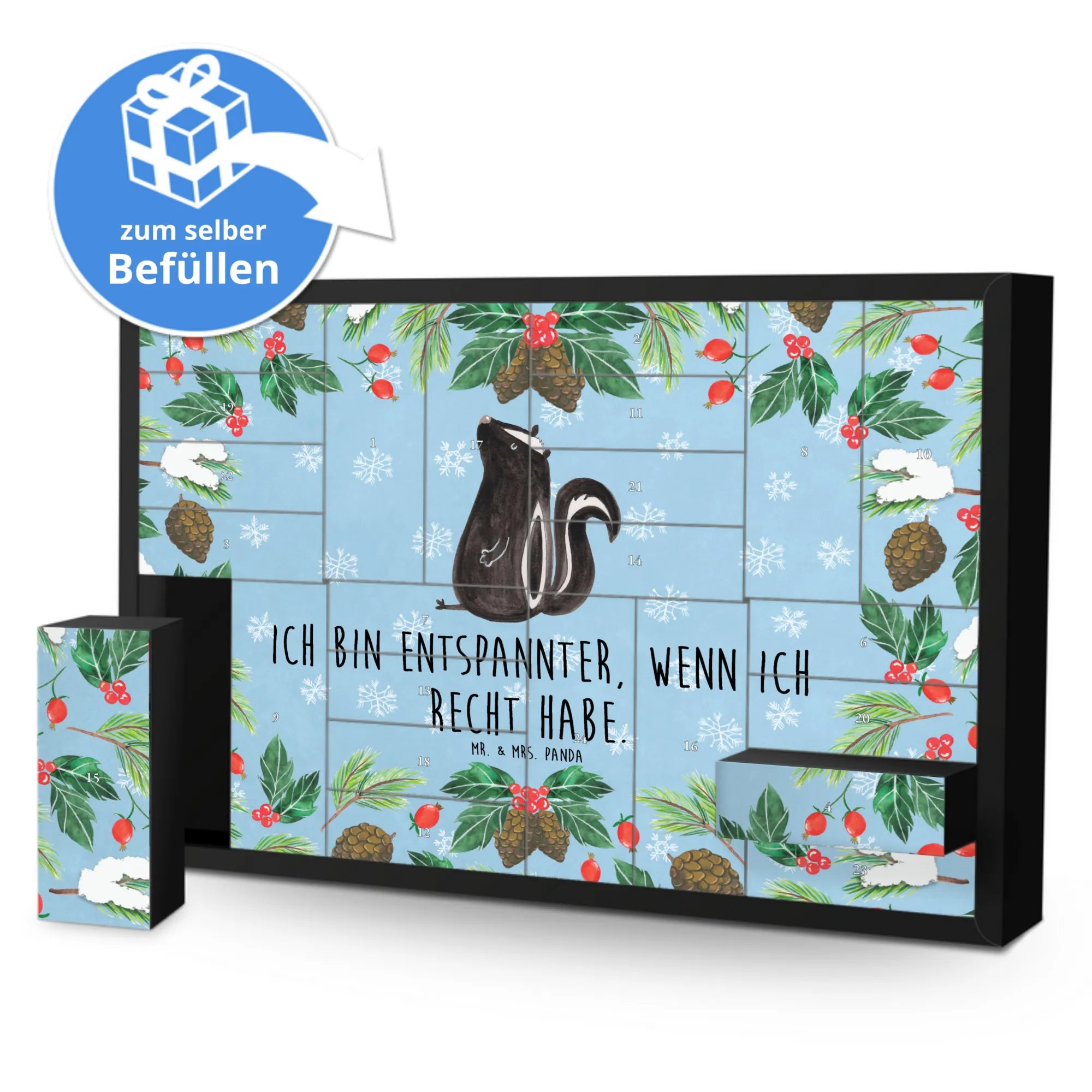 Der wunderschöne, befüllbare Adventskalender mit dem niedlichen Motiv des sitzenden Stinktieres aus der Stinktier-Kollektion von Mr. & Mrs. Panda ist das perfekte Geschenk für dich oder deine liebsten Menschen in der Adventszeit. Mit einem inspirierenden Spruch "Ich bin entspannter, wenn ich Recht habe" bringt dieser Adventskalender nicht nur Freude, sondern auch ein Lächeln in jedes Gesicht.