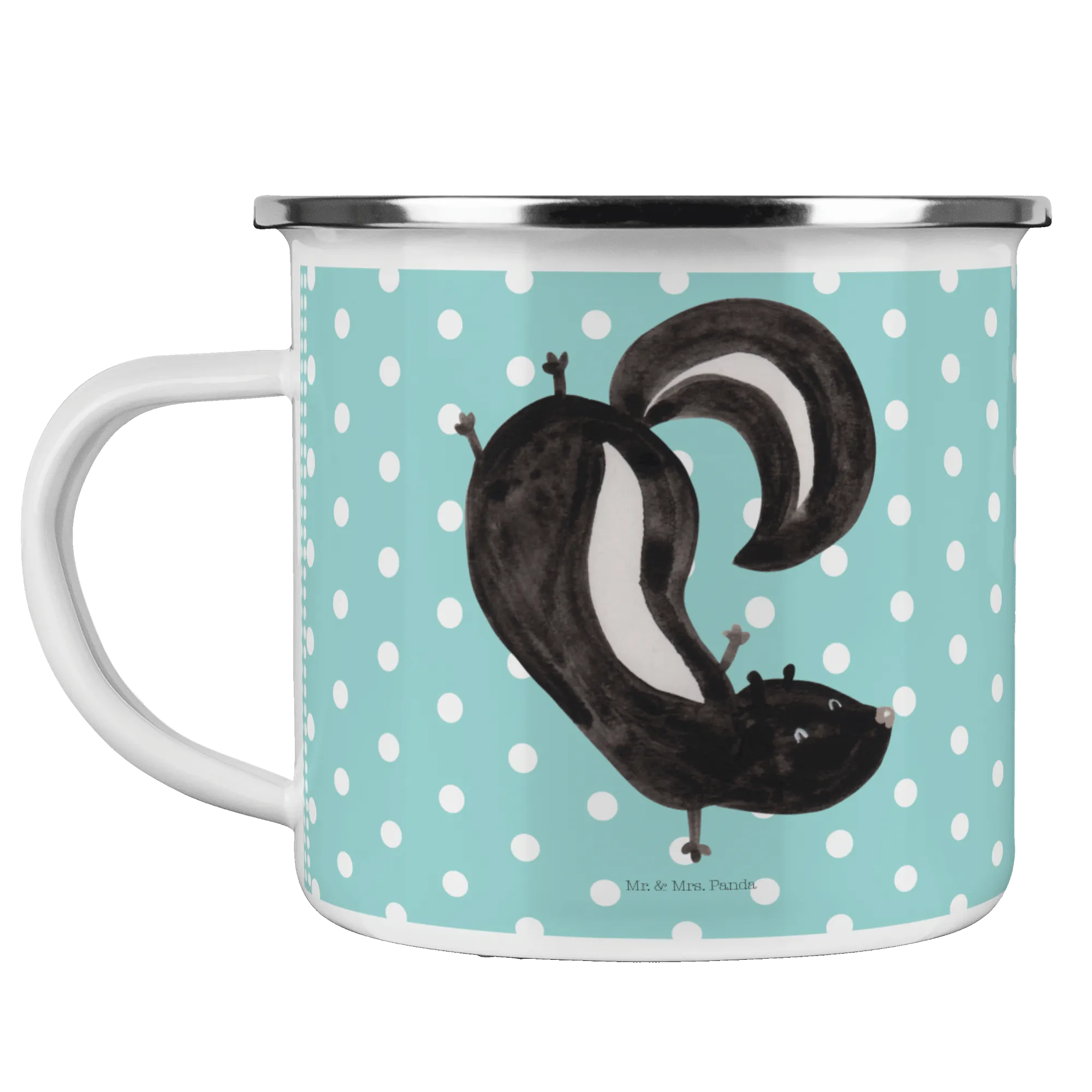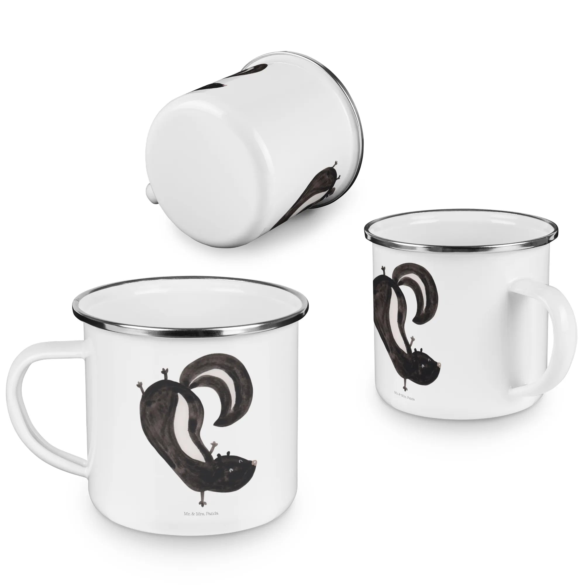 Die Camping Emaille Tasse mit dem süßen Motiv 'Stinktier Handstand' von Mr. & Mrs. Panda ist das perfekte Geschenk für alle Naturliebhaber und Outdoor-Fans! Diese Tasse hat einen Durchmesser von 80 mm und eine Füllmenge von 300 ml – ideal für heißen Kaffee nach einer langen Wanderung oder für den erfrischenden Tee am Lagerfeuer.