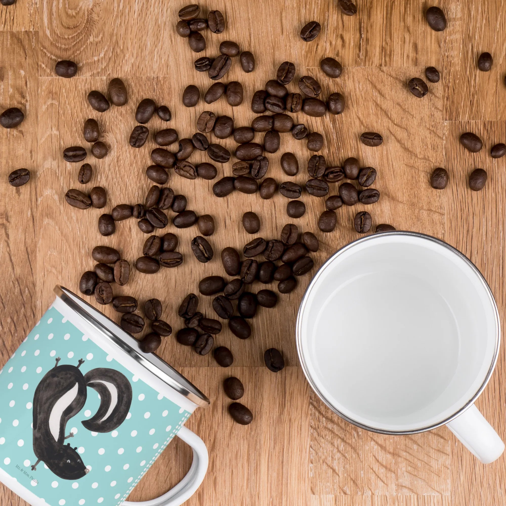 Was macht diese Emaille Tasse so besonders? Das süße Stinktier, das athletisch einen Handstand macht, wurde liebevoll in Aquarell gemalt und verleiht der Tasse einen liebevollen Touch. Du kannst einfach nicht genug von Stinktieren bekommen? Dann wird dieses Design dein Herz höher schlagen lassen und garantiert viele Blicke auf sich ziehen! Diese Tasse bringt mit ihrem fröhlichen Motiv nicht nur gute Stimmung, sondern vermittelt auch das Gefühl von Abenteuerlust und Freiheit.