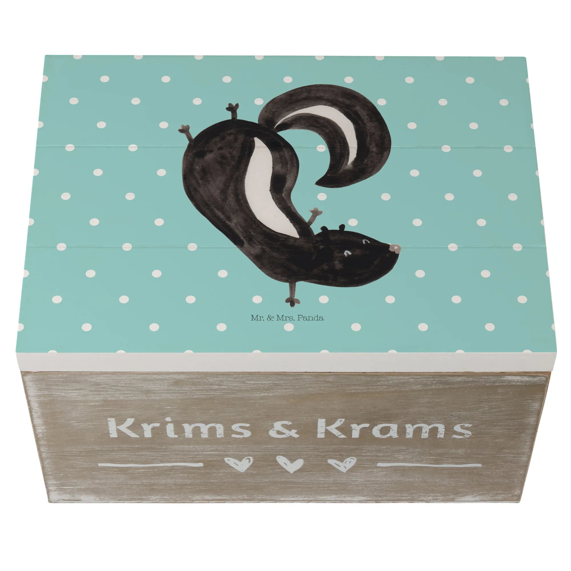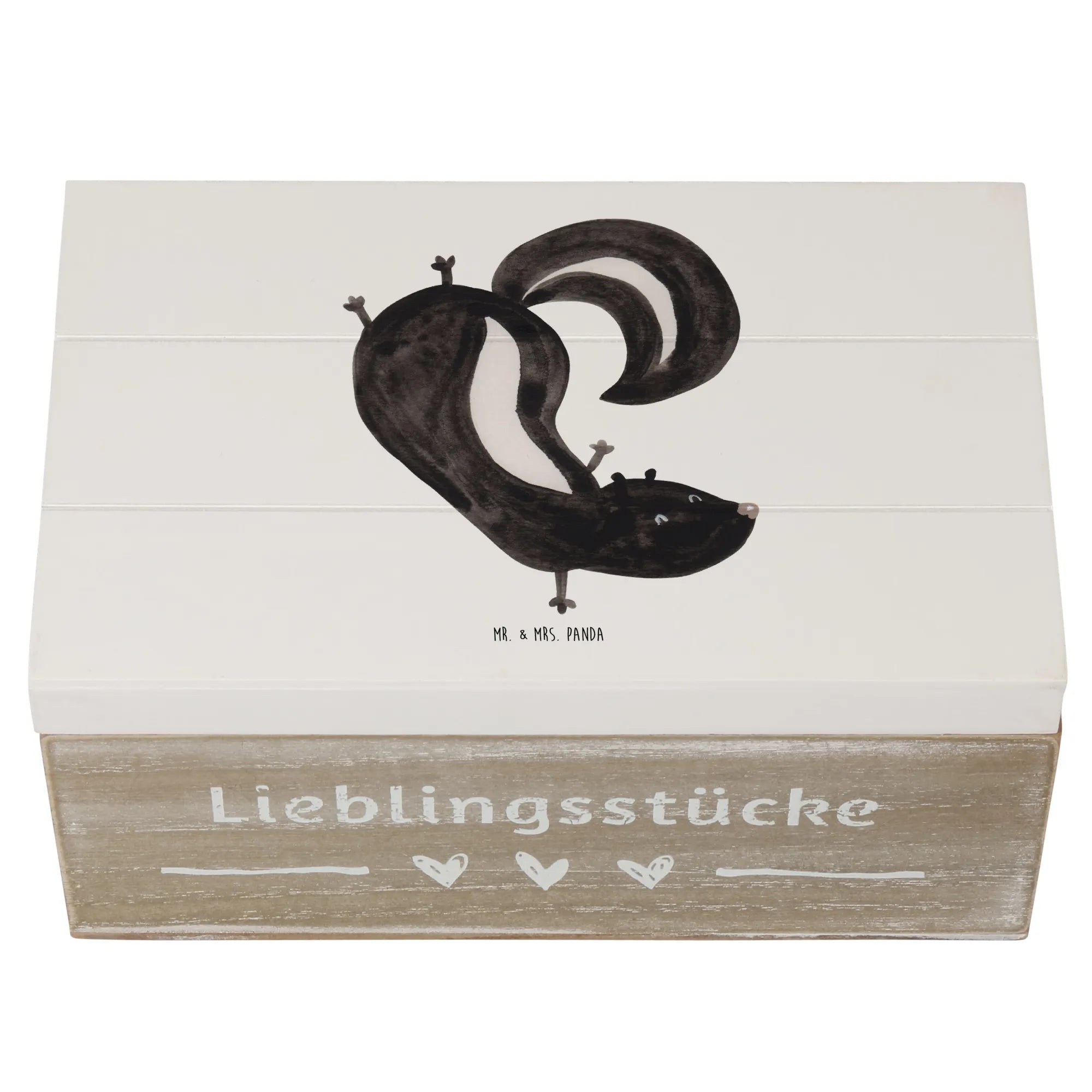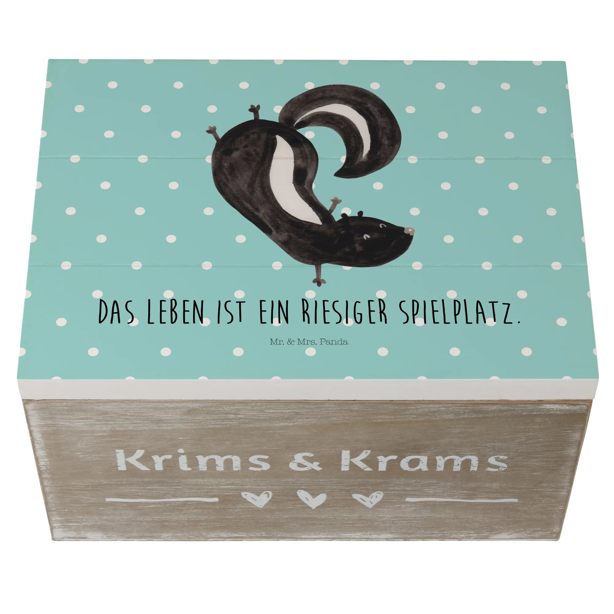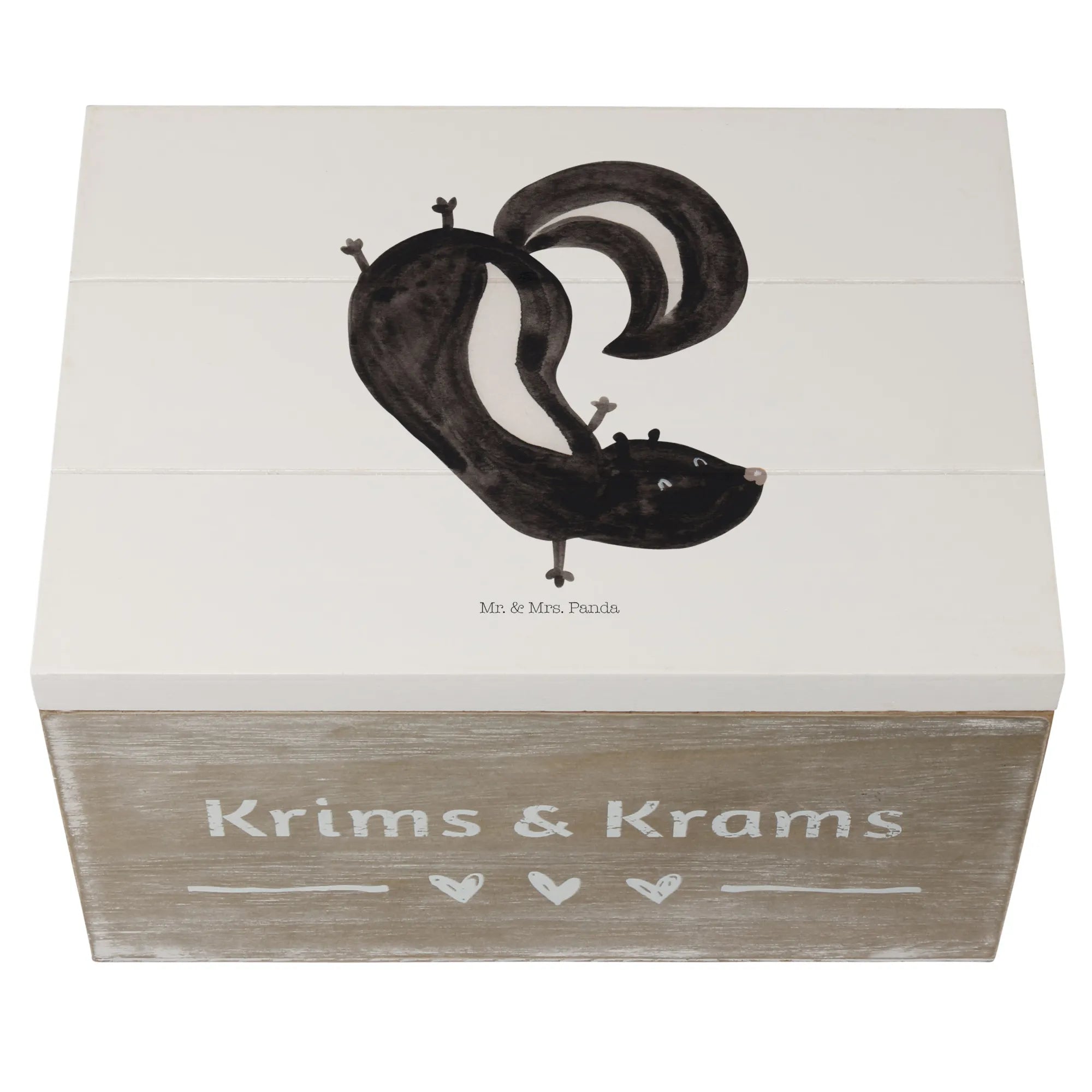 Die wunderschöne Holzkiste mit dem einzigartigen Motiv 'Stinktier Handstand' von Mr. & Mrs. Panda ist das perfekte Geschenk für Jung und Alt. Ob als Schatzkiste für die eigenen vier Wände oder als besondere Erinnerungskiste für besondere Anlässe – diese Box ist vielfältig verwendbar.