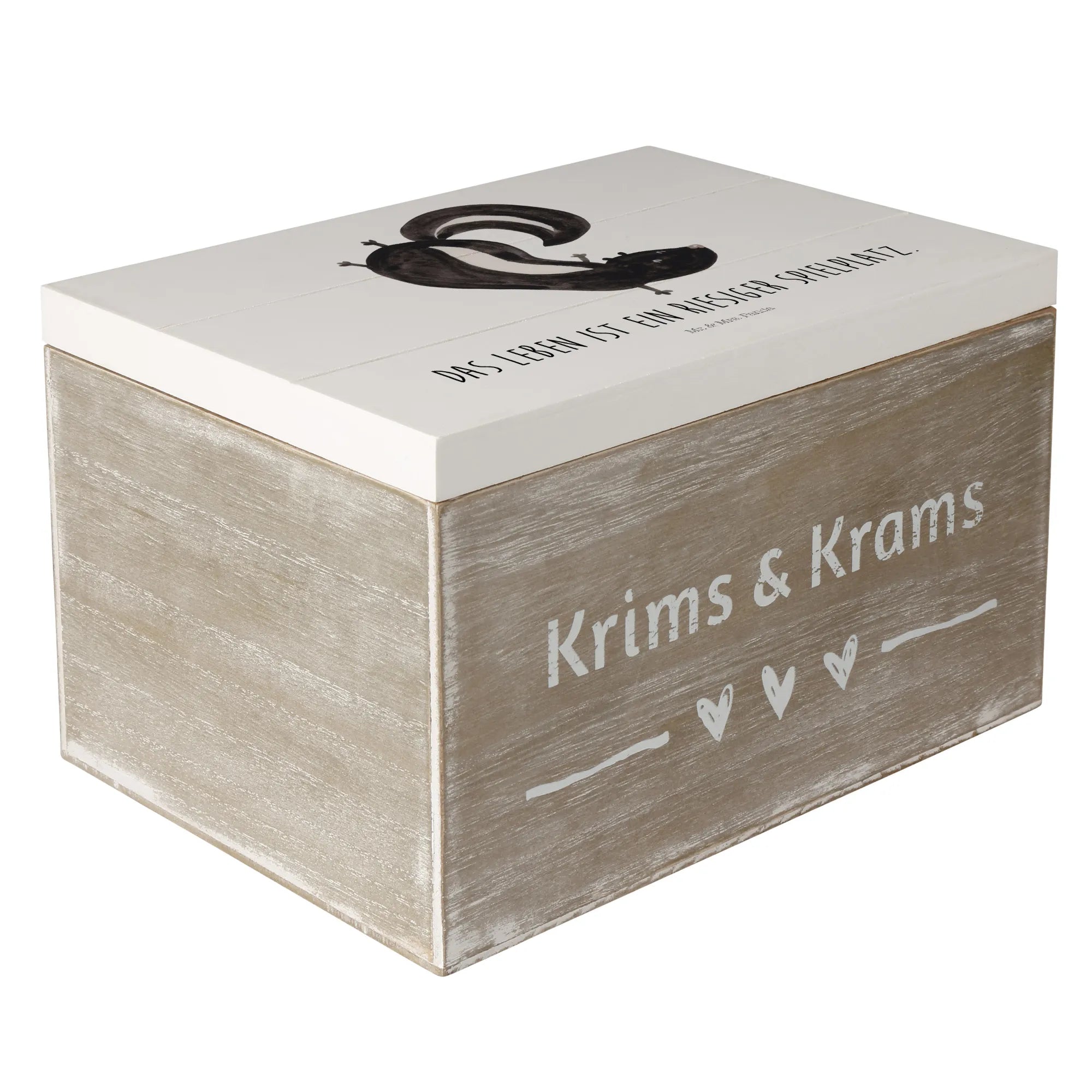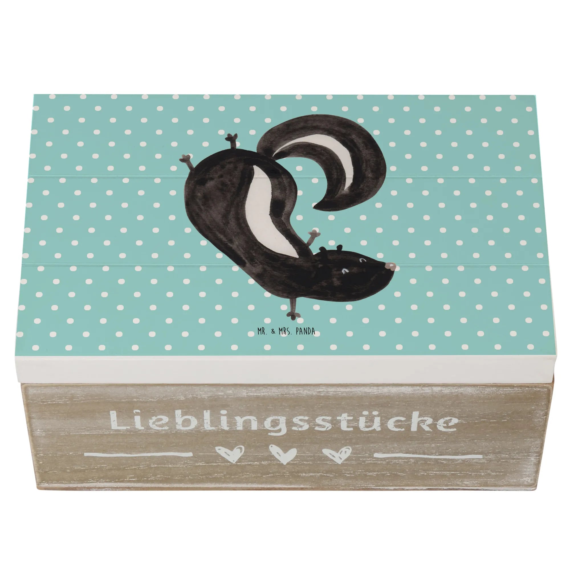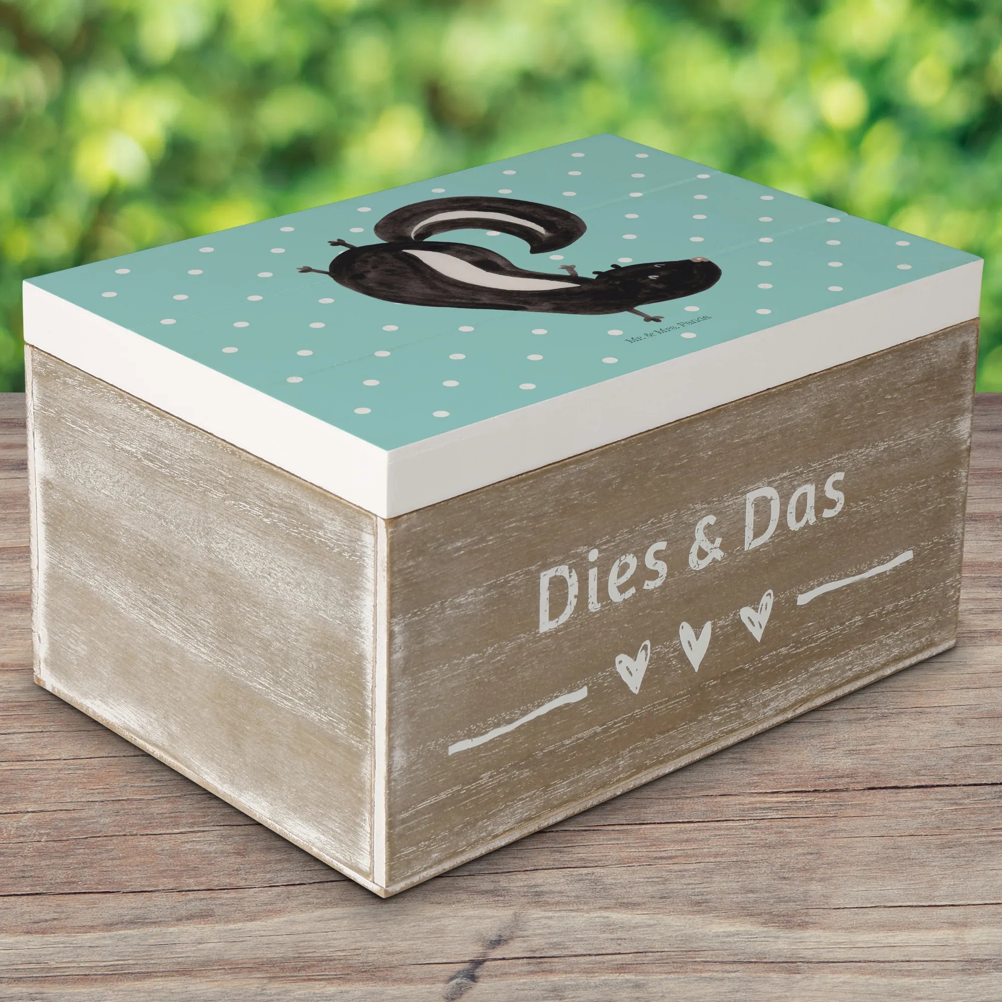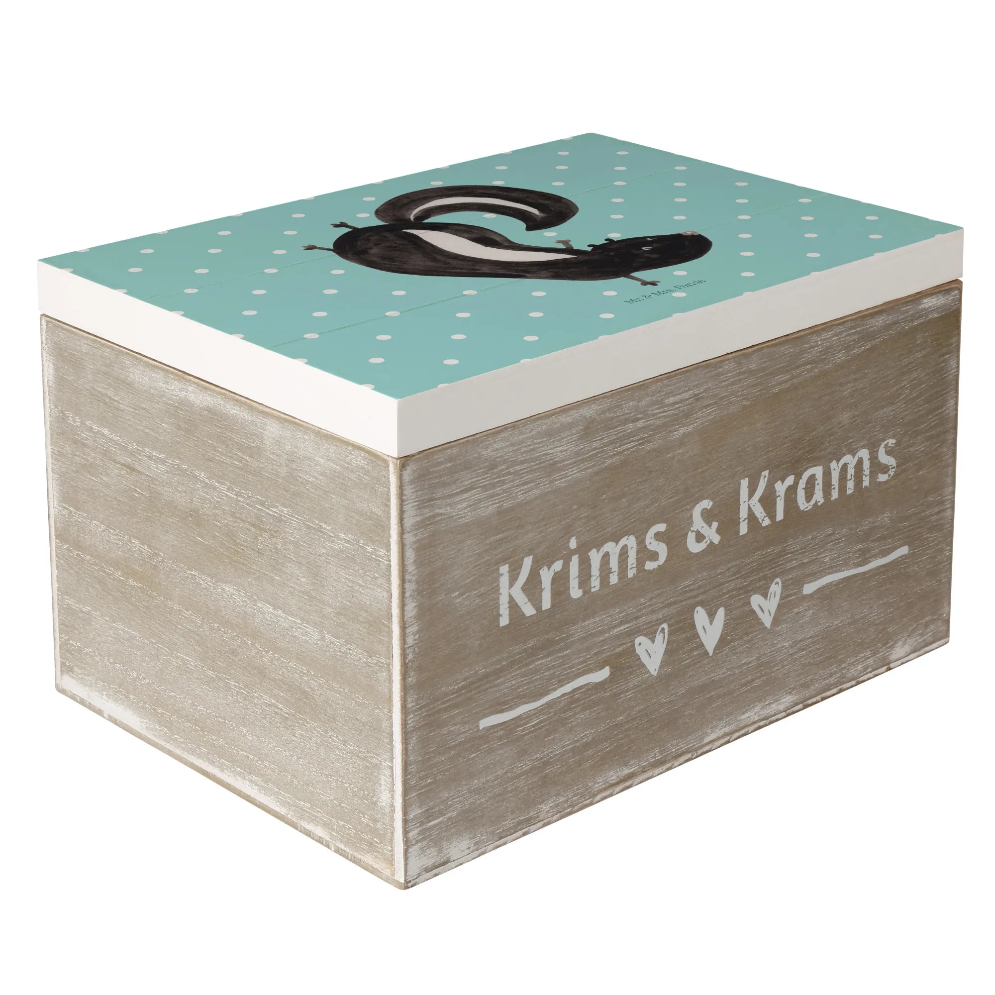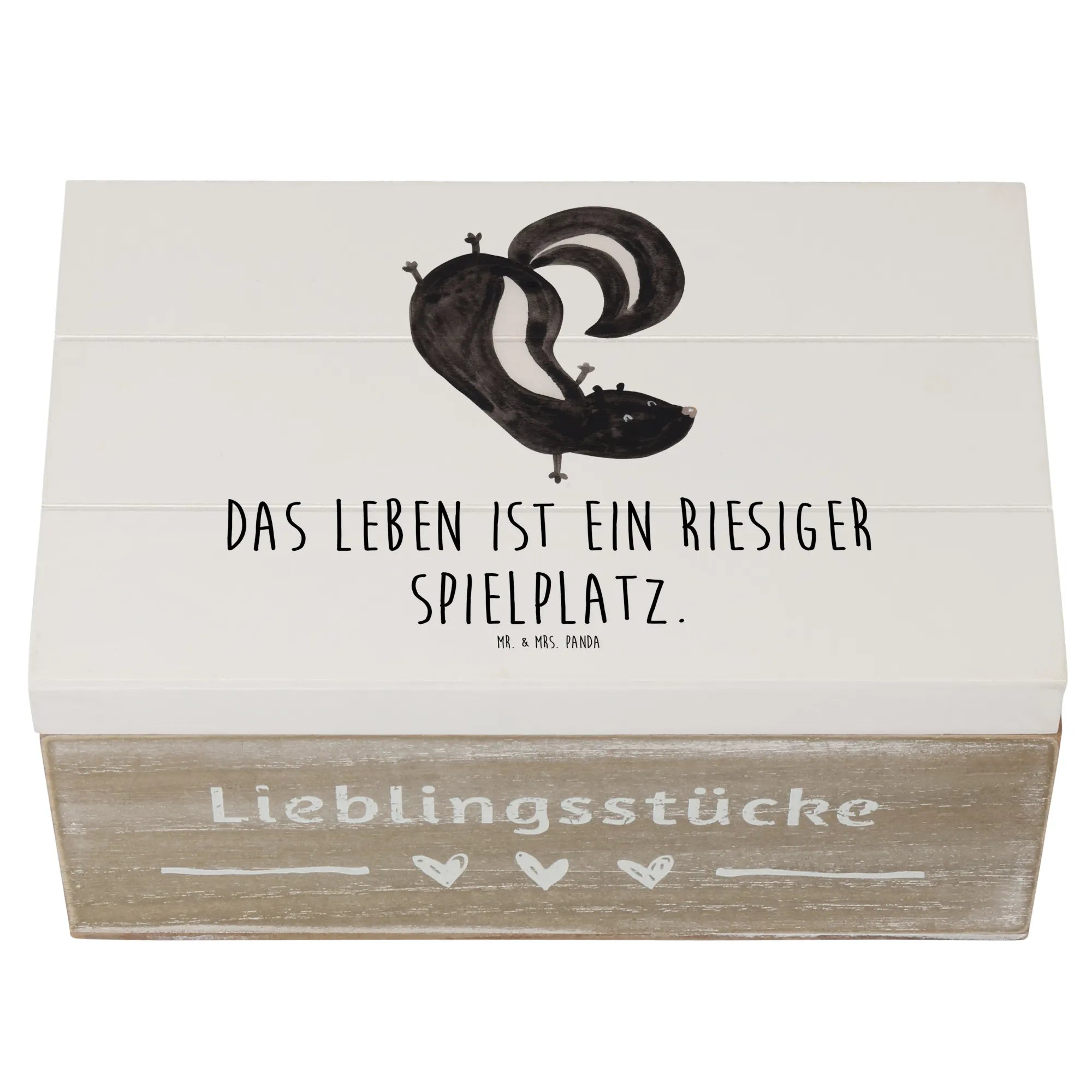Die wunderschöne Holzkiste mit dem einzigartigen Motiv 'Stinktier Handstand' von Mr. & Mrs. Panda ist das perfekte Geschenk für Jung und Alt. Ob als Schatzkiste für die eigenen vier Wände oder als besondere Erinnerungskiste für besondere Anlässe – diese Box ist vielfältig verwendbar.