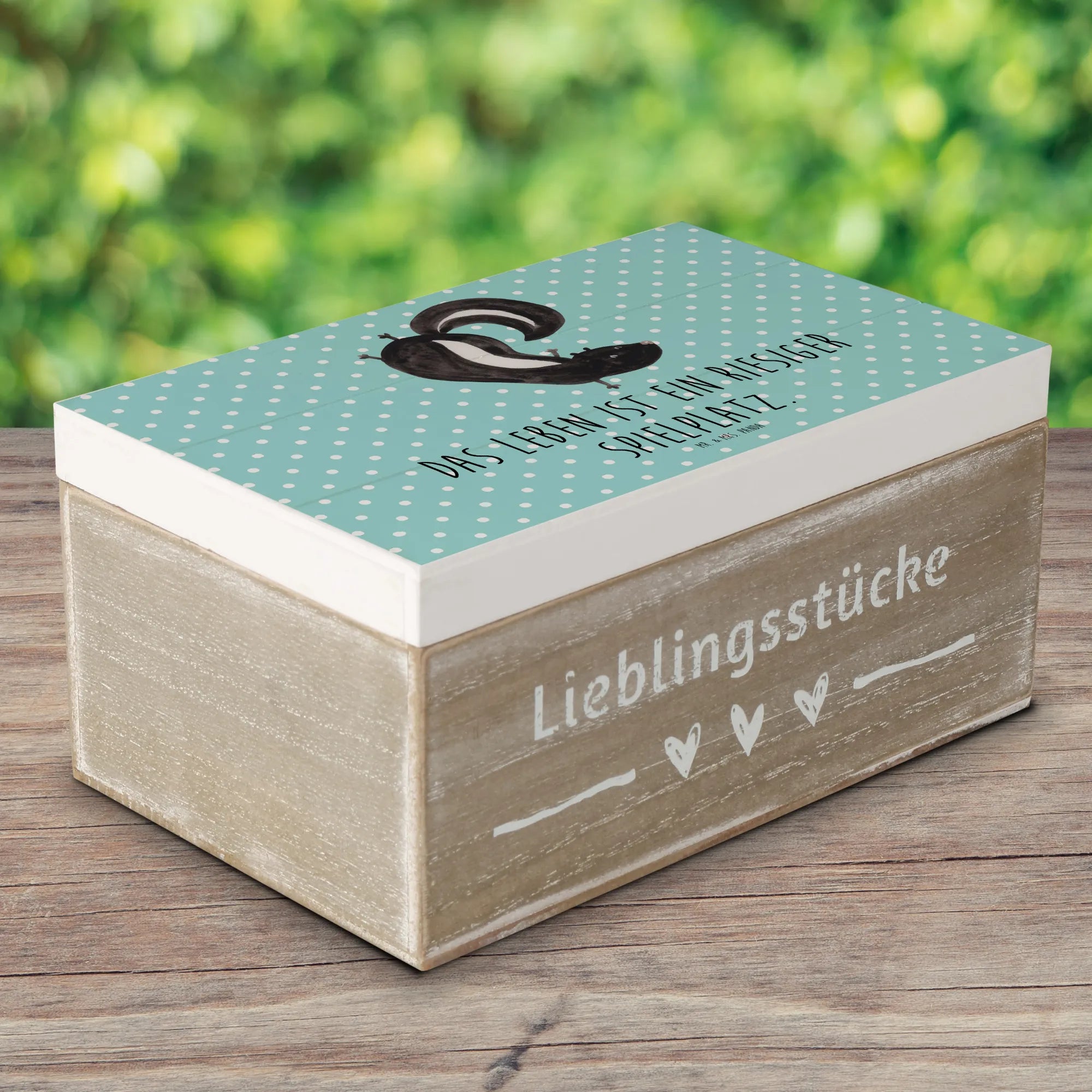 Die wunderschöne Holzkiste von Mr. & Mrs. Panda mit dem süßen Motiv "Stinktier Handstand" ist das perfekte Geschenk für alle Stinktier-Fans und Entdecker. Ob für Kinder oder die junggebliebene Seele in dir, diese Aufbewahrungsbox ist ideal für die Erinnerungen, die dein Herz höher schlagen lassen. Mit dem Slogan "Das Leben ist ein riesiger Spielplatz" erinnert sie jeden Tag daran, das Leben mit allen Sinnen zu genießen.