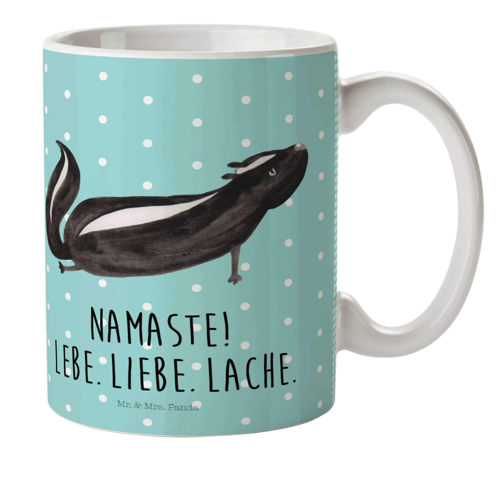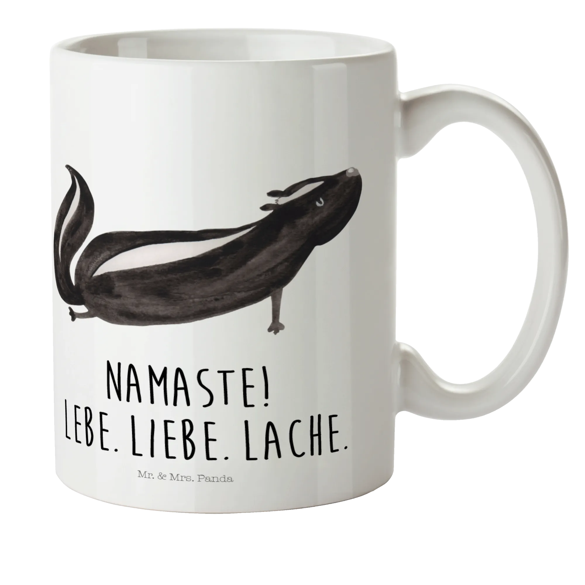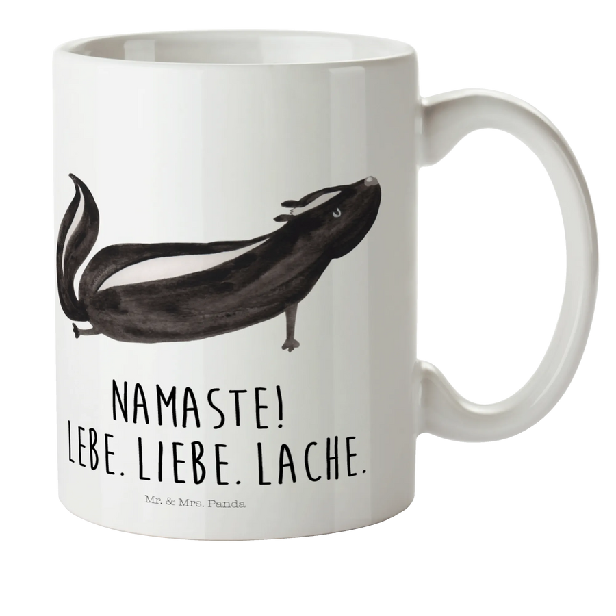 Mit einem brillanten Aufdruck eines süßen stinkenden Freundes in Aquarellstil und dem fröhlichen Spruch "Namaste! Lebe. Liebe. Lache." bringt diese Tasse Freude in den Alltag. Die Tasse hat eine Füllmenge von 300 ml und ist leicht, sodass sie perfekt für kleine Kinderhände geeignet ist.